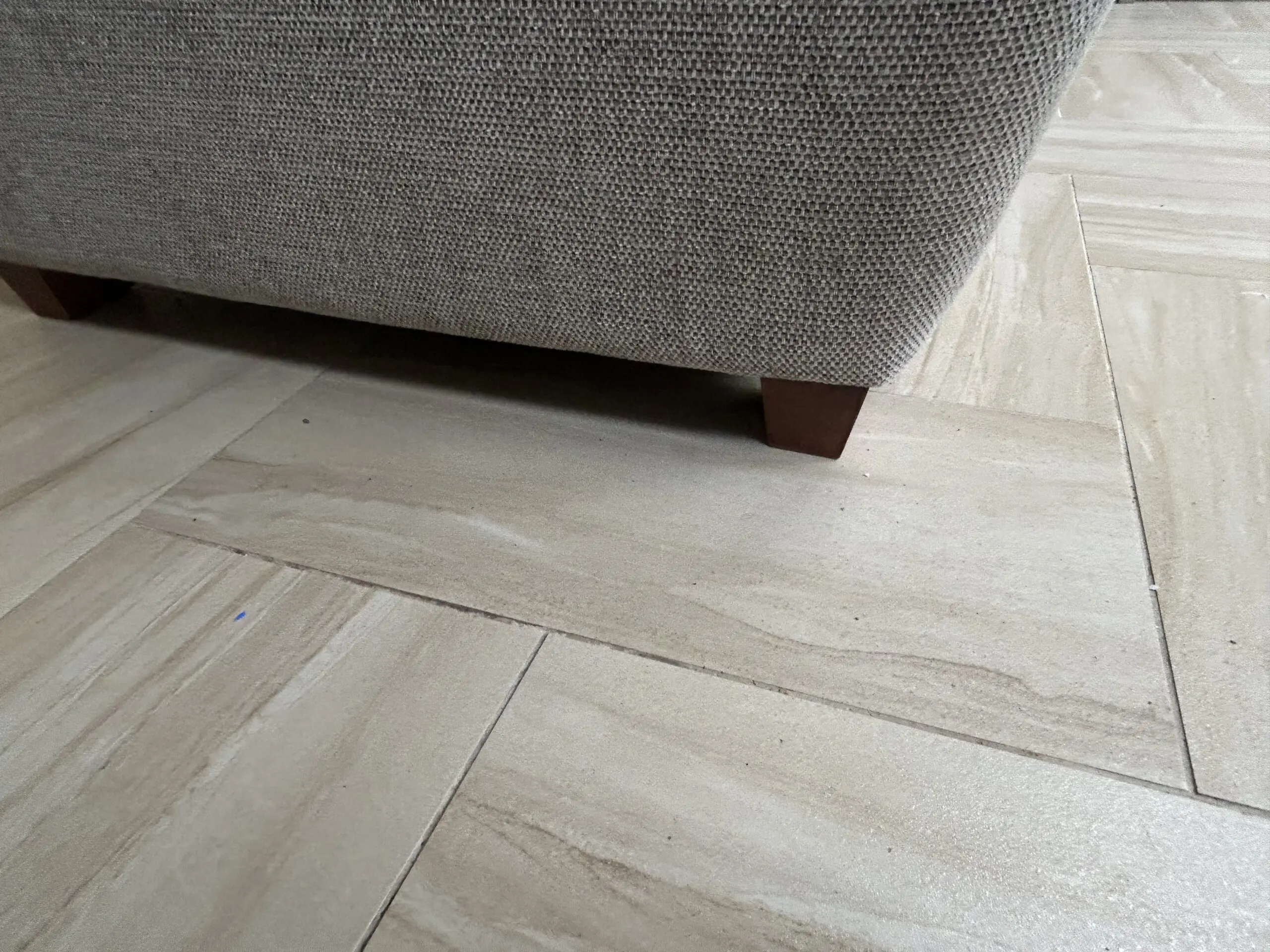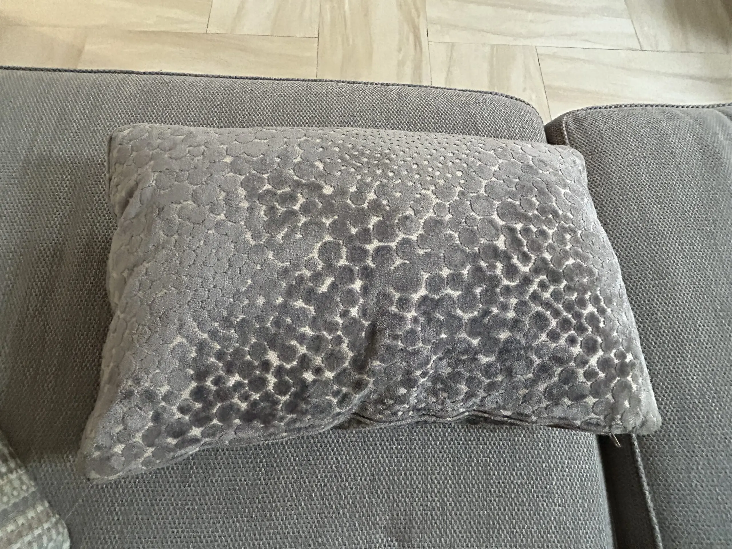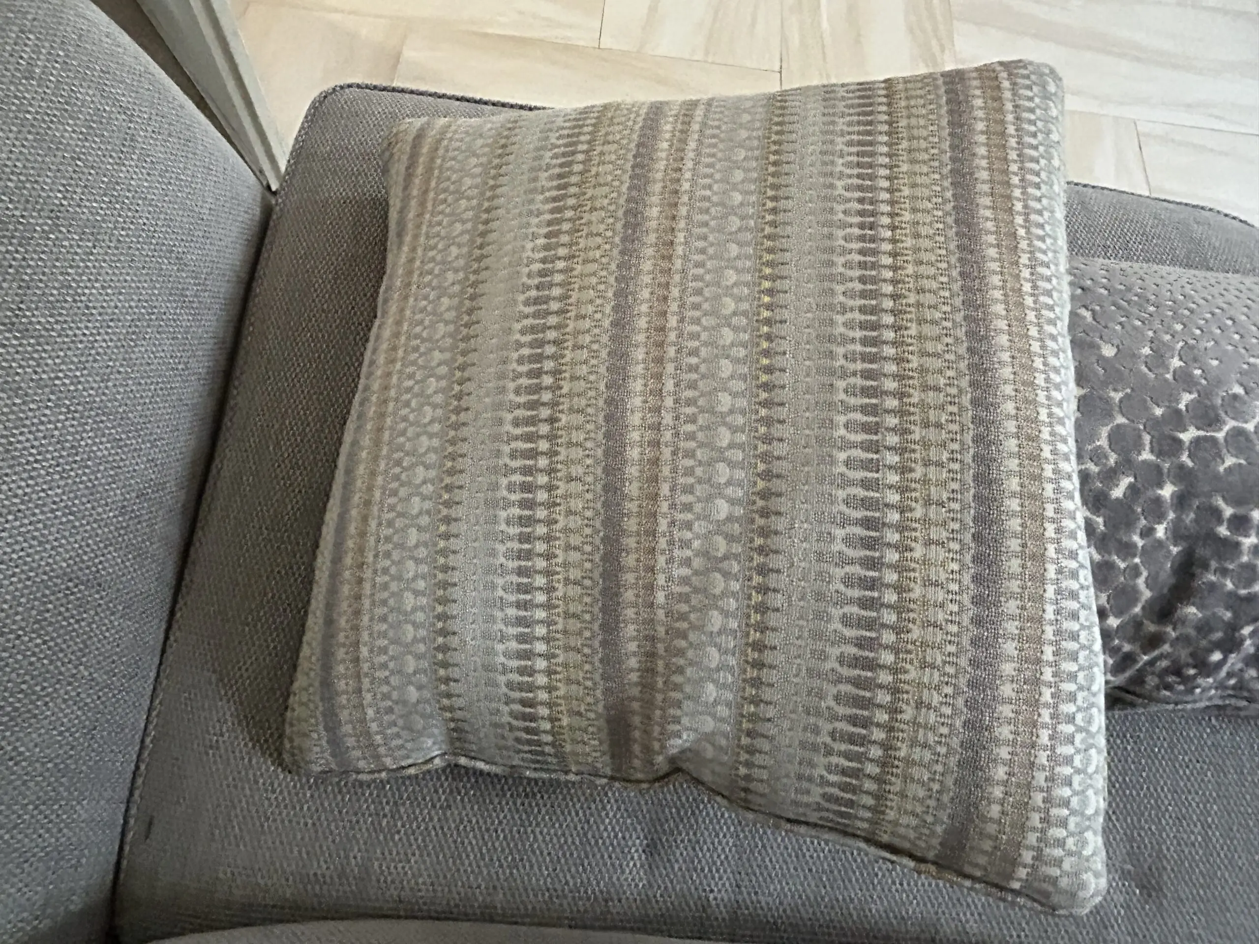 Mottled grey, (and white) gently textured, easy to team up with colours in the room, 3 seater sofas (2), chic design, very comfortable and durable. Covers can be removed to be cleaned. Wooden feet discrete and stylish. Scatter cushions are available too if wanted.