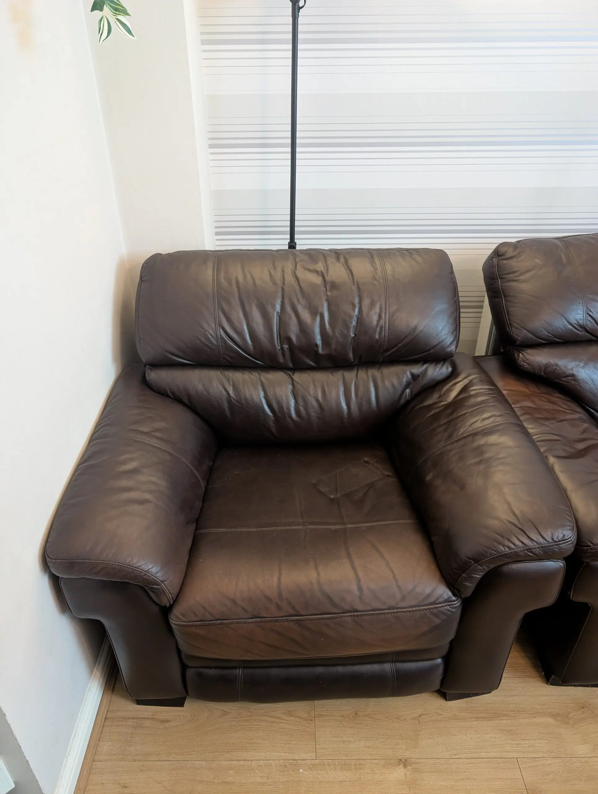 Stylish brown leather sofa set including a comfortable three seater and matching armchair. Both pieces are in good condition from a smoke free home with normal light wear consistent with use. Selling as a set. Ideal for anyone looking for a comfortable and timeless seating option at a great price,