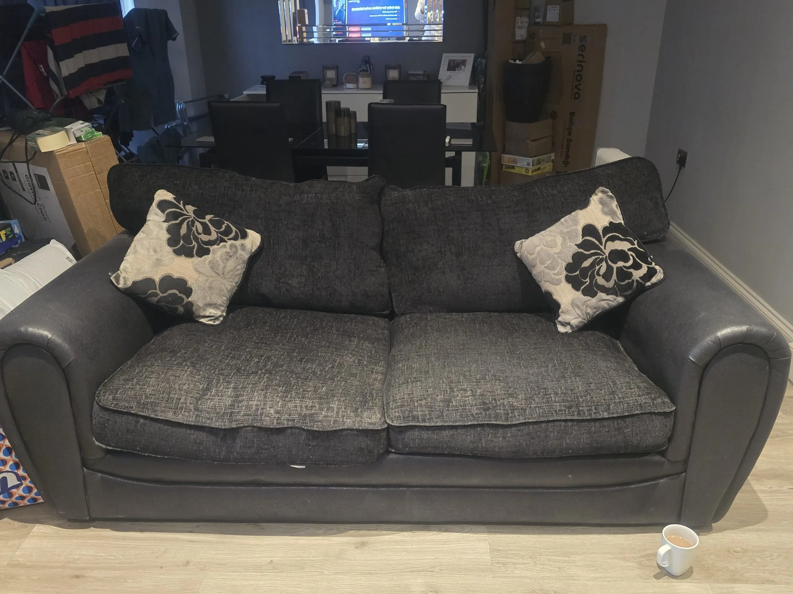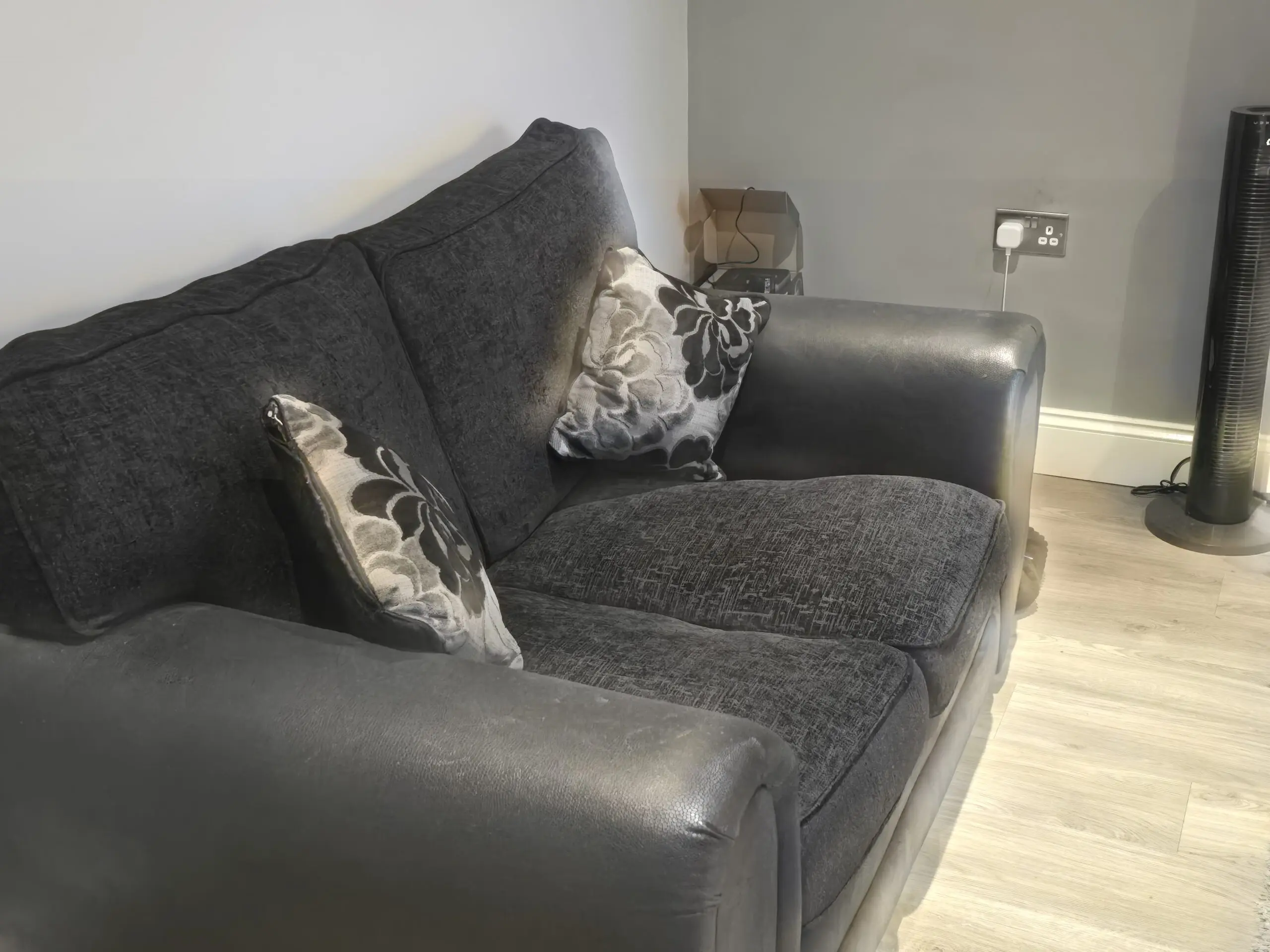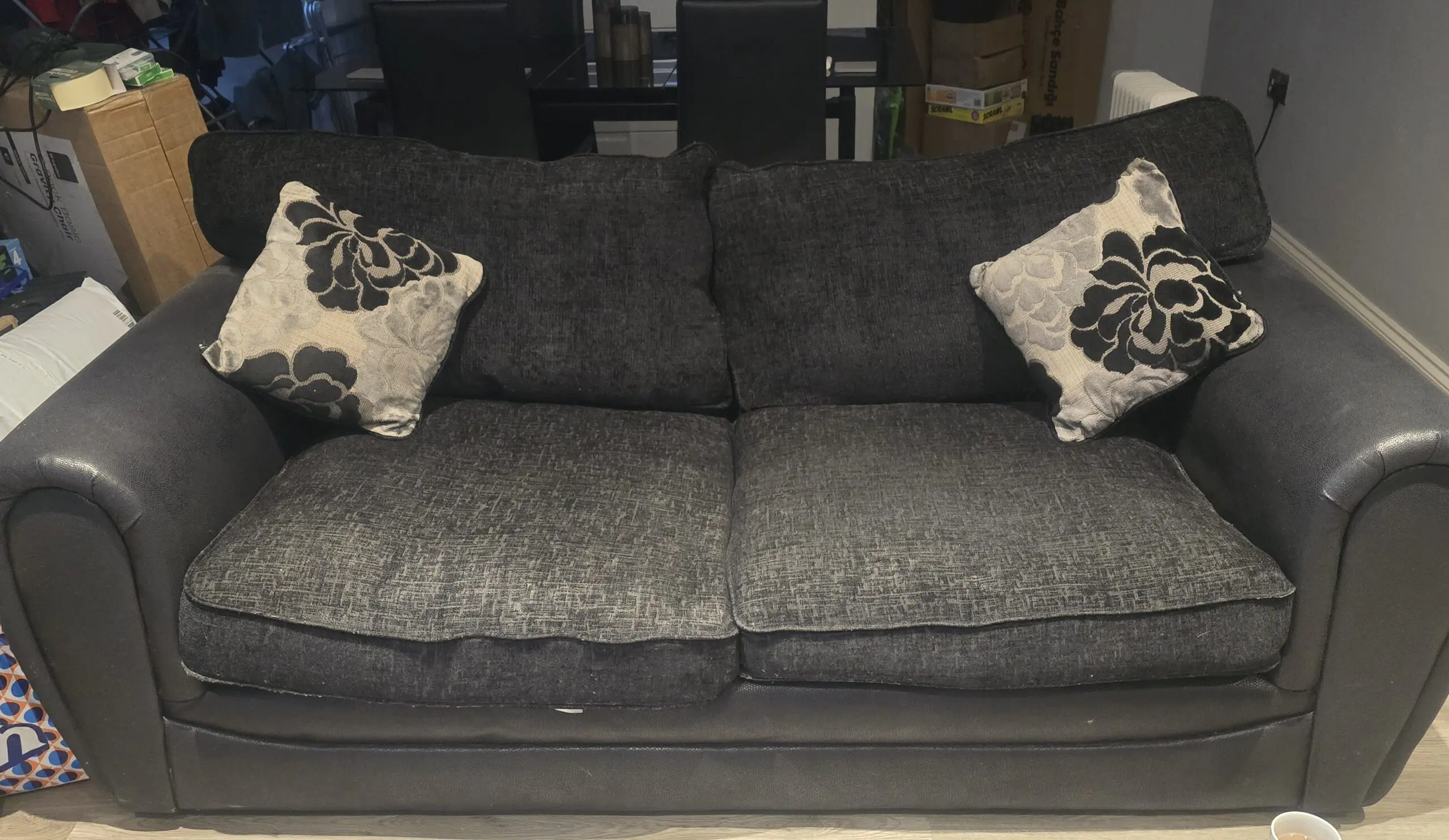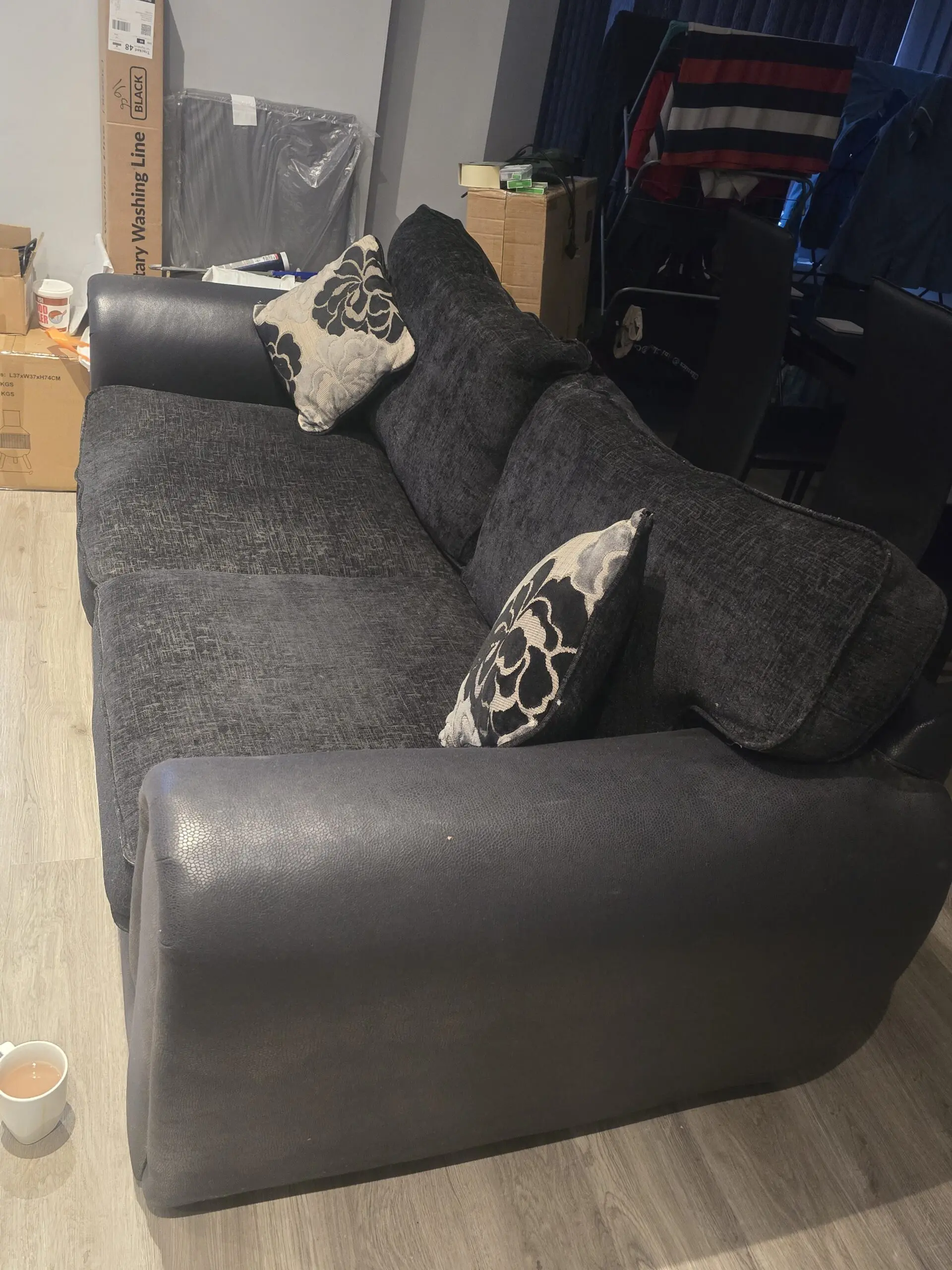 This 3-seater and 2-seater sofa set with matching cushions is perfect for adult use in a living room. The black contemporary/modern design with a medium firmness level offers comfort and style. The modern back style, along with the wood frame and 100% polyester upholstery fabric, ensures durability and longevity. With no assembly required , this sofa set is a hassle-free and quality addition to any home. Easy to care for with upholstery shampoo, this set is both practical and aesthetically pleasing. 2 seater hardly been used. 3 seater has been used but in good condition.
