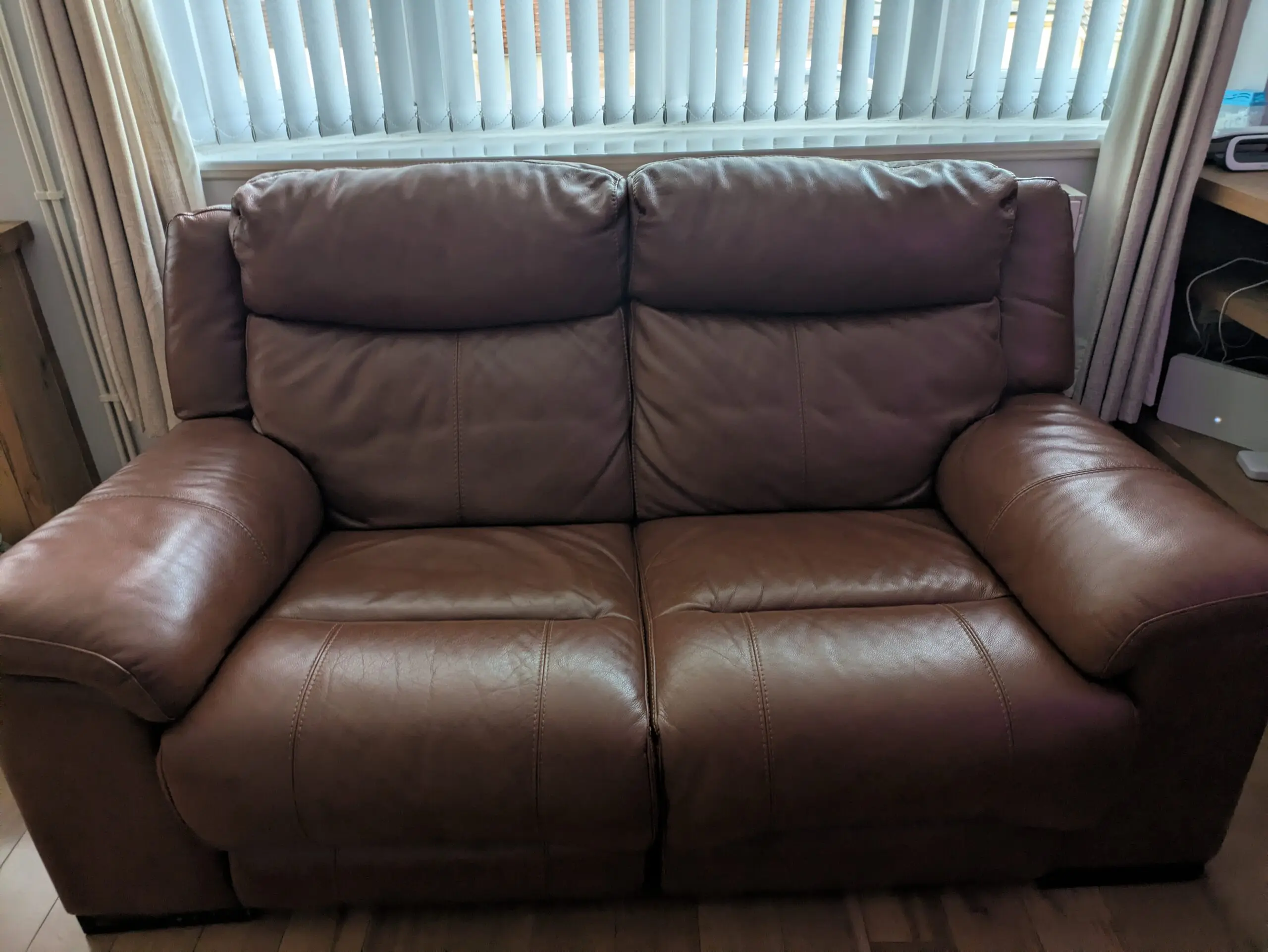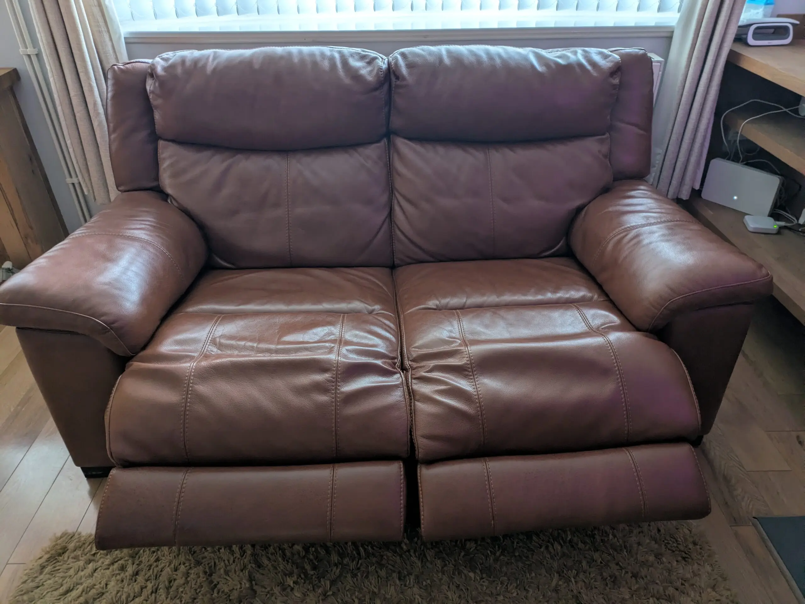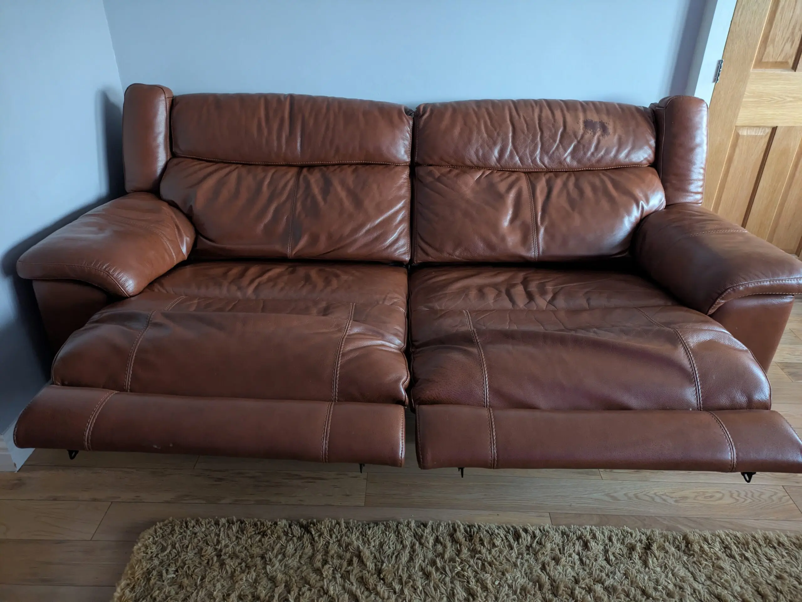 DFS 3 seater and 2 seater tan real leather sofas .. 3 seater is electric recline with usb charging ports 2 seater is manual recline