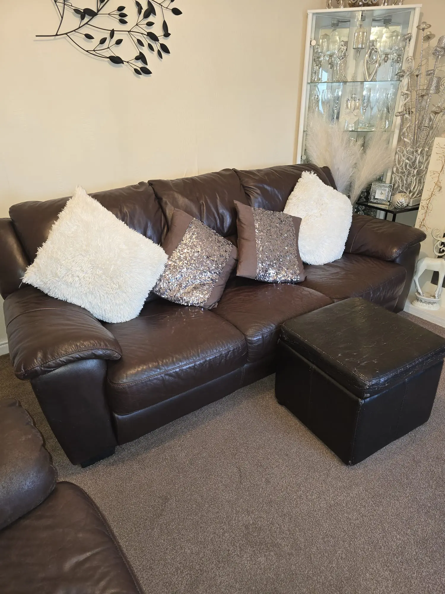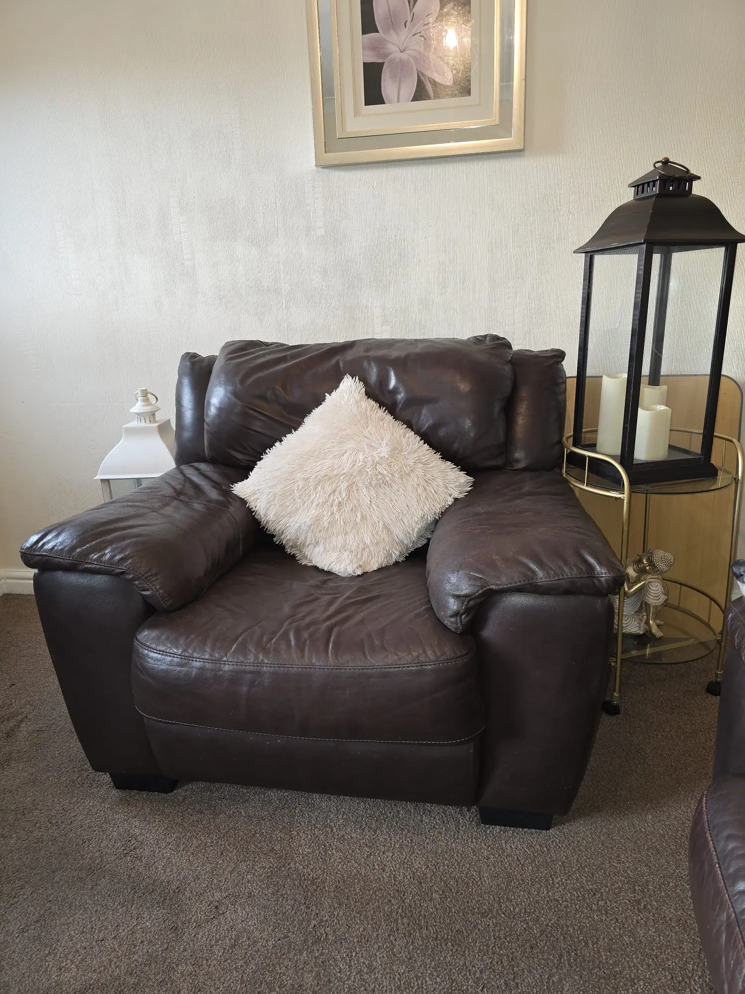 chocolate brown leather sofa and chair, signs of use, no rips or tears