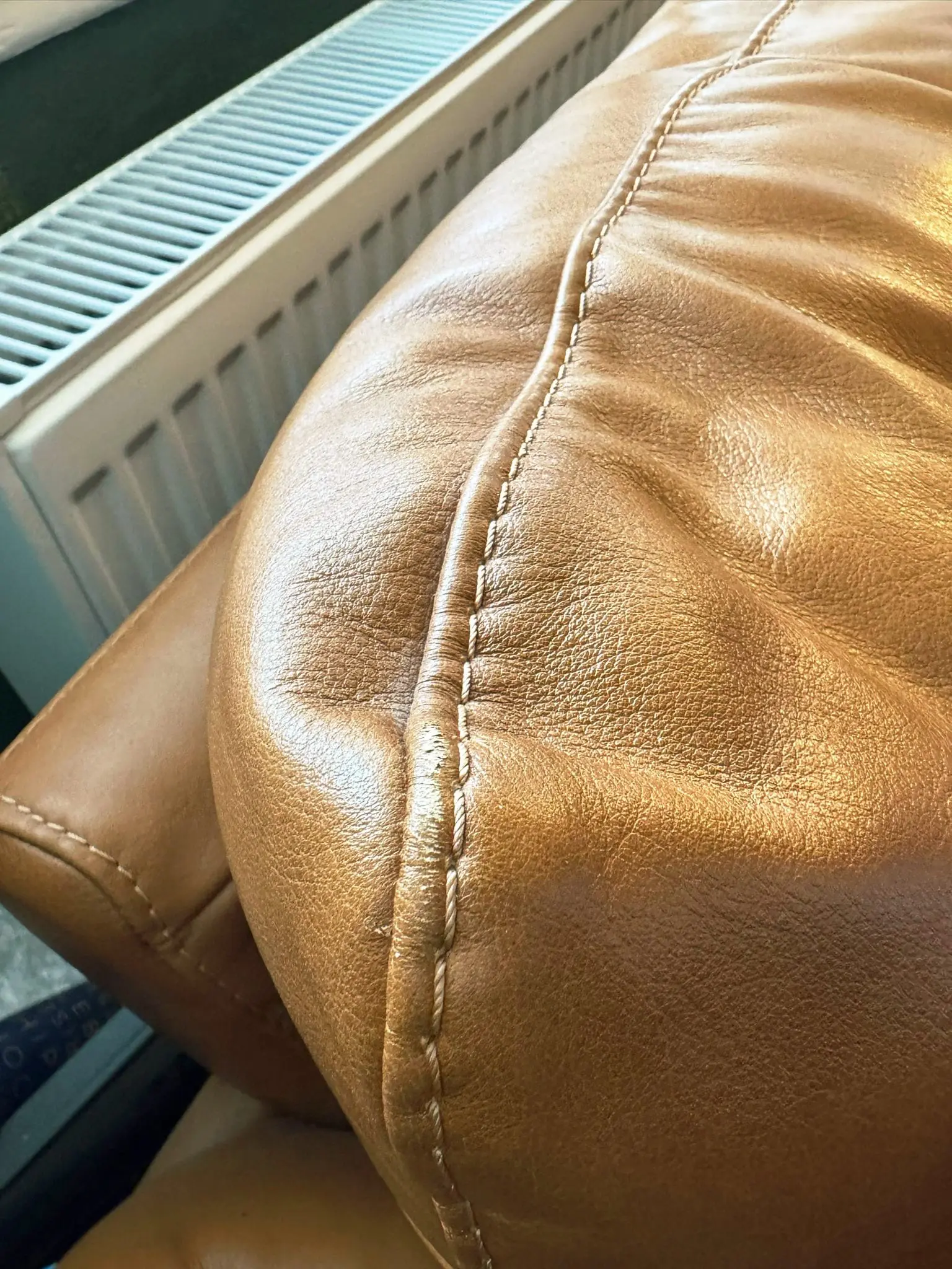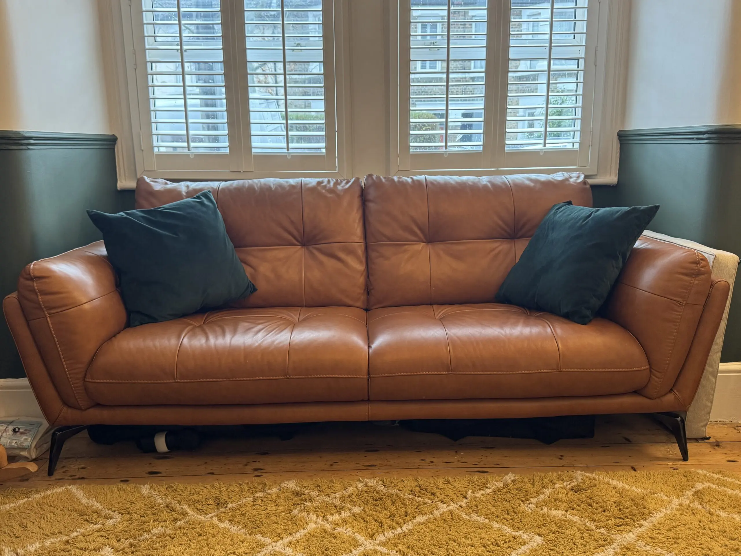 Slight fabric scuff on top left behind the cushion which came from opening the shutters behind the couch, it’s a very small scuff and can be barely seen.