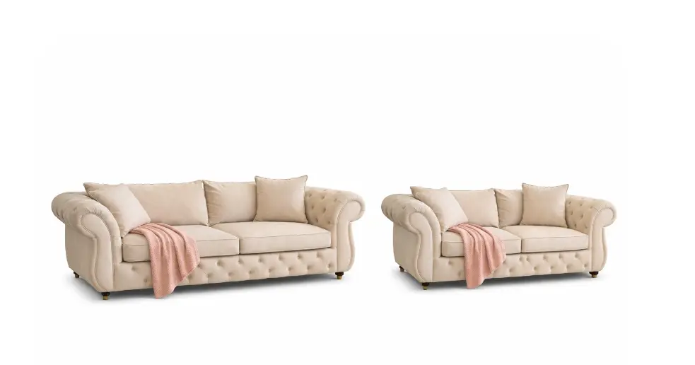 For sale is a stunning Chesterfield Rio Grande sofa set, consisting of a spacious 4-seater and a matching 3-seater, complete with extra scatter cushions. These sofas feature the classic Chesterfield design with deep button tufting, elegant rolled arms, and a timeless silhouette that adds sophistication to any living space.