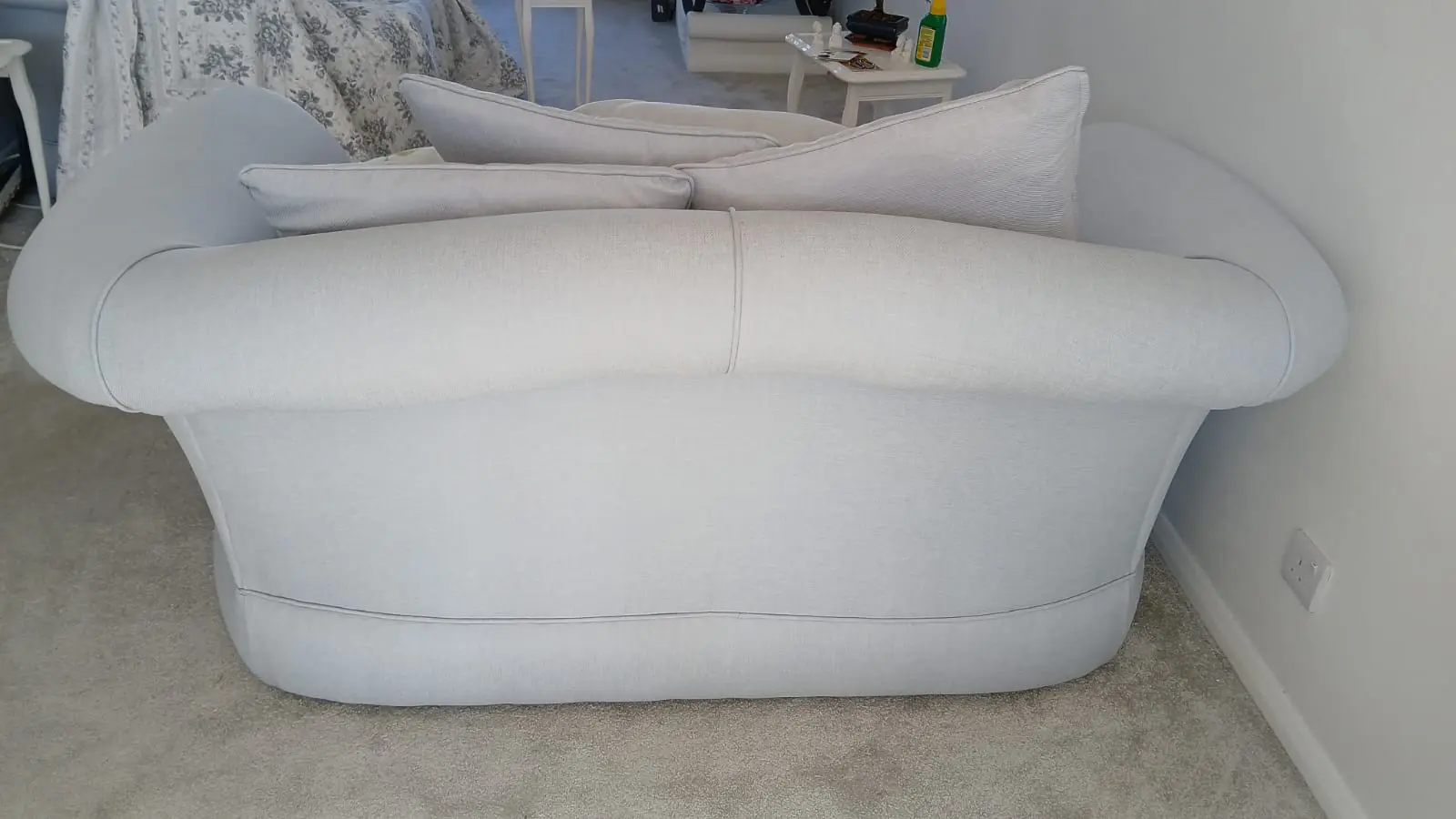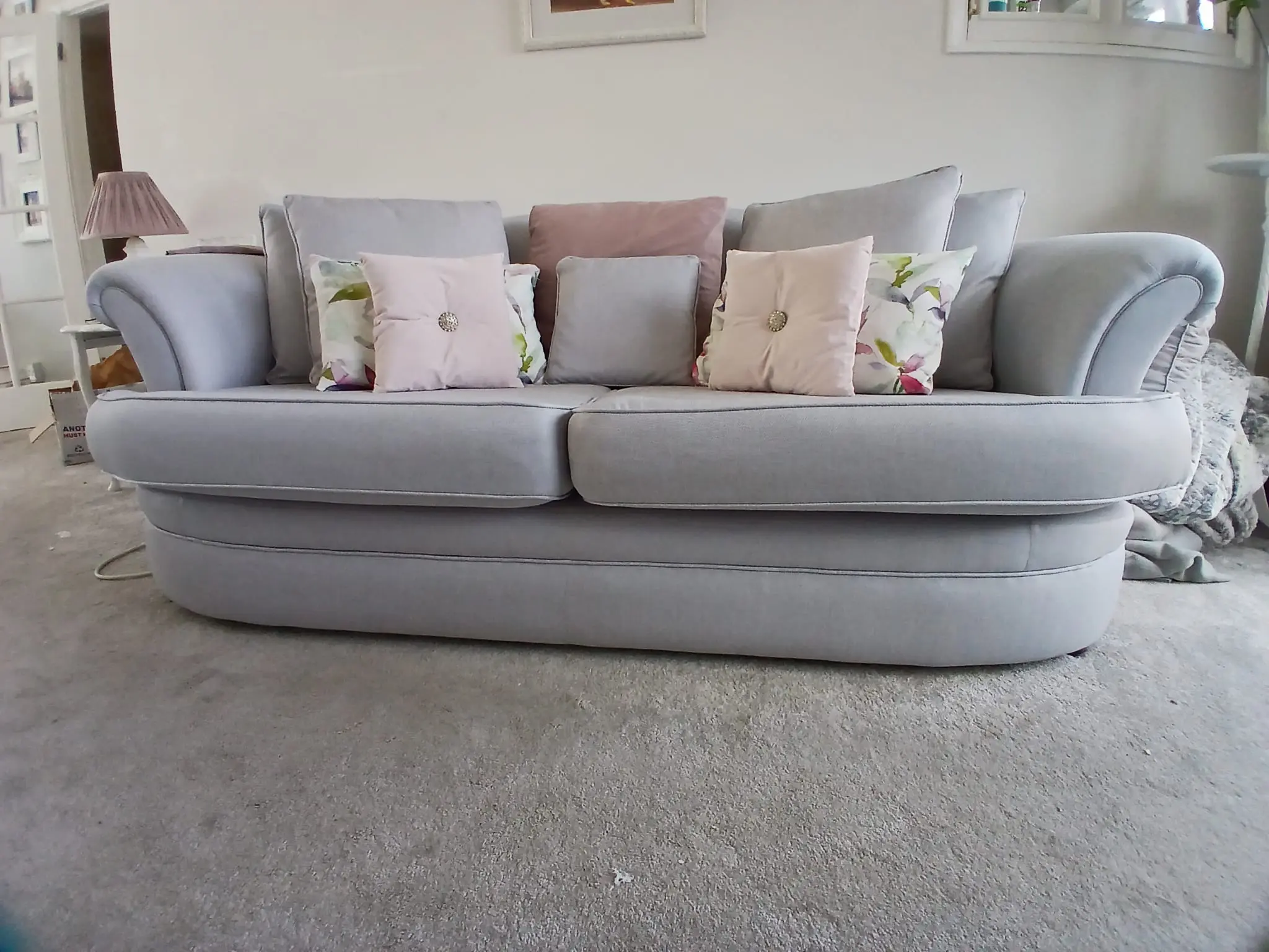 I am reluctantly having to sell my 2 beautiful sofas they are in good condition, very sturdy and supporting just under 4 years old, there is a slight stain on the underside of one of the cushions, but isn’t on show, and a few other minor marks The only reason for me selling them is that now I need to have recliner/electric chair that can being me up to standing position. my sofas are really lovely !! The blue cushions are 7 large and 4 smaller and includes the 2 small pale pink square cushions with diamante button