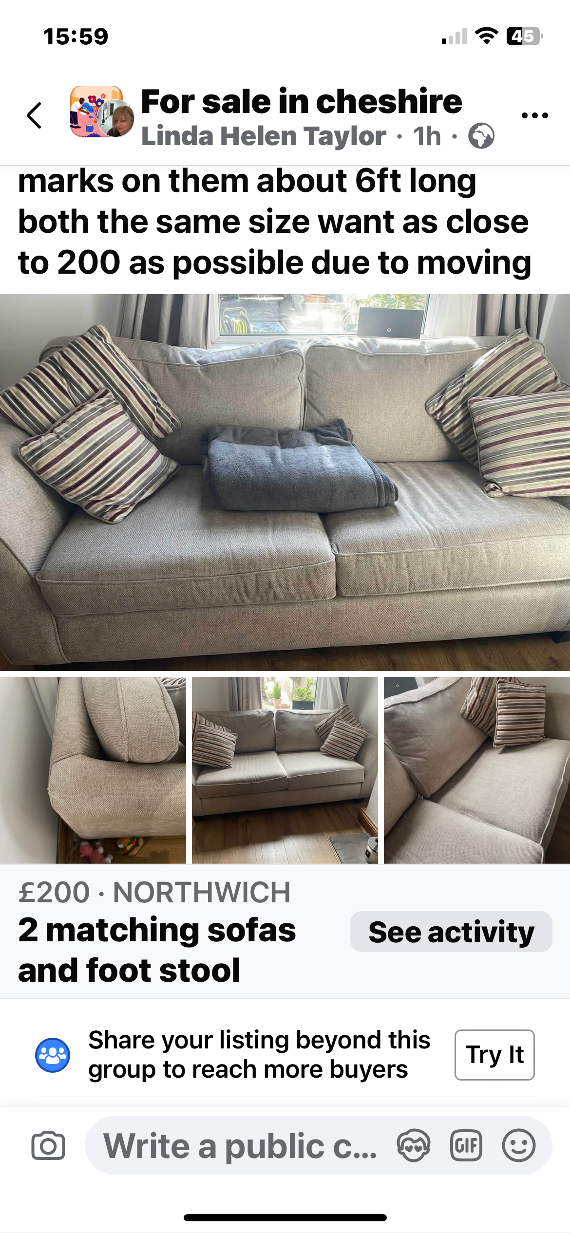 Excellent condition a set of 2 sofas been kept clean very comfy there is also a footstool available with it