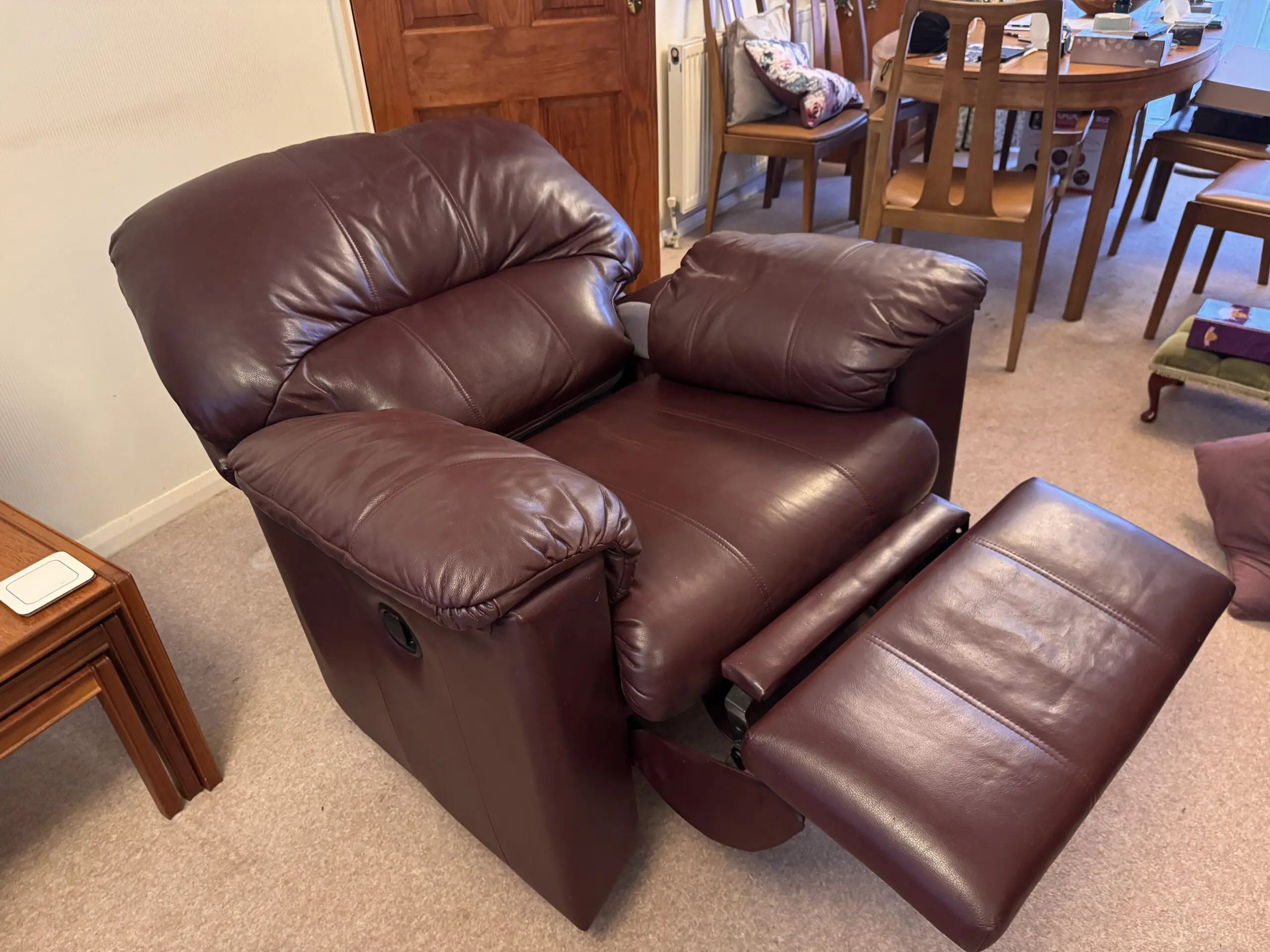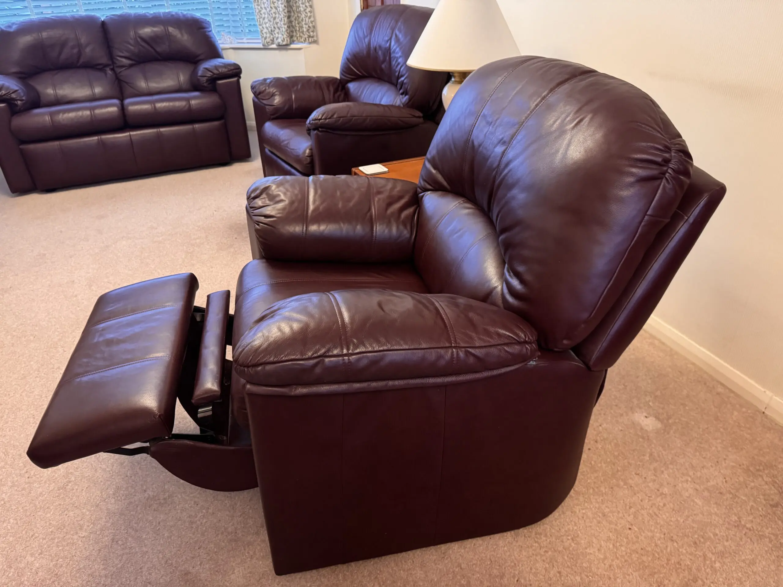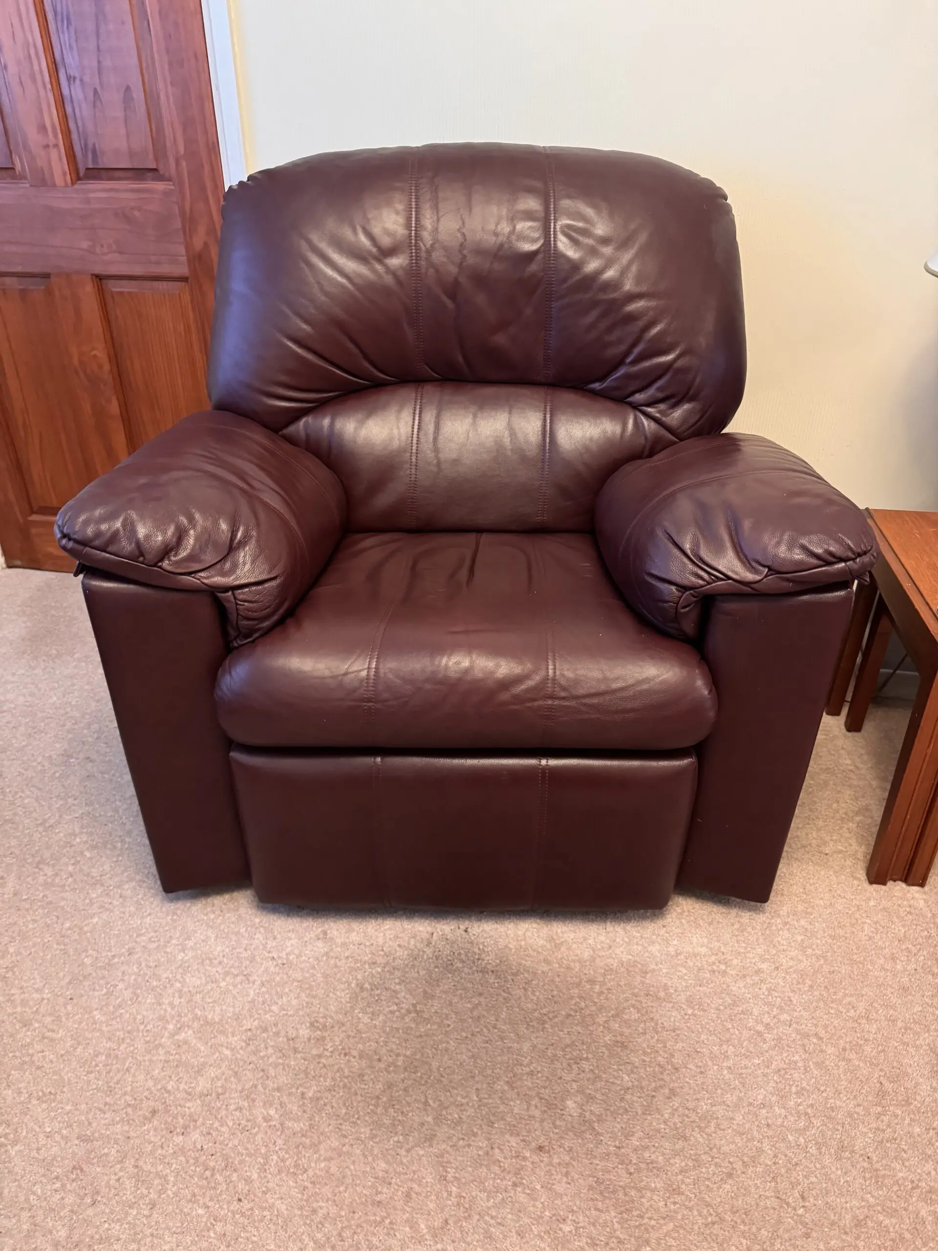 Burgundy Leather Sofa set in very good condition. One two seater sofa, hardly used with two very comfortable armchairs. One armchair is a manual recliner.