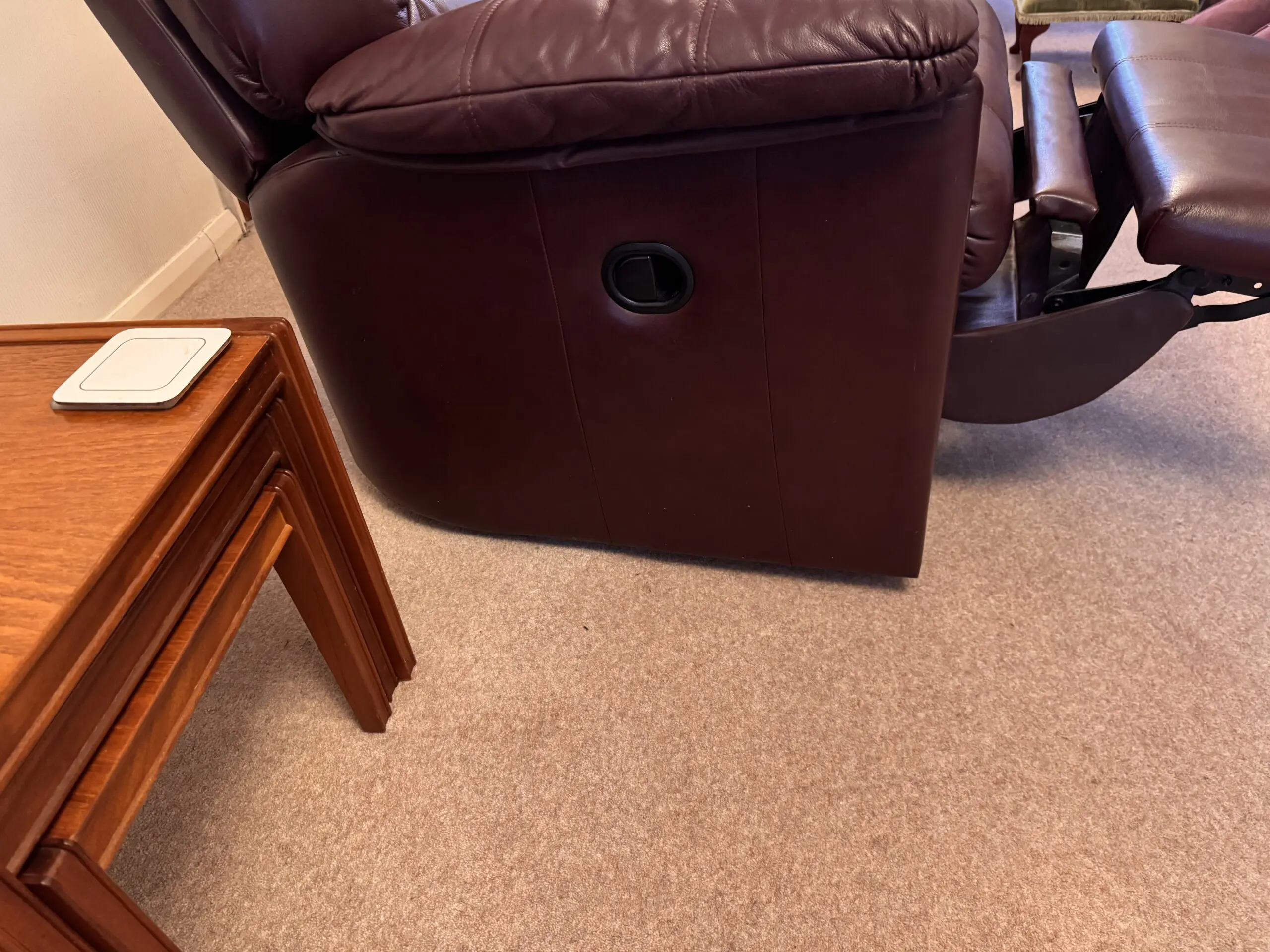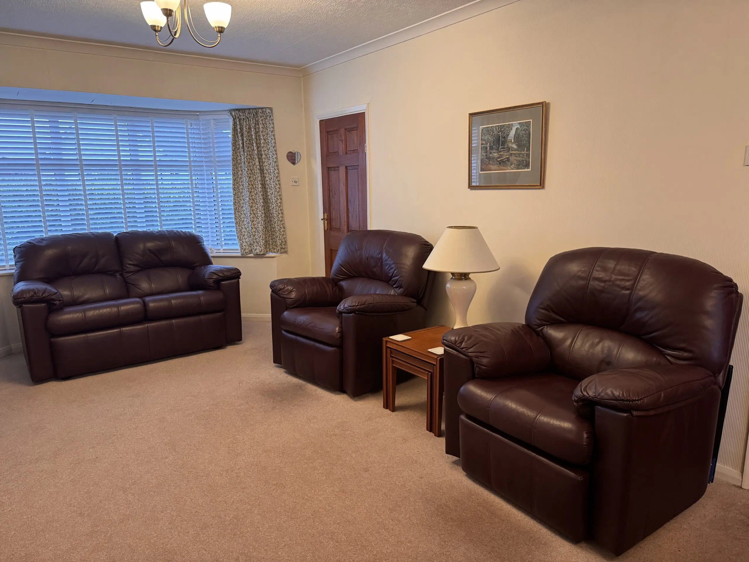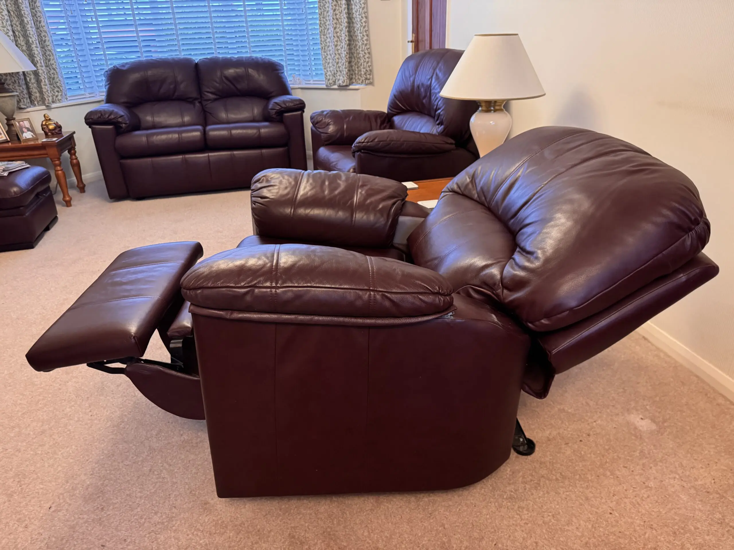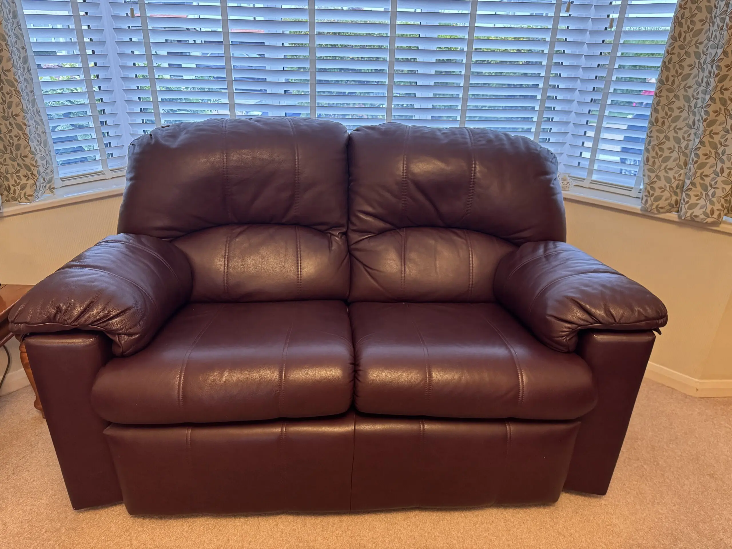 Burgundy Leather Sofa set in very good condition. One two seater sofa, hardly used with two very comfortable armchairs. One armchair is a manual recliner.