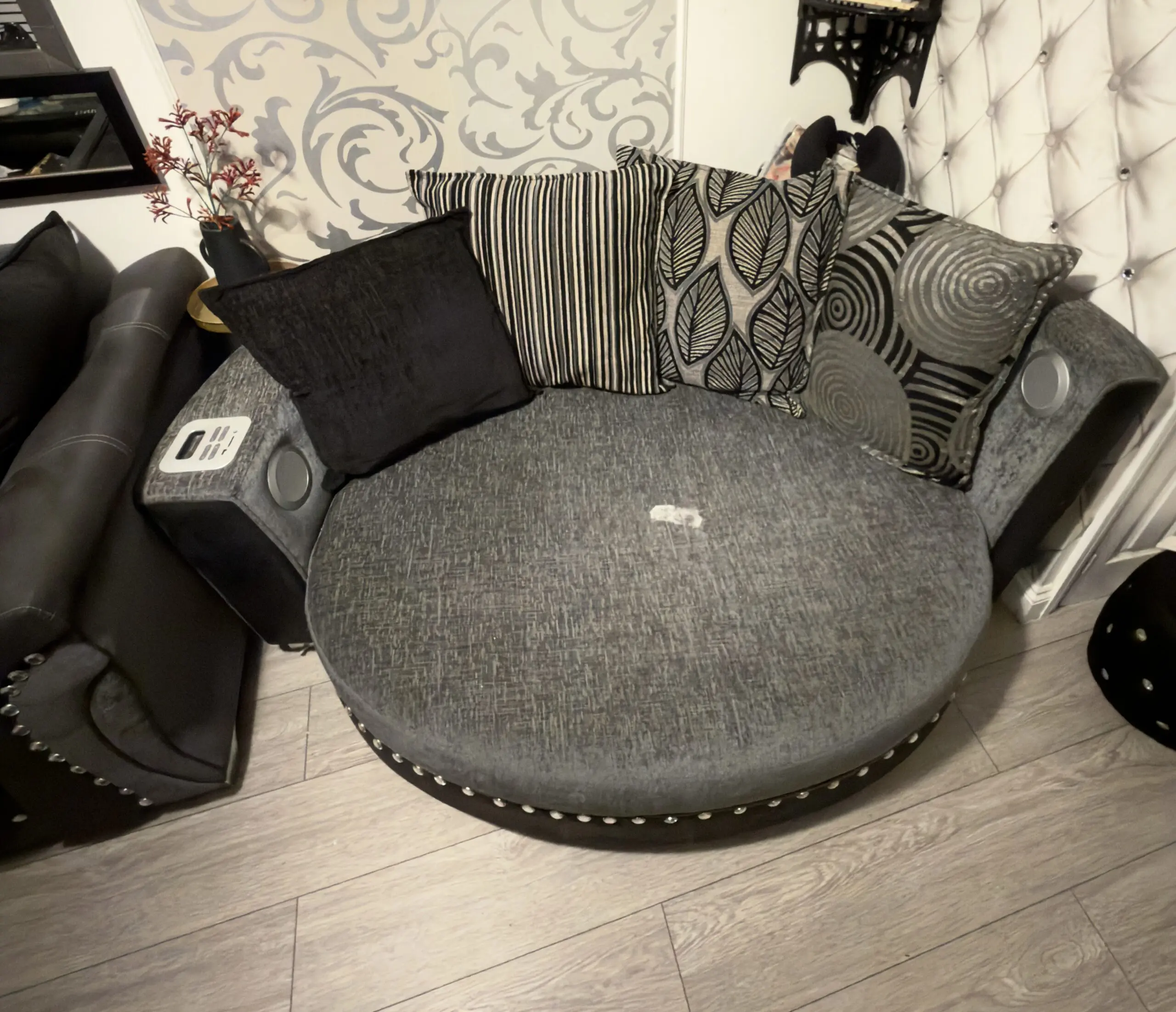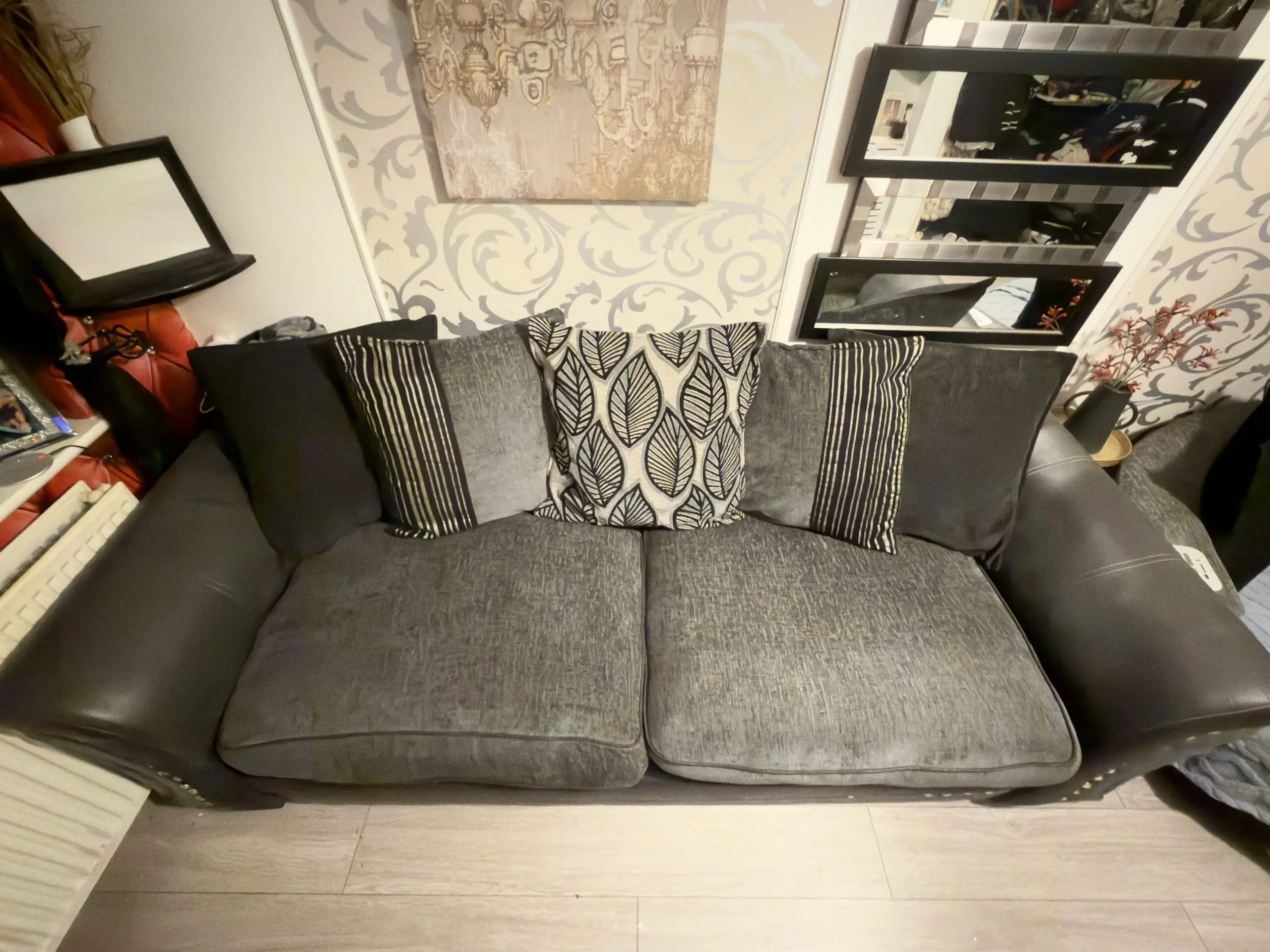 Sofa set good condition, just the cuddle sofa has 1 stain shown on picture, other wise both sofa’s in good condition.