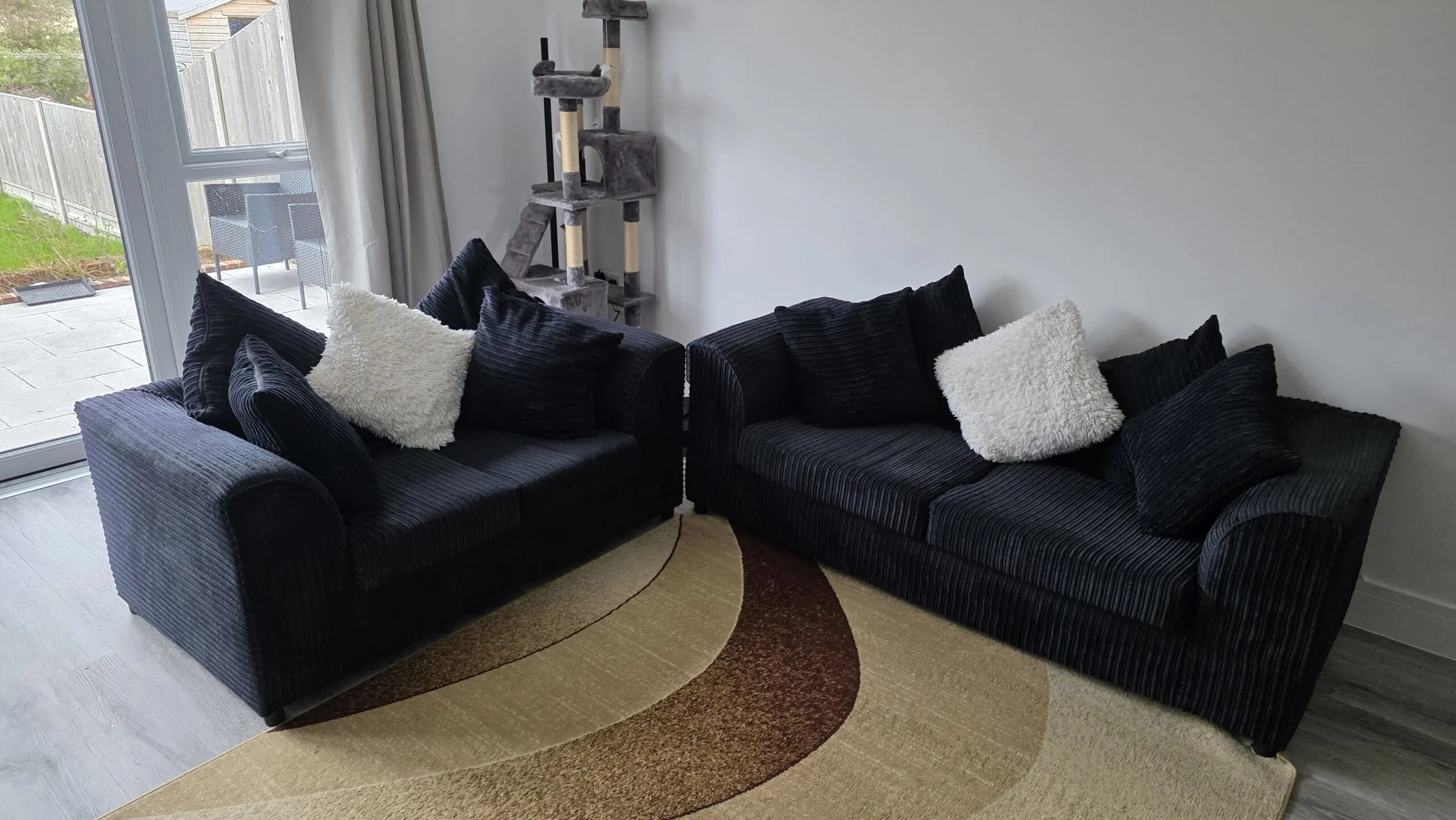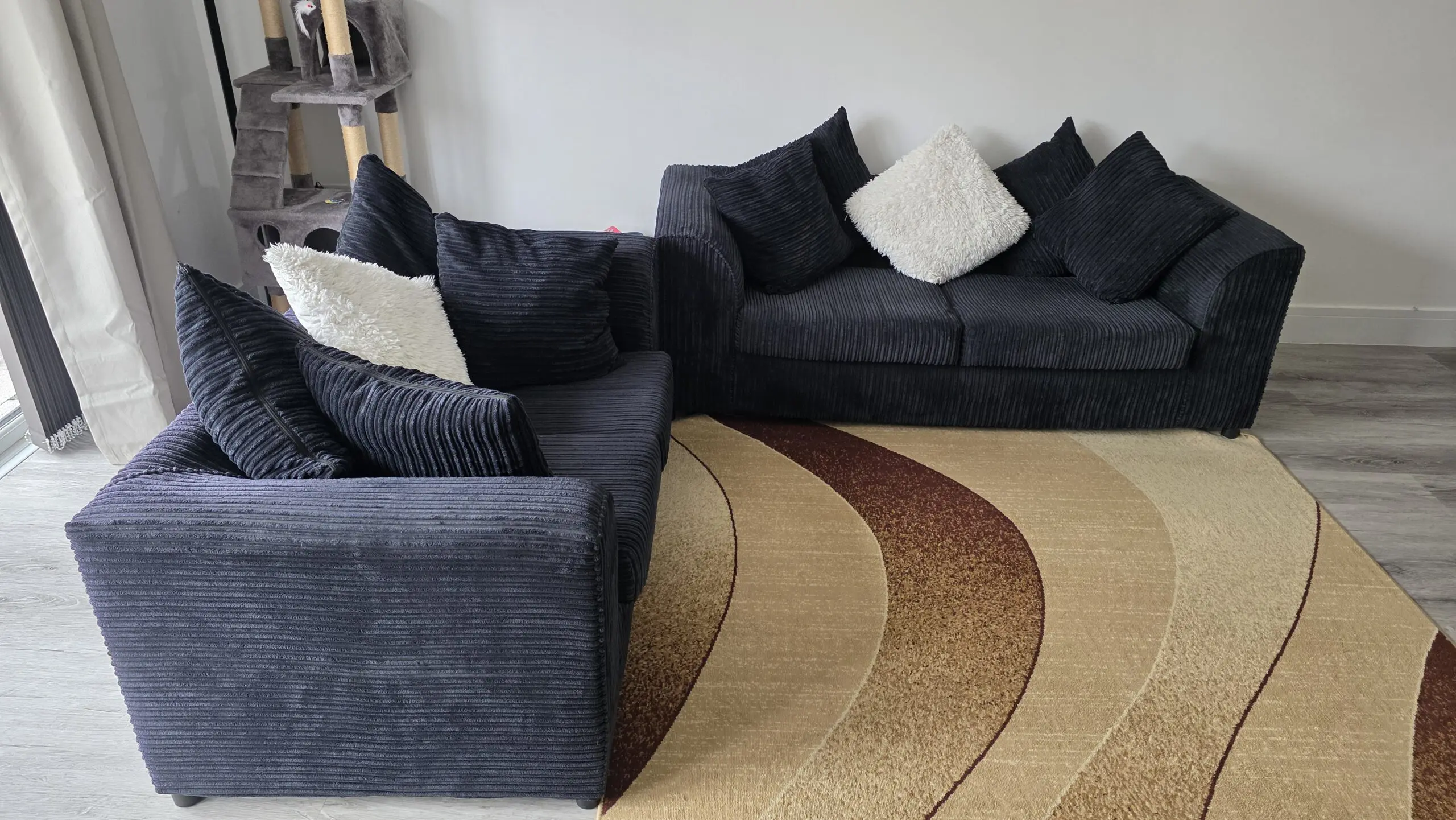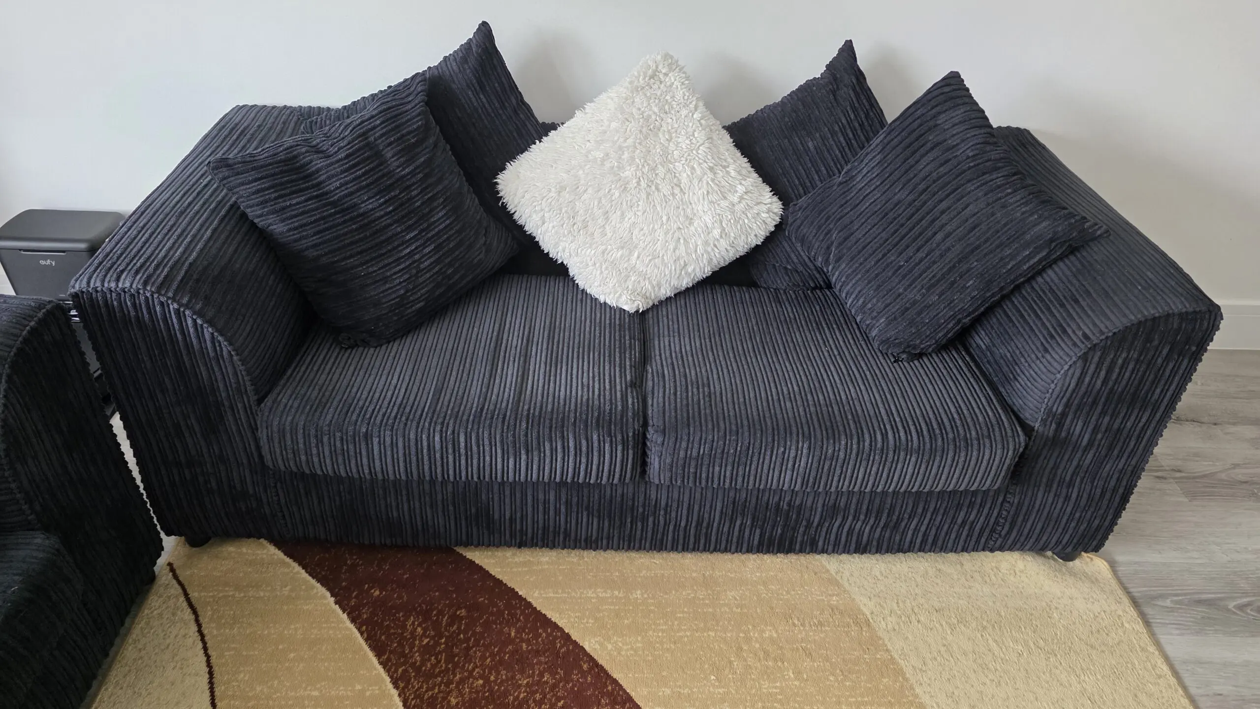 3-seater and 2-seater sofa set upholstered in dark charcoal corduroy fabric. Both sofas feature rounded arms, deep seats, and plush back cushions in the same ribbed material, offering a soft, comfortable feel with a modern look.