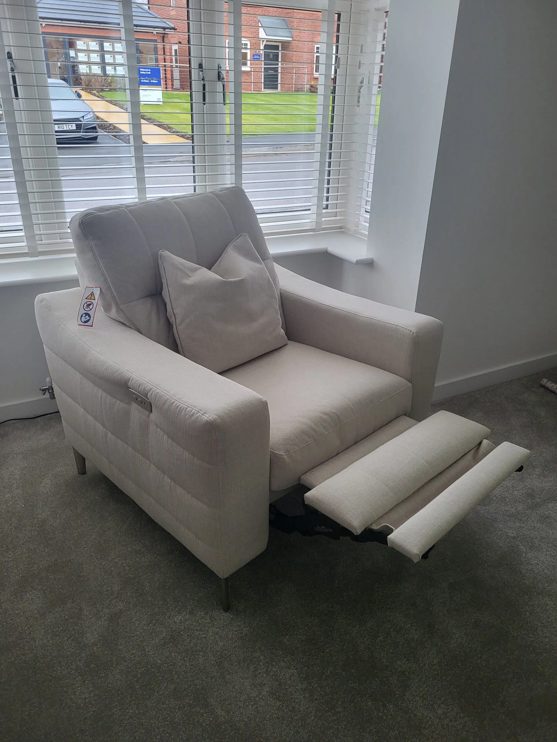 The 3 seater and the chair are power recliners and the 2 seater is standard. It’s a beautiful light beige which suits any decor.