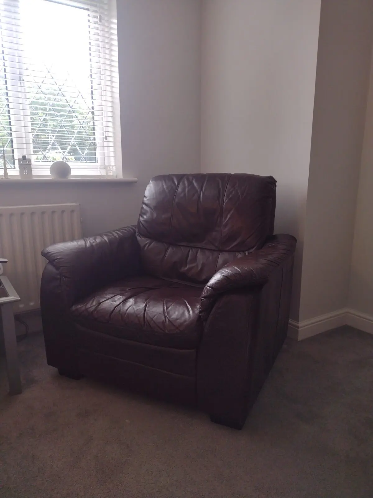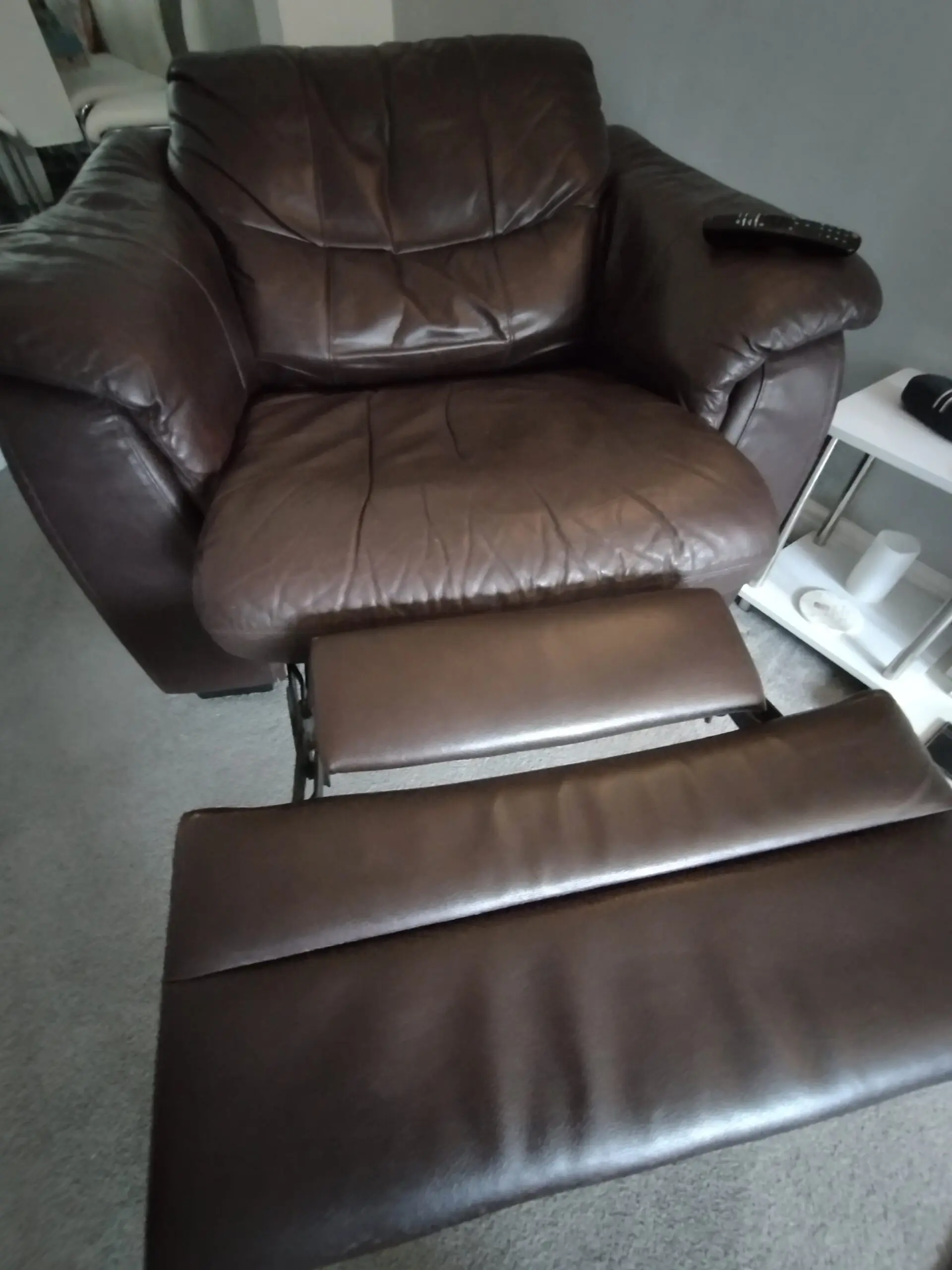 Brown leather 3 piece suite with 2 recliner chairs 1 electric and 1 manual