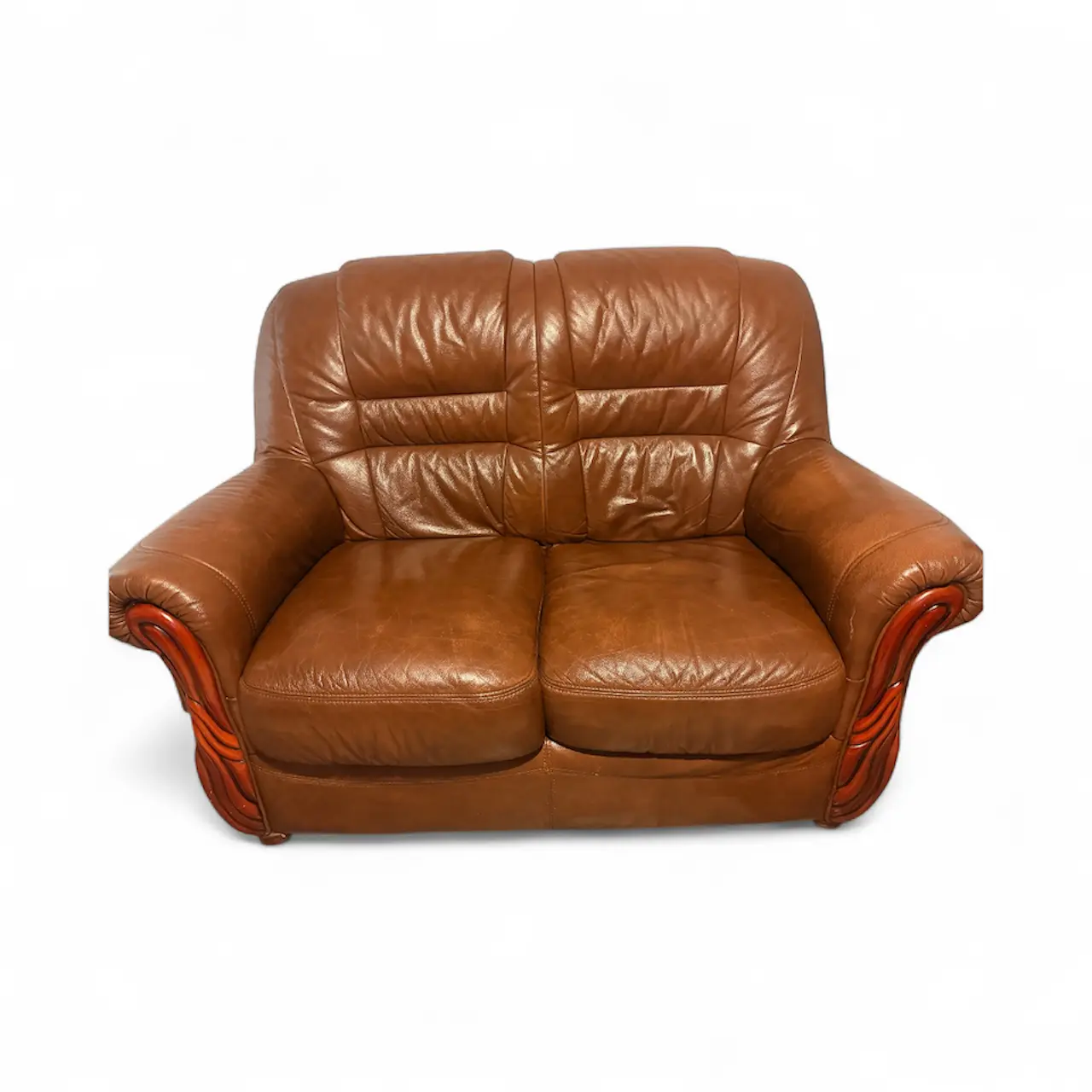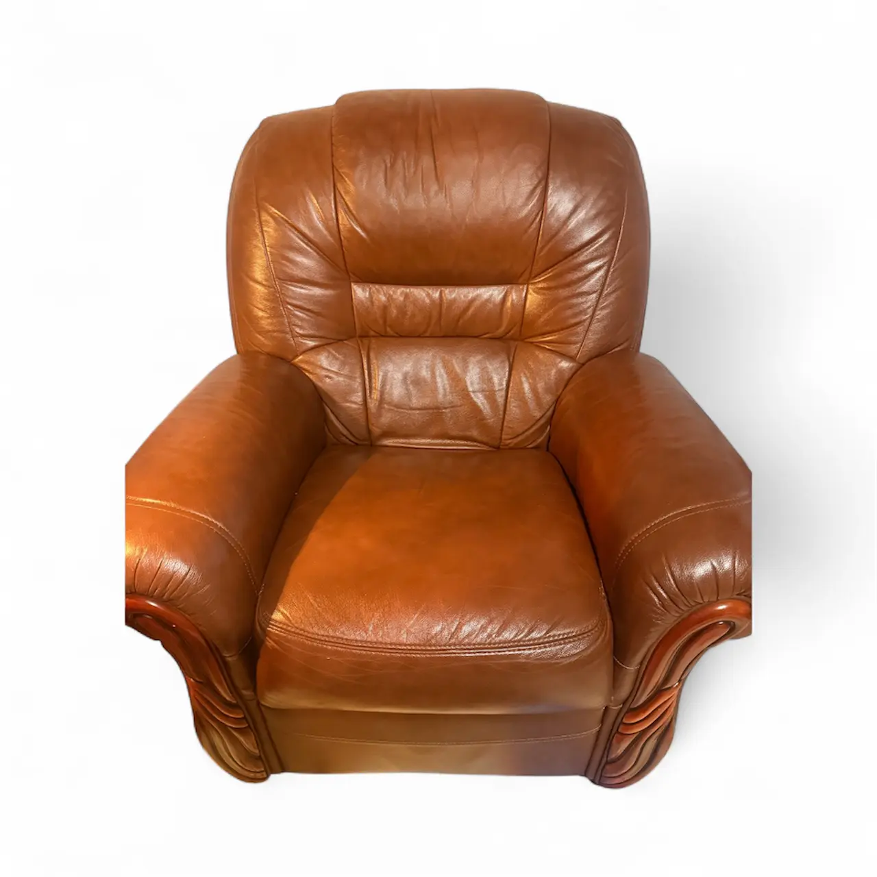 Brown leather 3 piece sofa set. Set consists of two 2 seater sofas and one recliner chair.