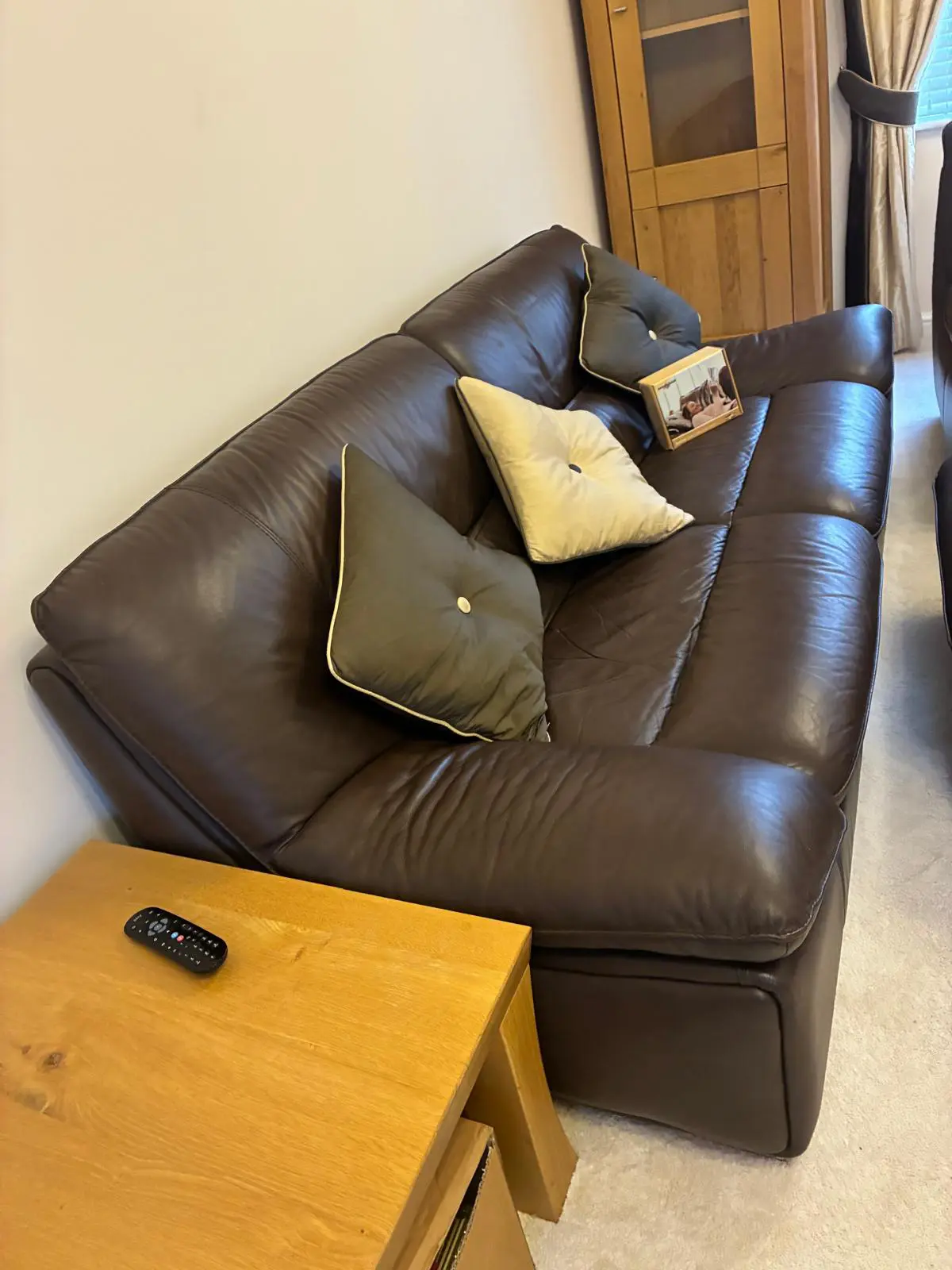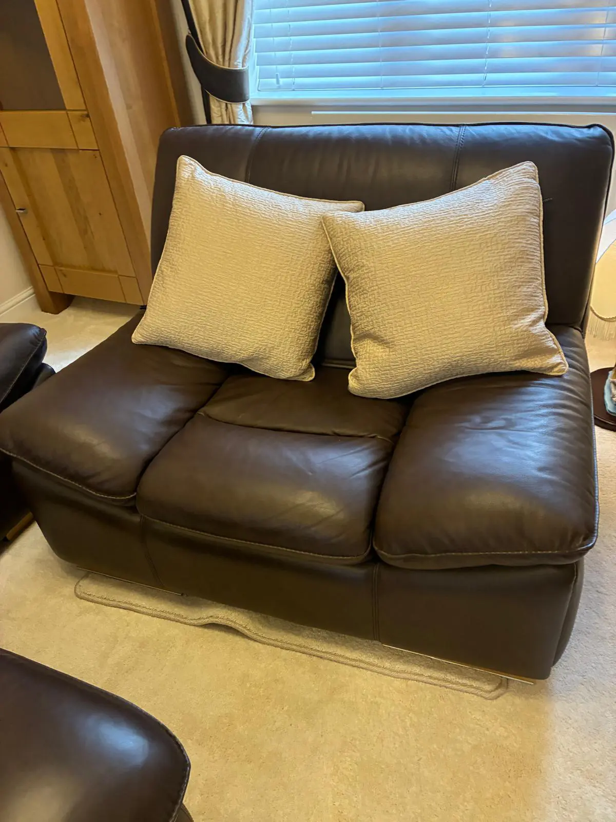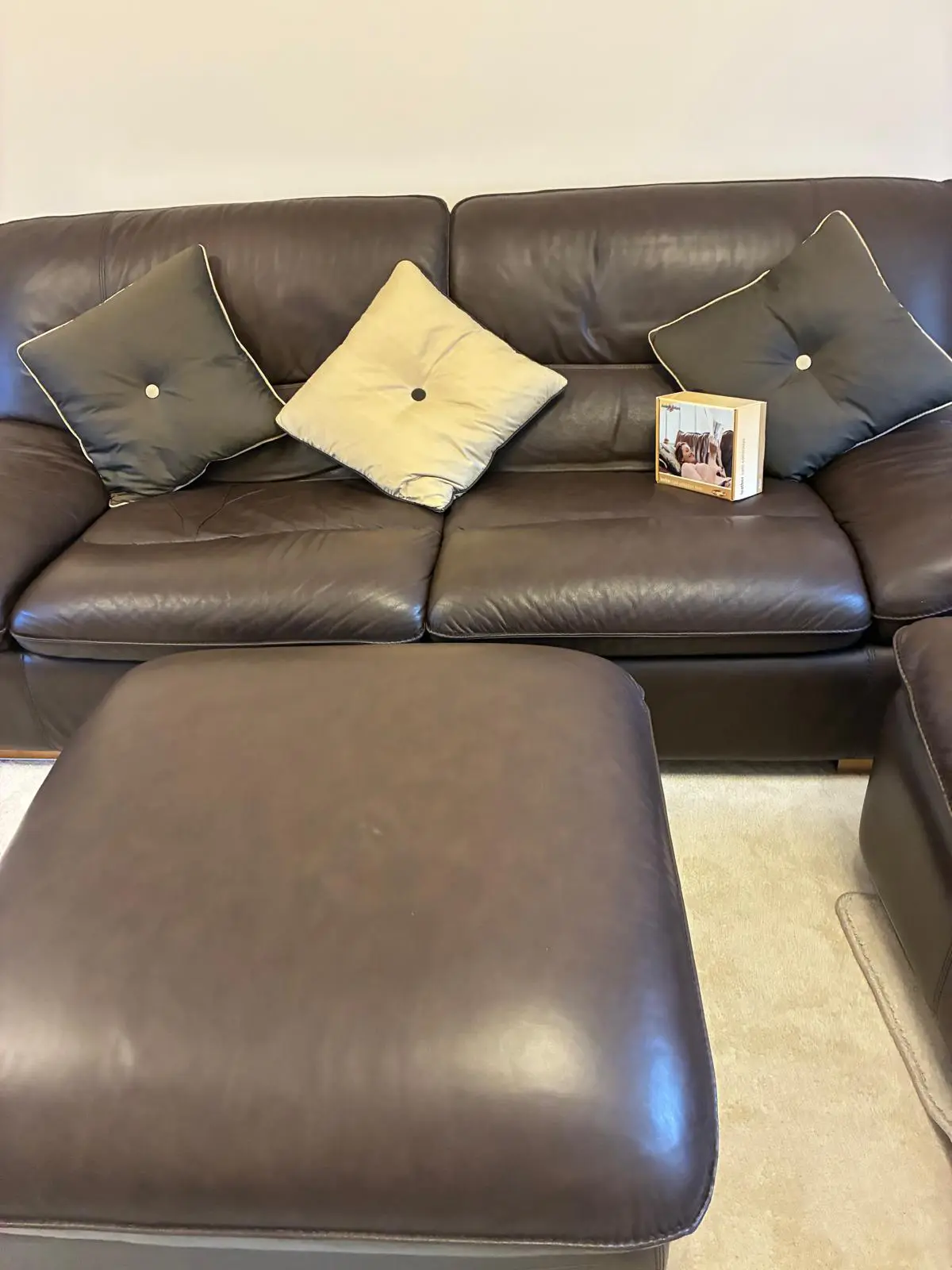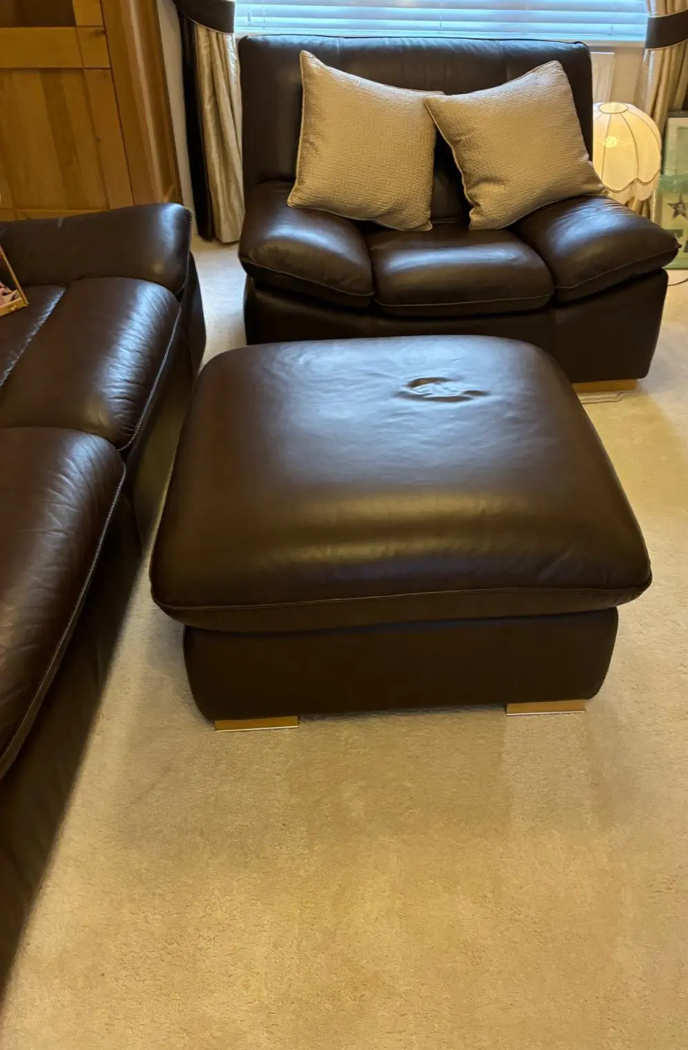 3 Seater + Chair + Footstool. Brown leather, great condition, throw used to protect Sofa. No stains, just wrinkles. Includes care kit and cushions. Originally bought from Cousins.
