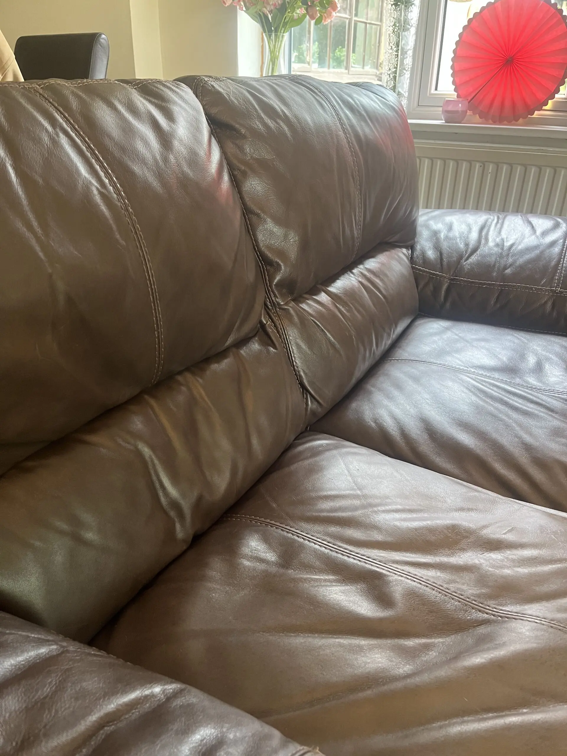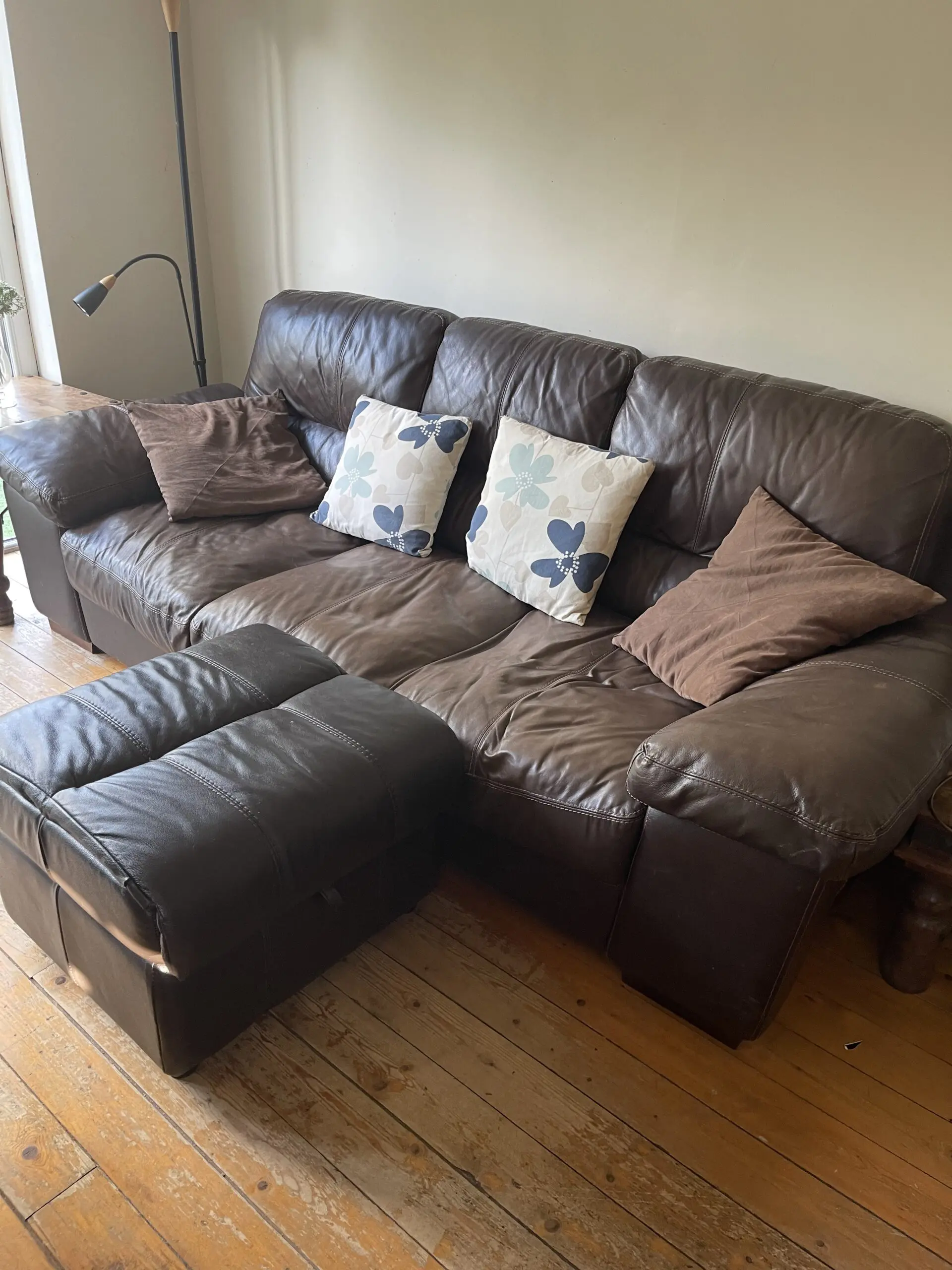 Large beautiful dark brown soft leather sofas and 2 matching Pouffees with storage inside