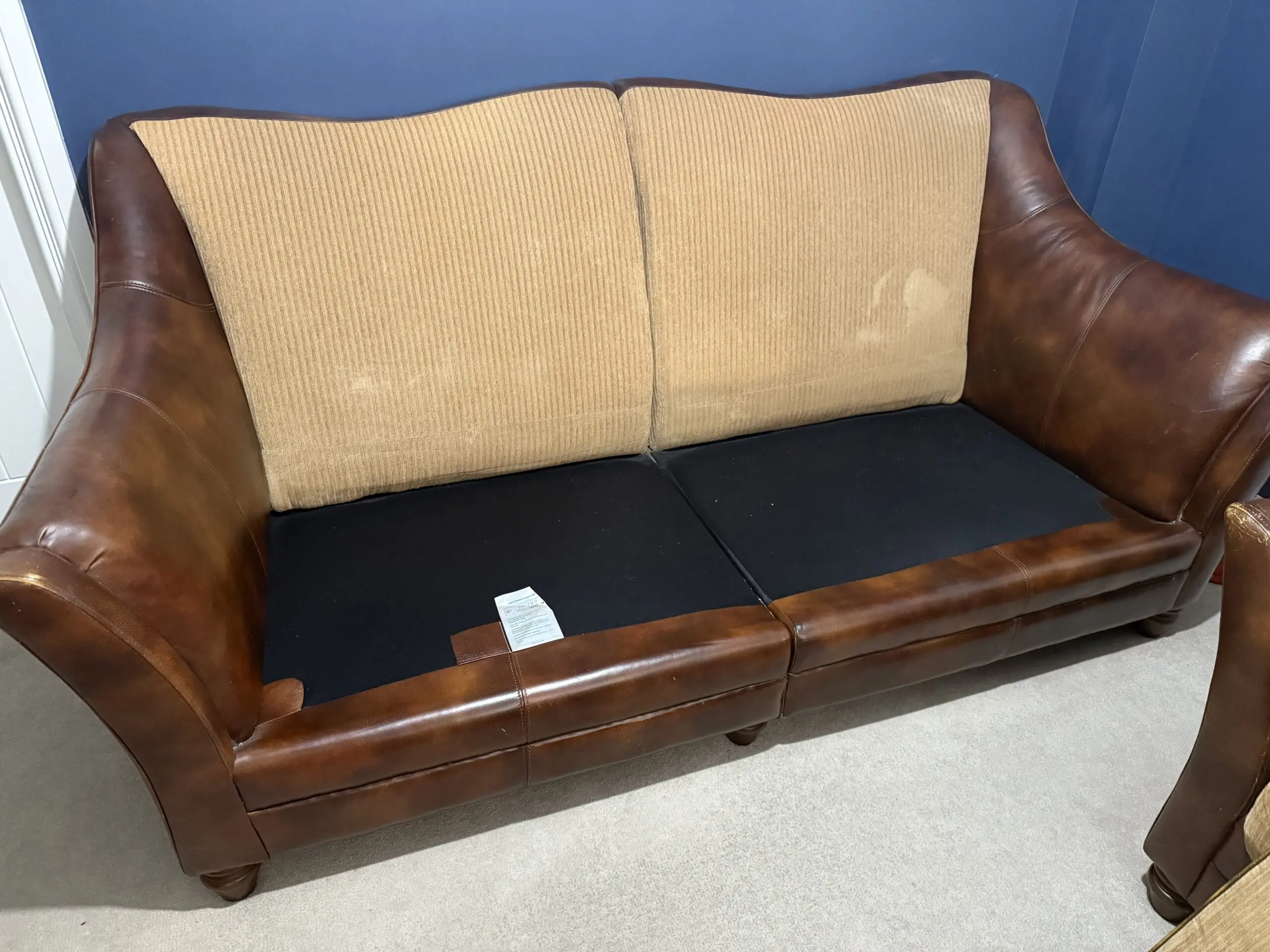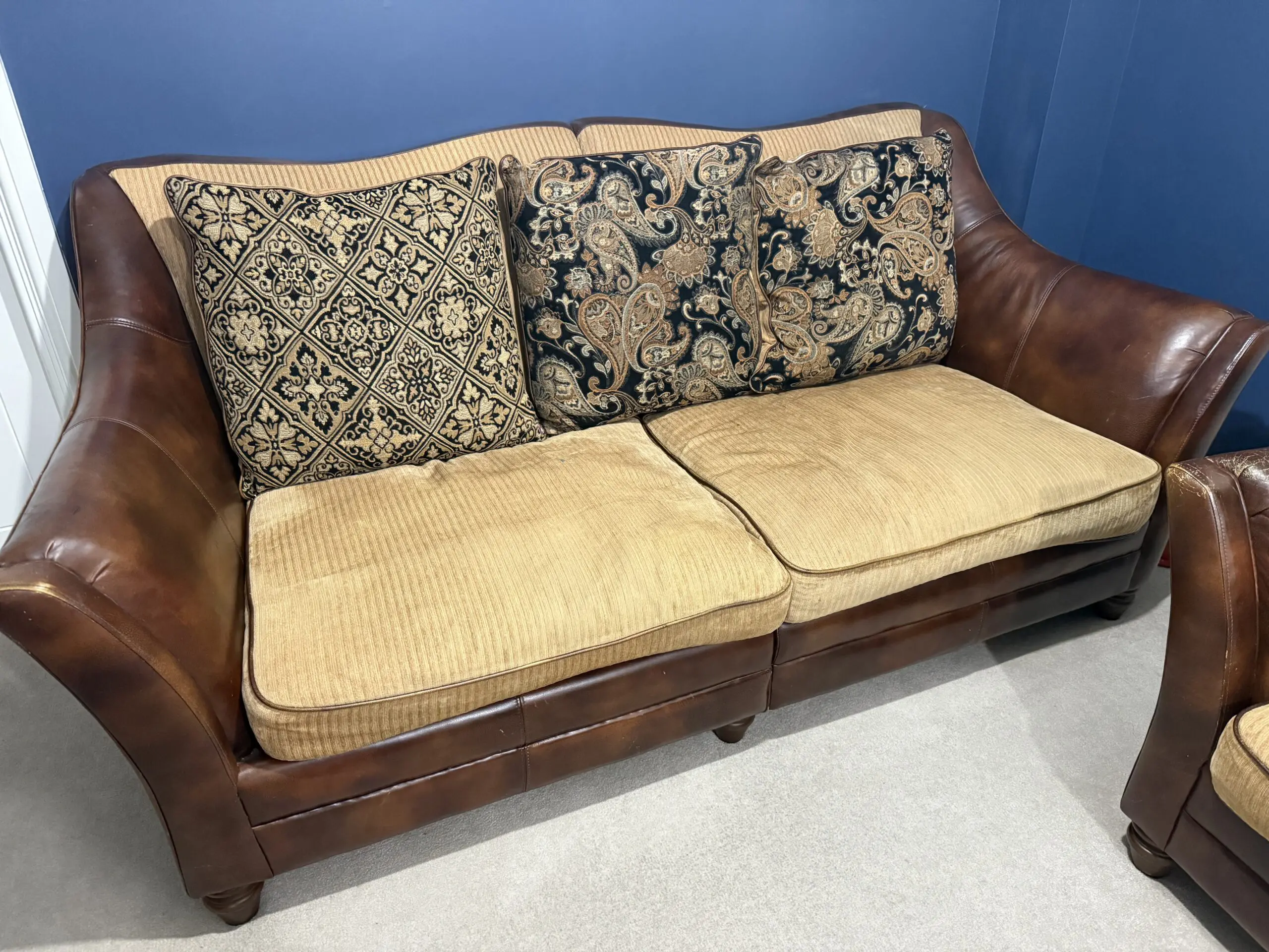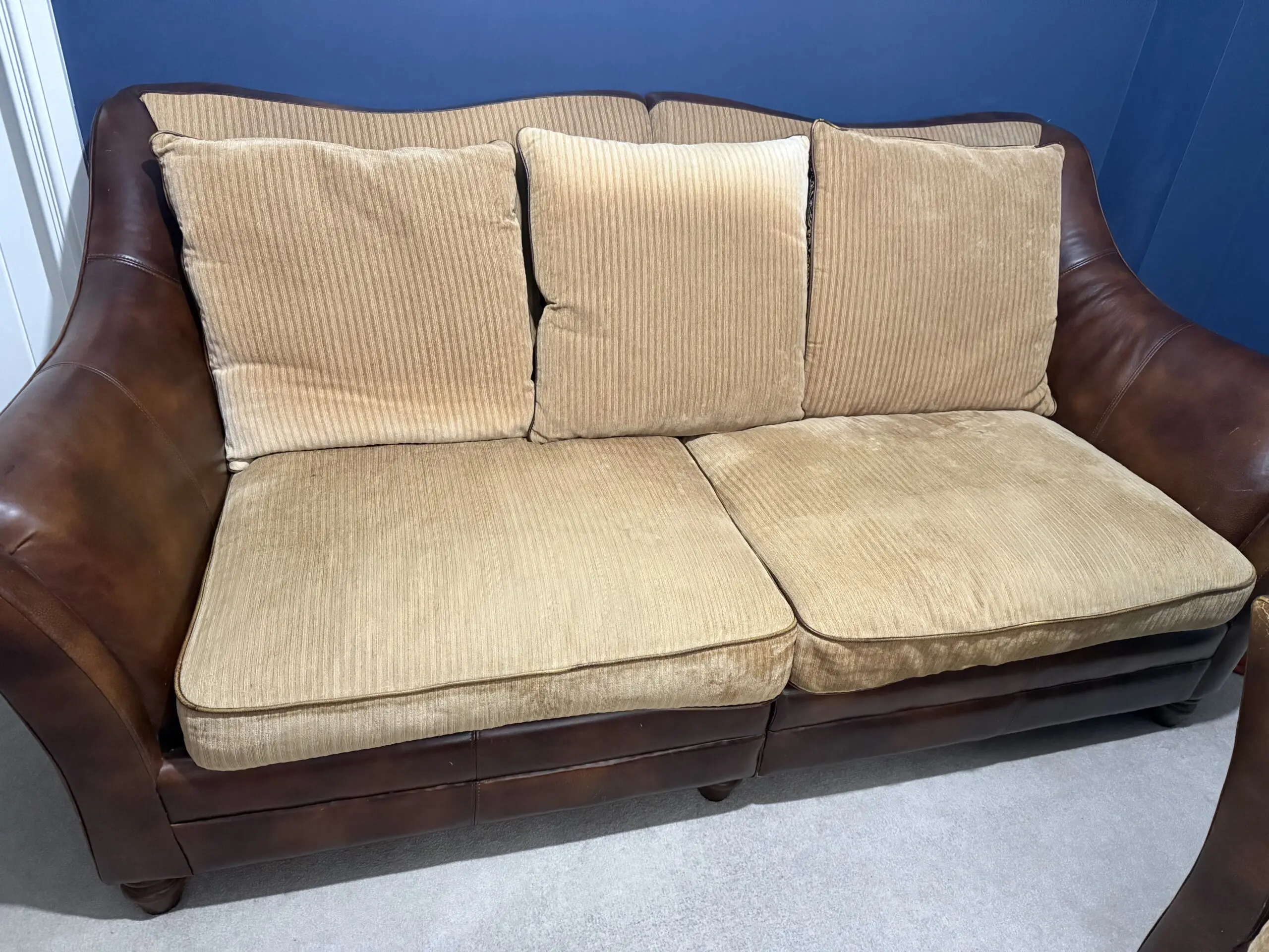 Brown sofa set with 1 large double and 2 singles. Leather frame and fabric cushions In very good condition with minor wear but with a bit of polishing, will be perfect