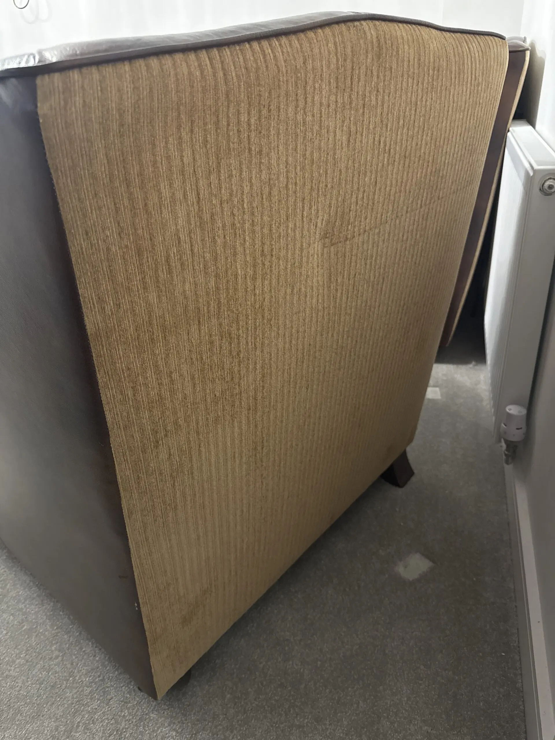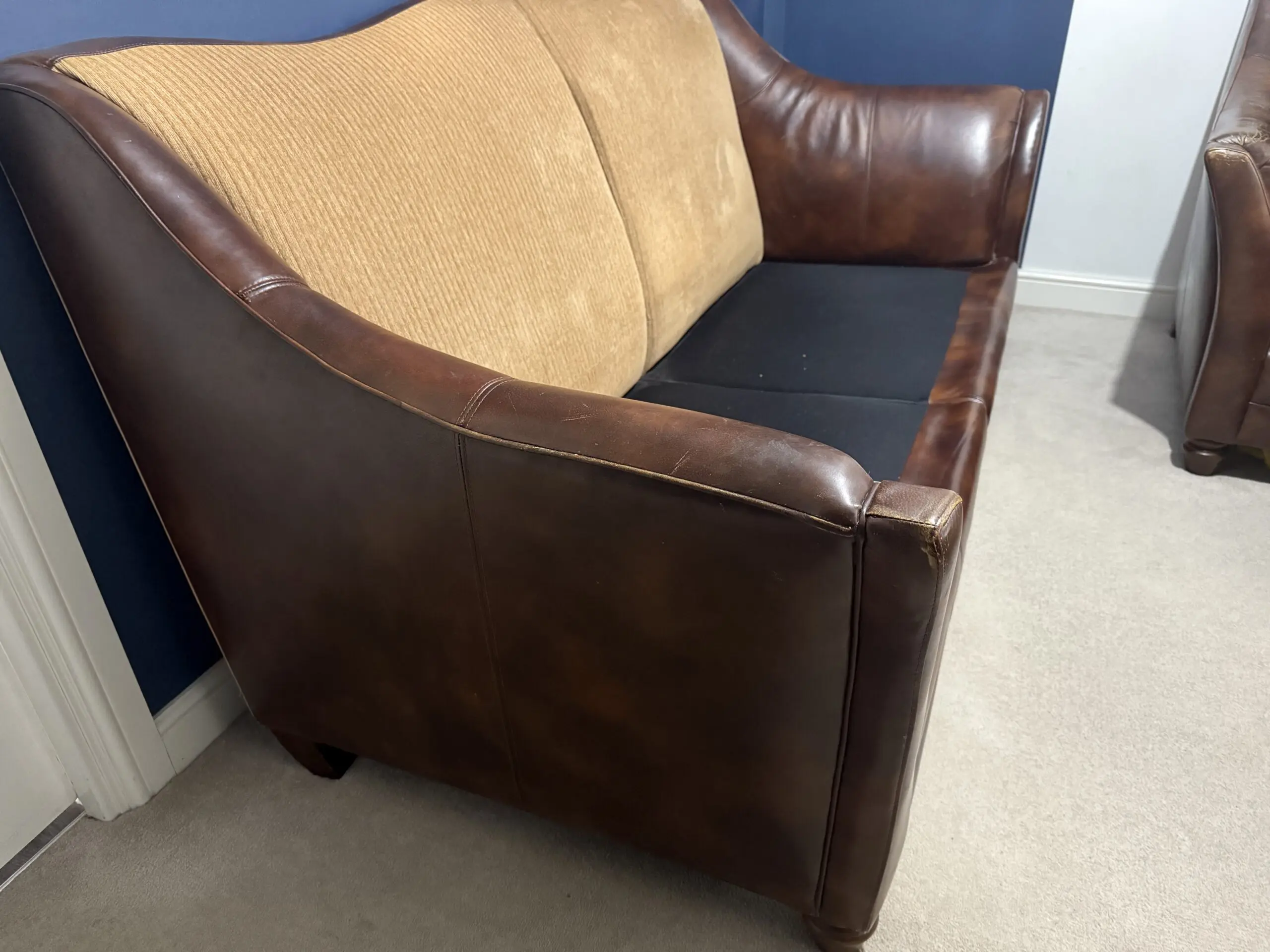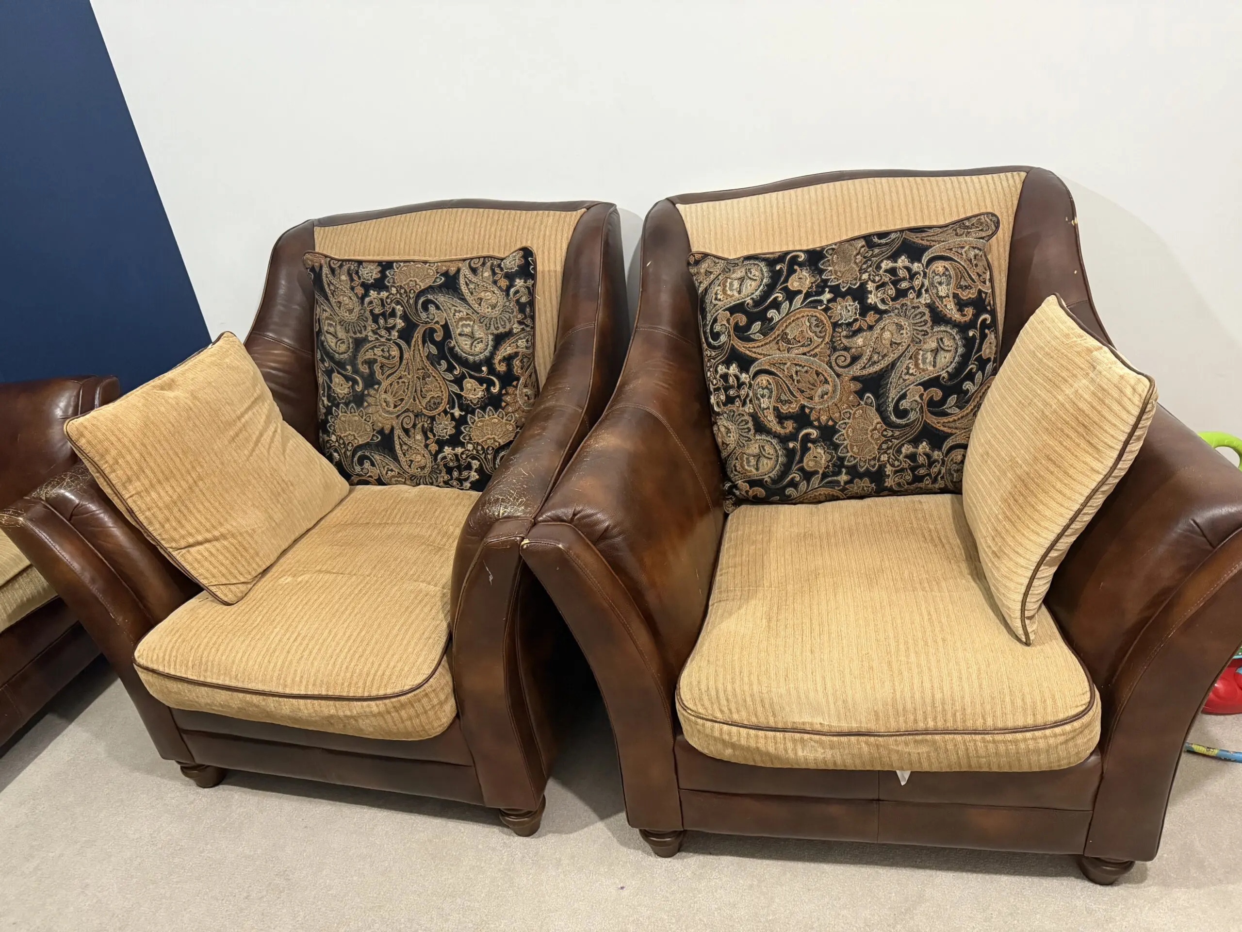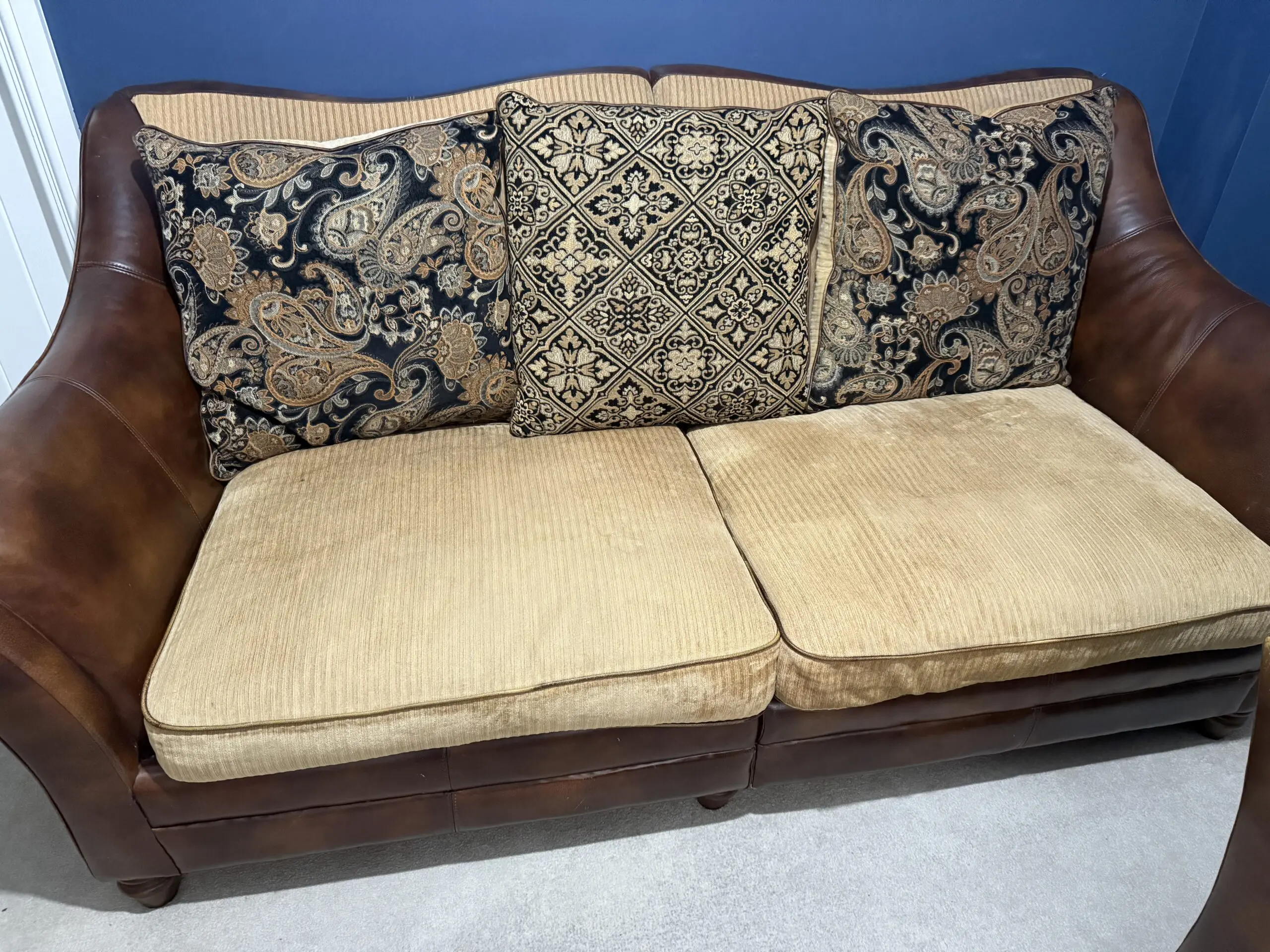 Brown sofa set with 1 large double and 2 singles. Leather frame and fabric cushions In very good condition with minor wear but with a bit of polishing, will be perfect