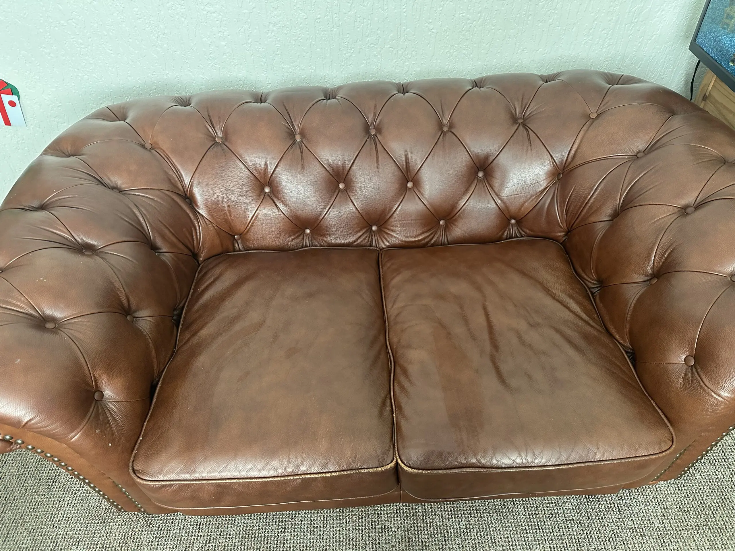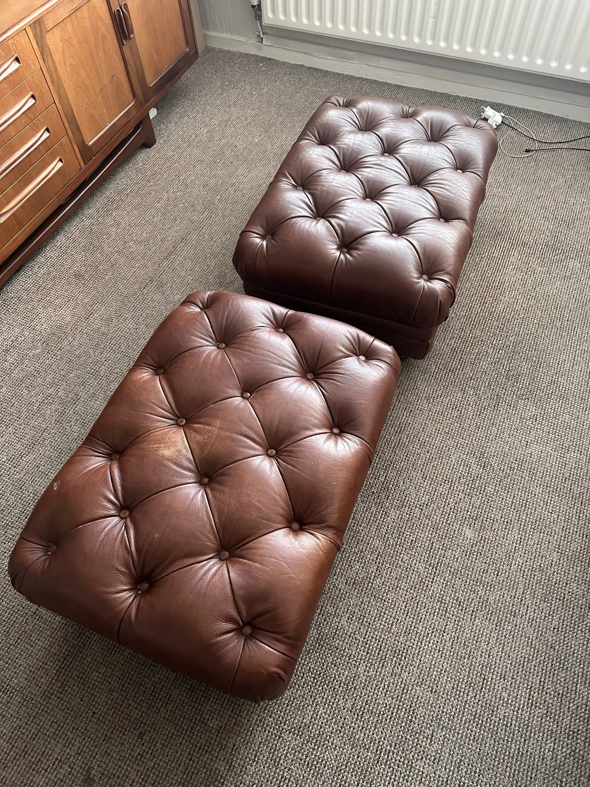 Brown leather Chesterfield 4 piece sofa set, 3 seater has a bit of wear & tear however the 2 seater is in good condition as are the two footstools.