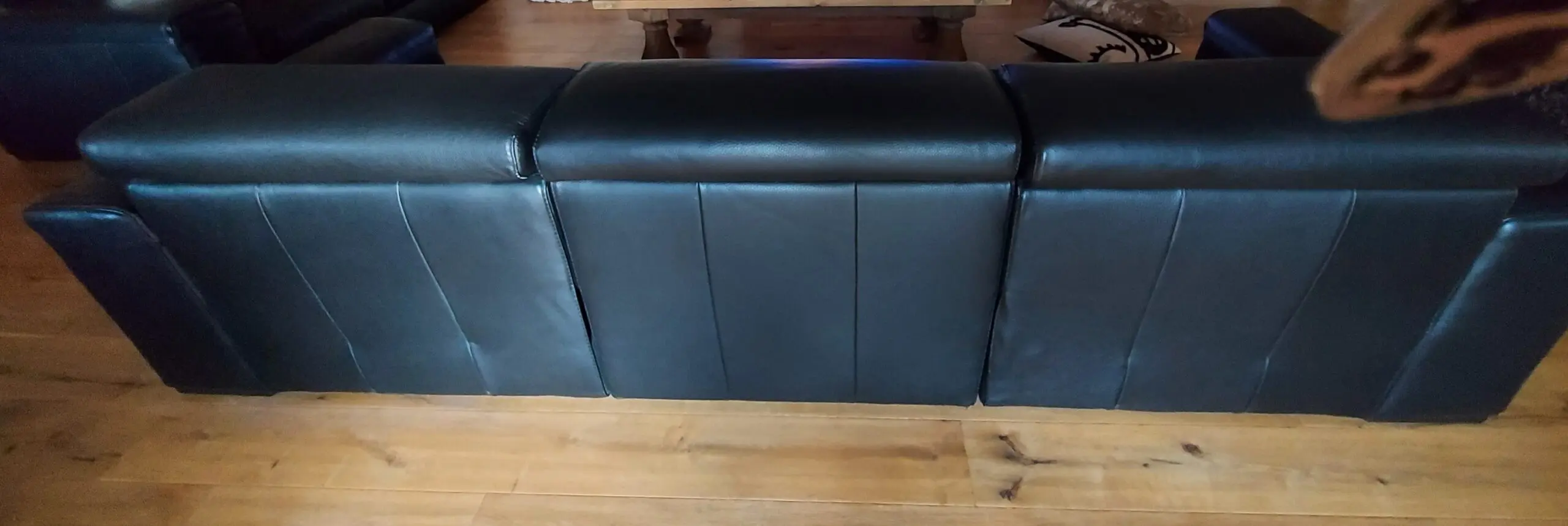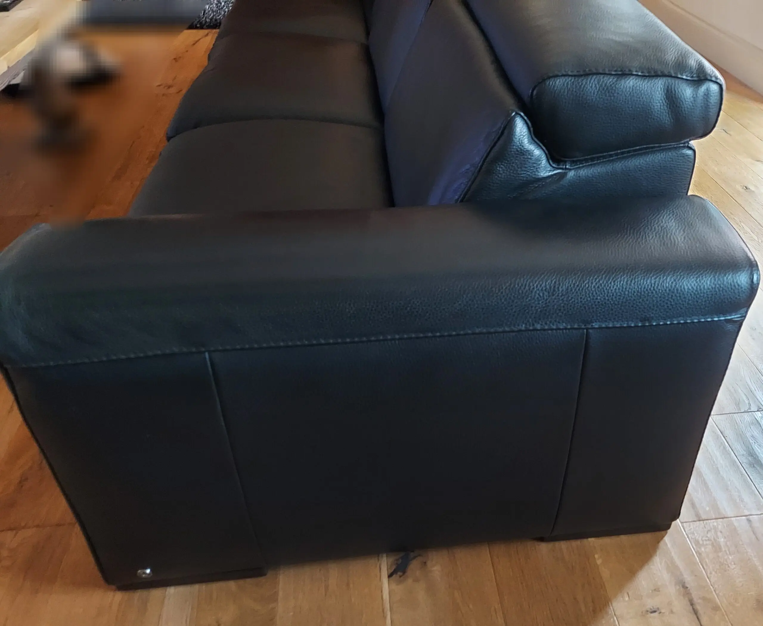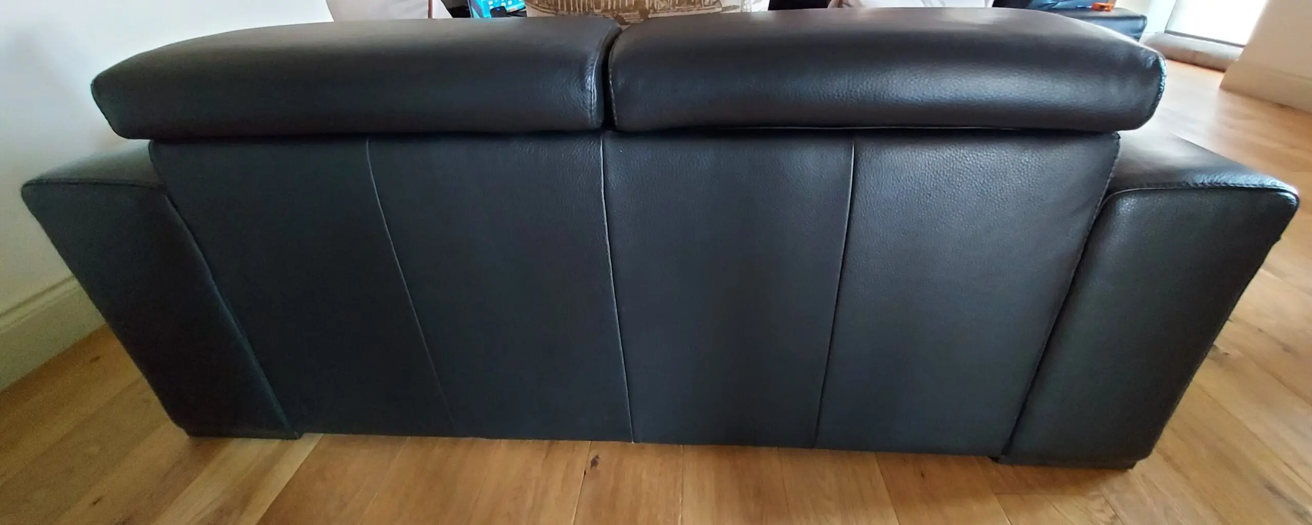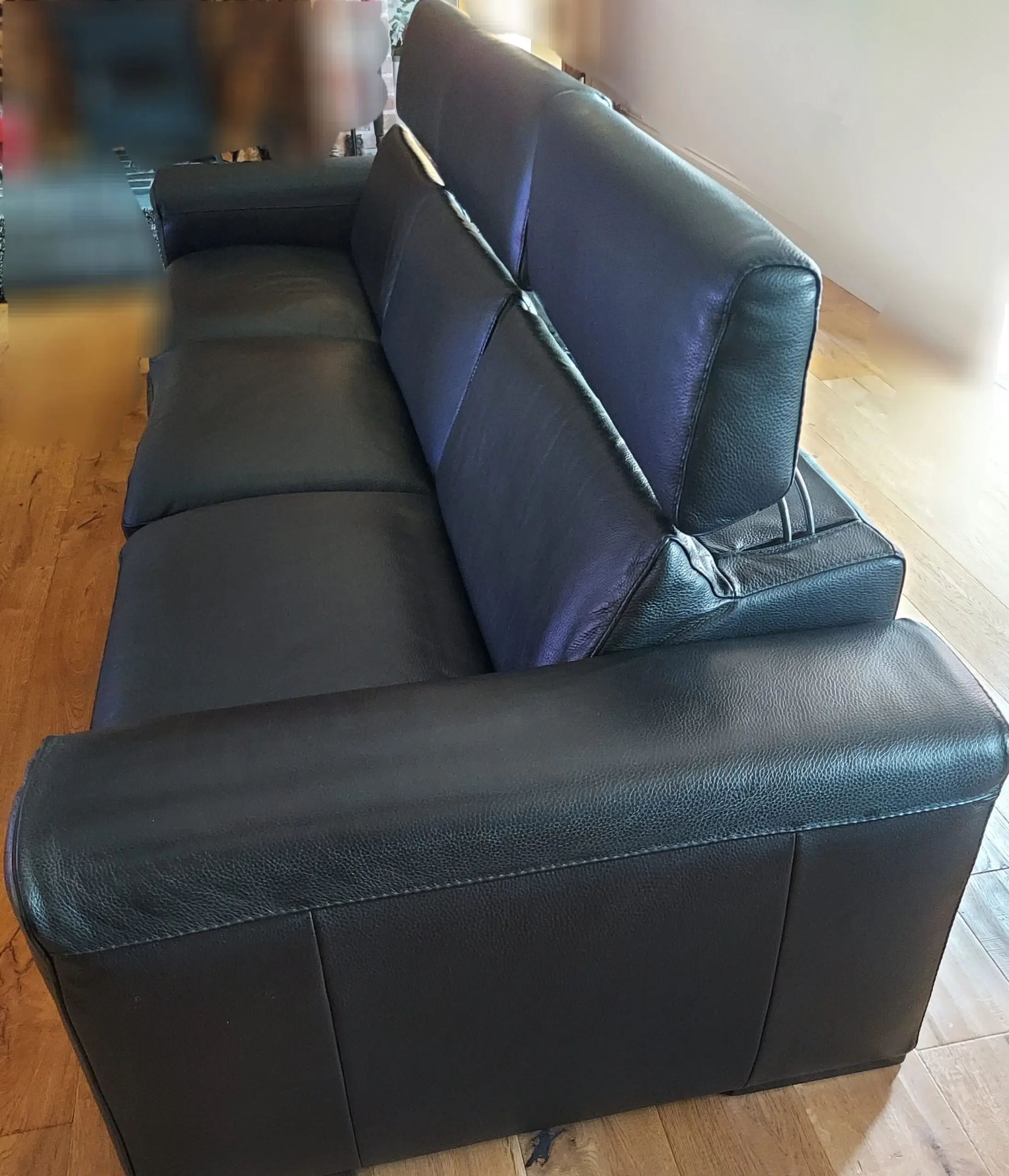 Natuzzi Black leather sofa set in excellent condition. Extra Large three seater (seats 5 comfortably) and a generous love seat (easily seat 3). The three seater comprises of a recliner at each end (electric). No stains or defects. Original price c£6.5k.