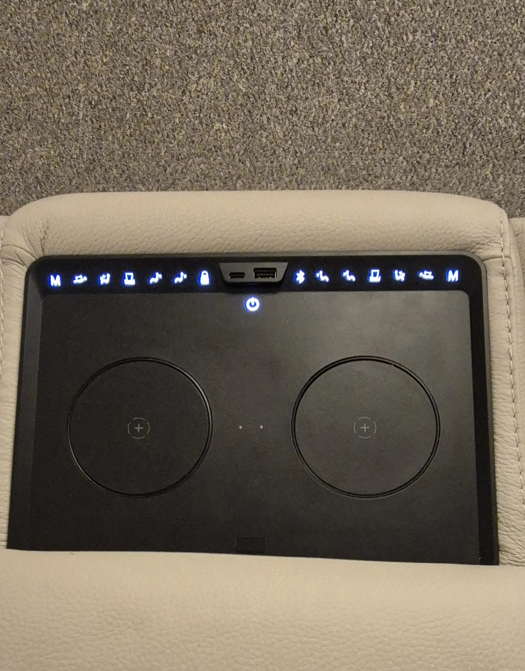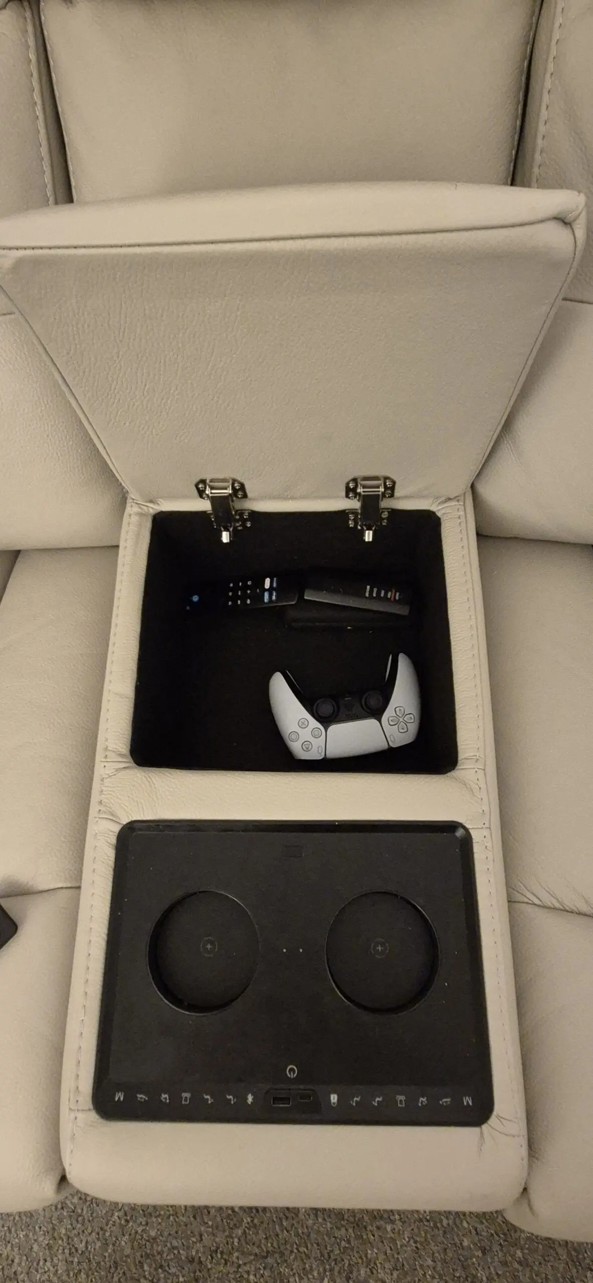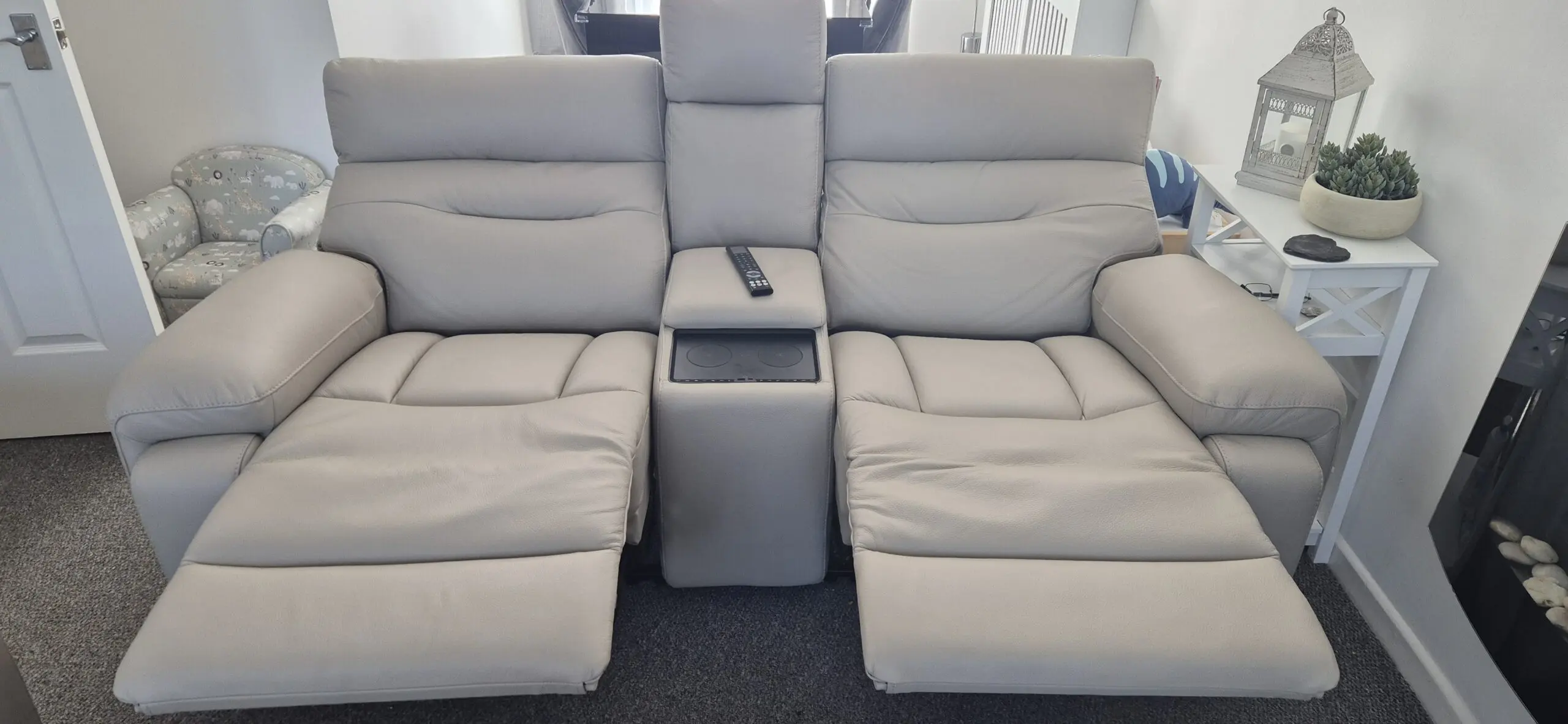 Cinema sofa connects to tv by Bluetooth, sofa has built in speakers and one showing on back of sofa. Fantastic if used with a sound bar as well, the seats vibrate with louds noises, such as explosions, as has vibration option for relaxation.