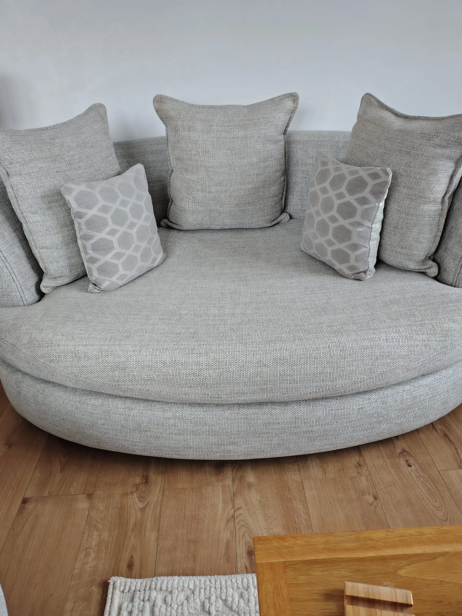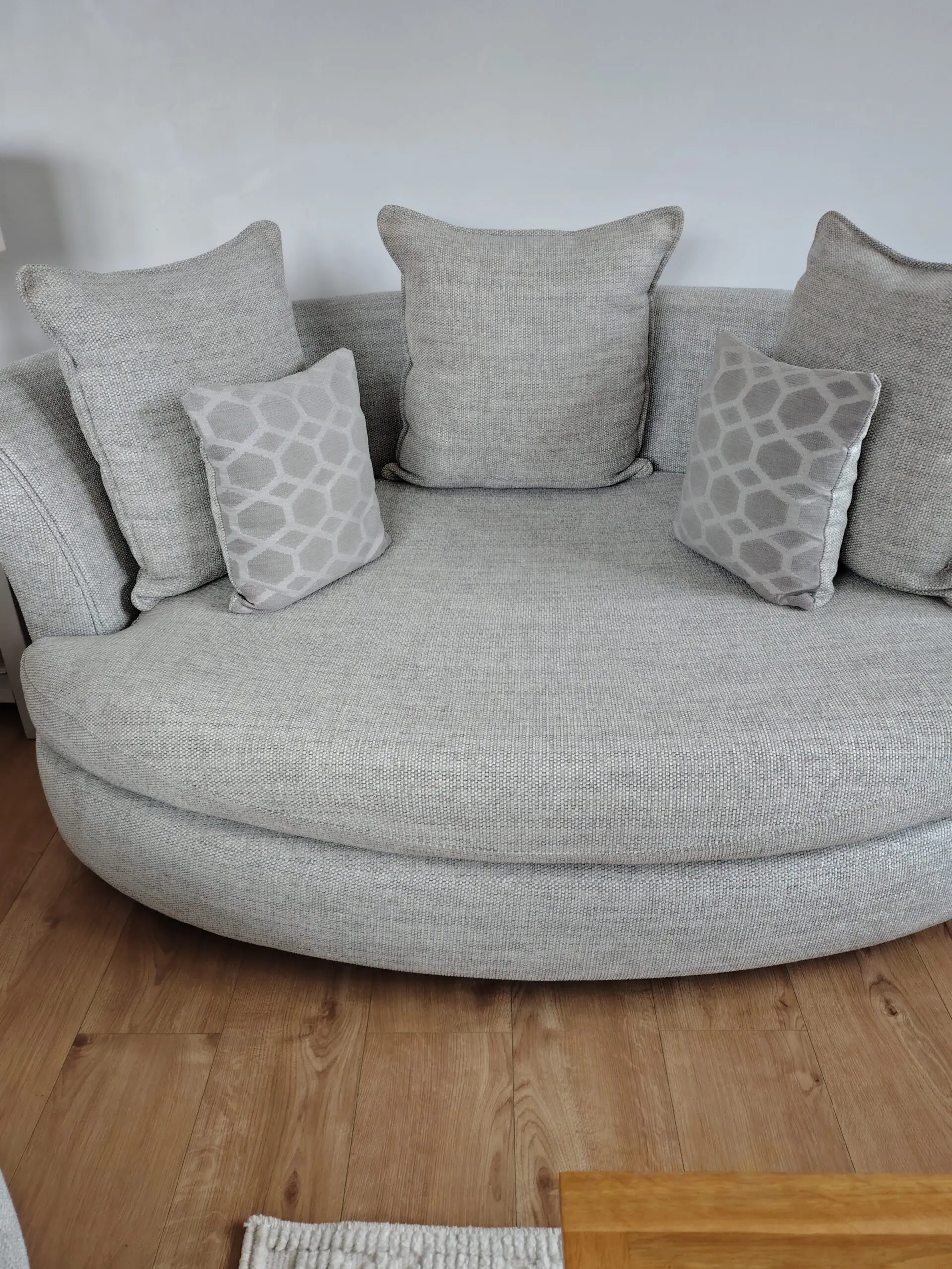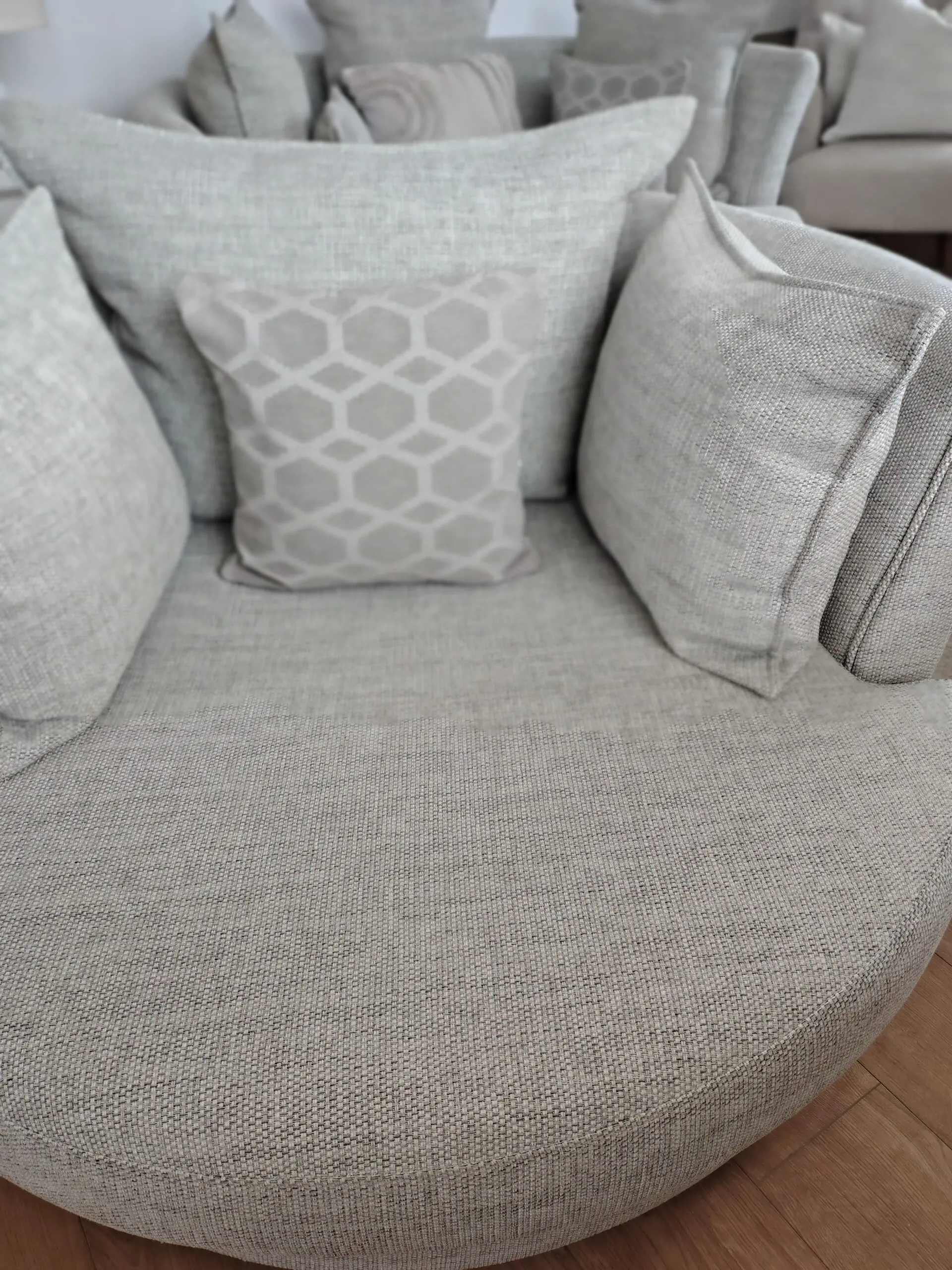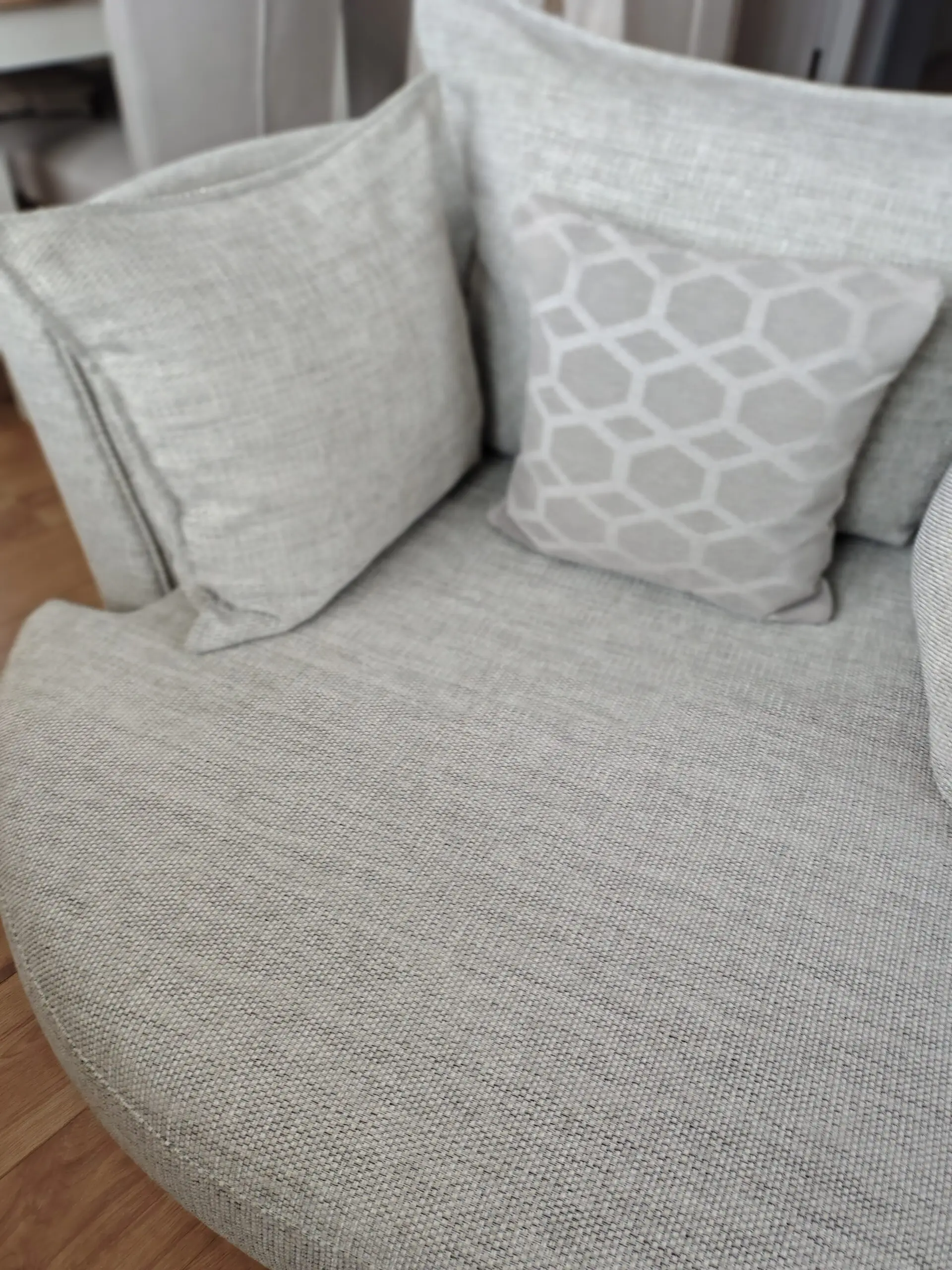 Silver & grey tweed look swivel chair comes with the scatter cushion. Zip covers can be removed for washing