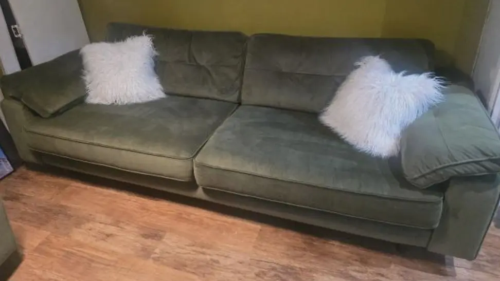 DFD GRAND DESIGN Olive velvet Kent Sofa and Cuddler.Nearly new, too big for our small room.