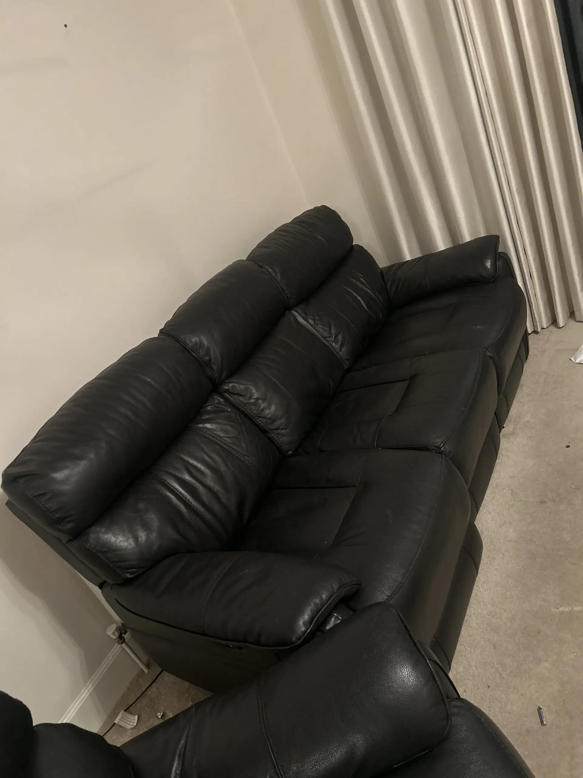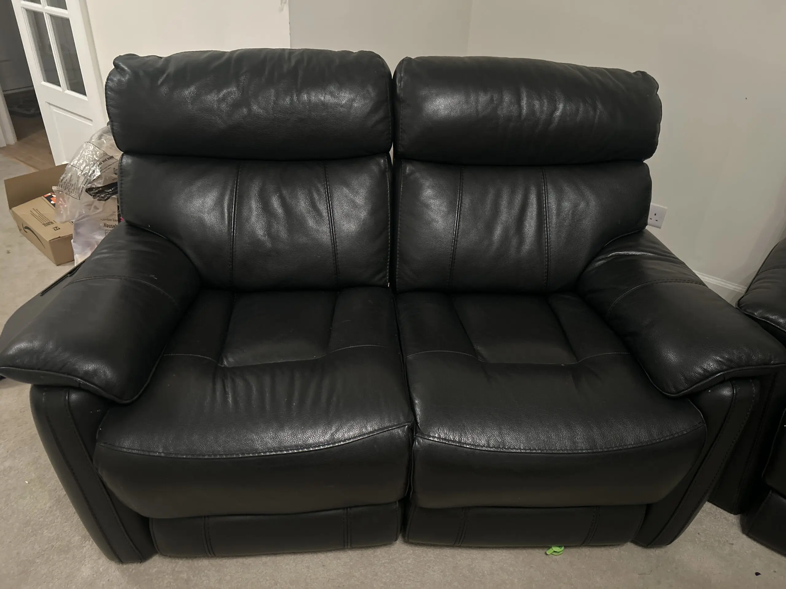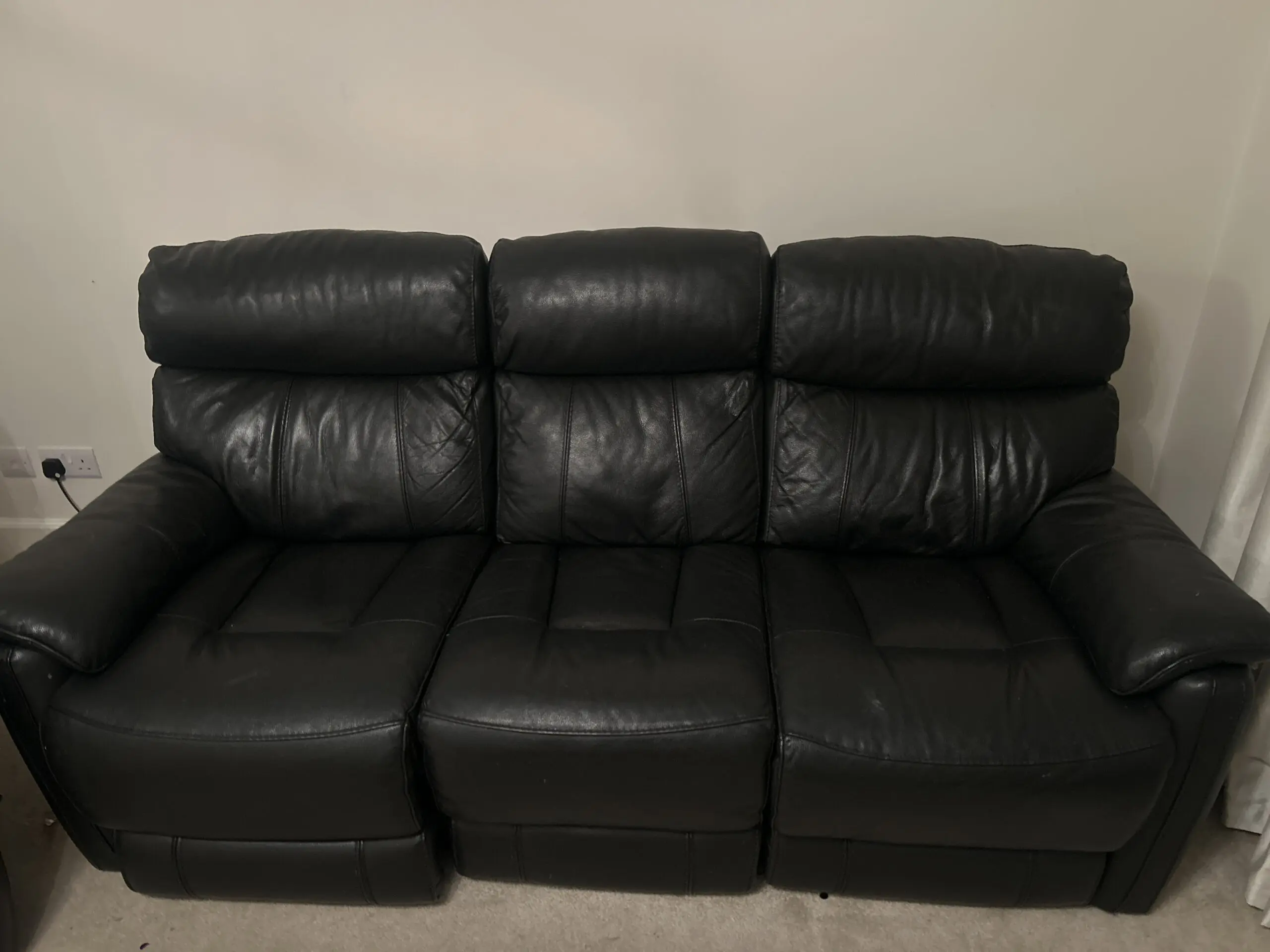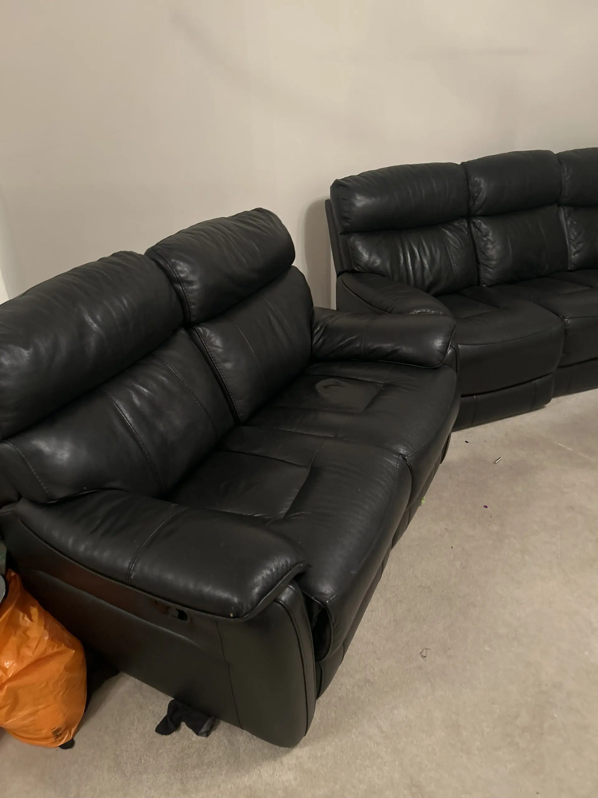 1 electric reclining 3 seater sofa, 1 normal reclining 2 seater sofa (1 of the 2 manual recliners not working but can be fixed), leather DFS cleaning care kit included