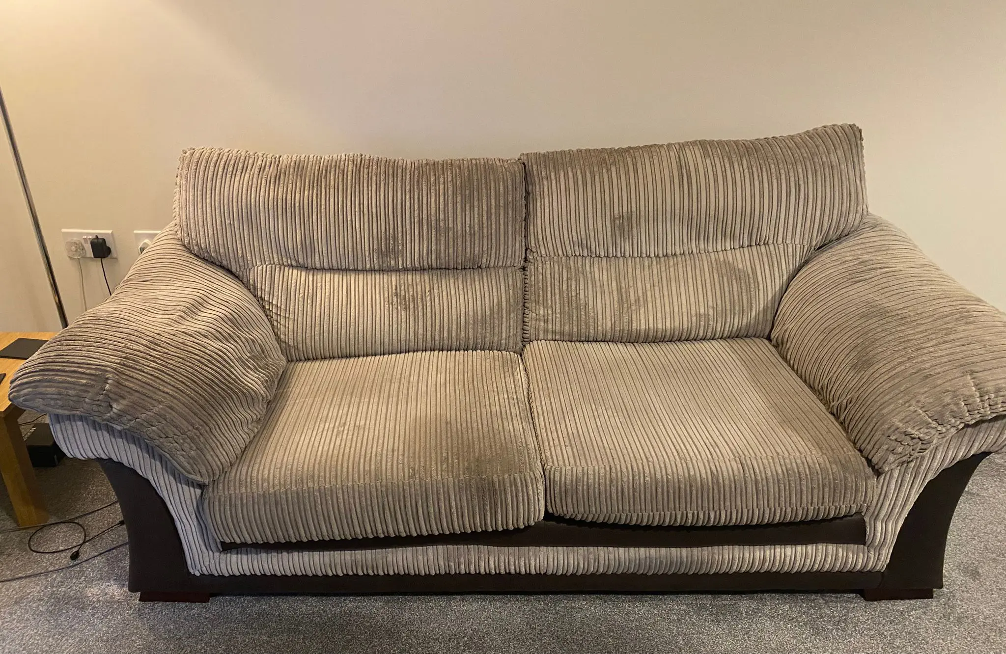 3 seater and 2 seater half faux chocolate leather and biege fabric sofa set. 3 seater is fitted with extra soft seat pads as extra