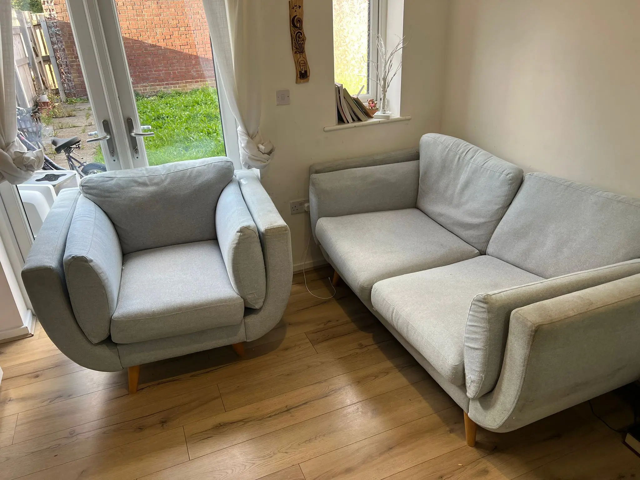comfy light grey sofa set that includes a 2-seater sofa and a matching armchair. I BOUGHT FROM DFS 5 years ago.