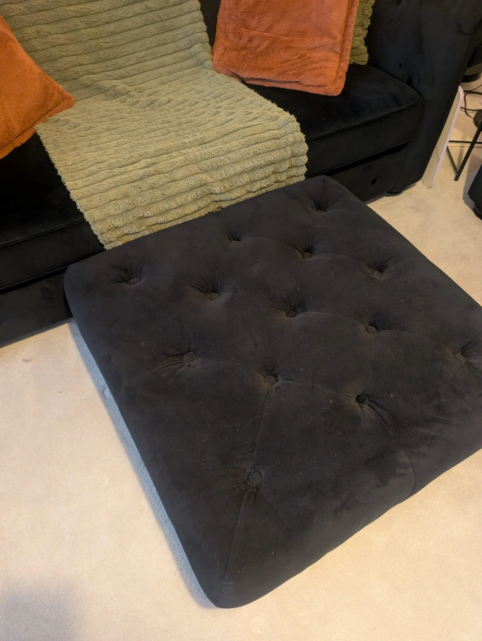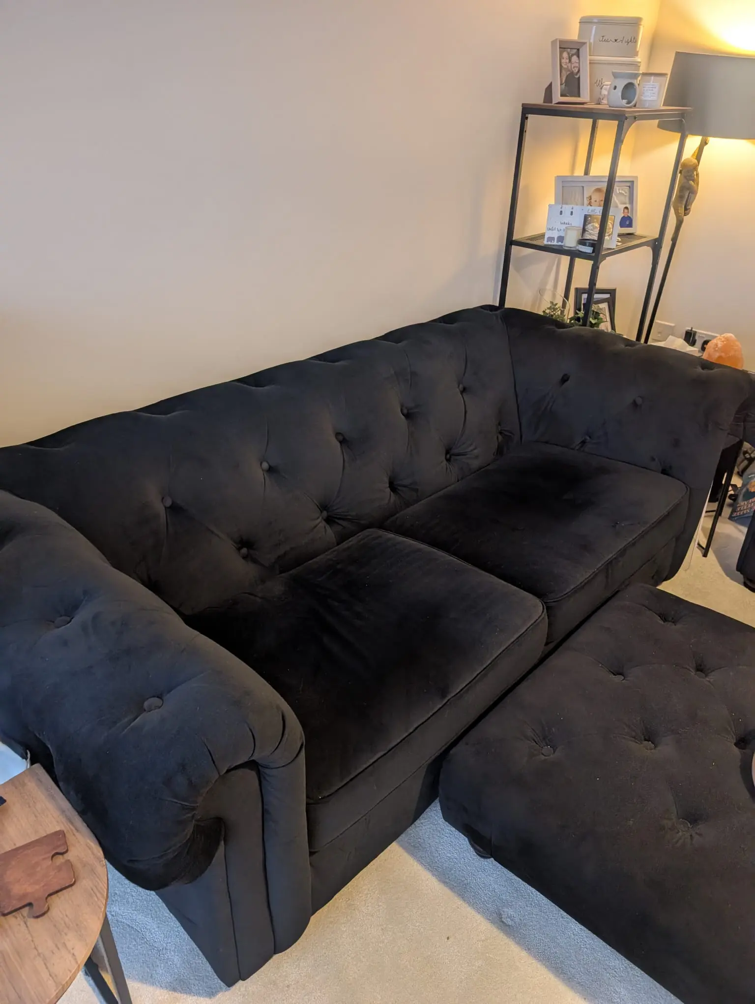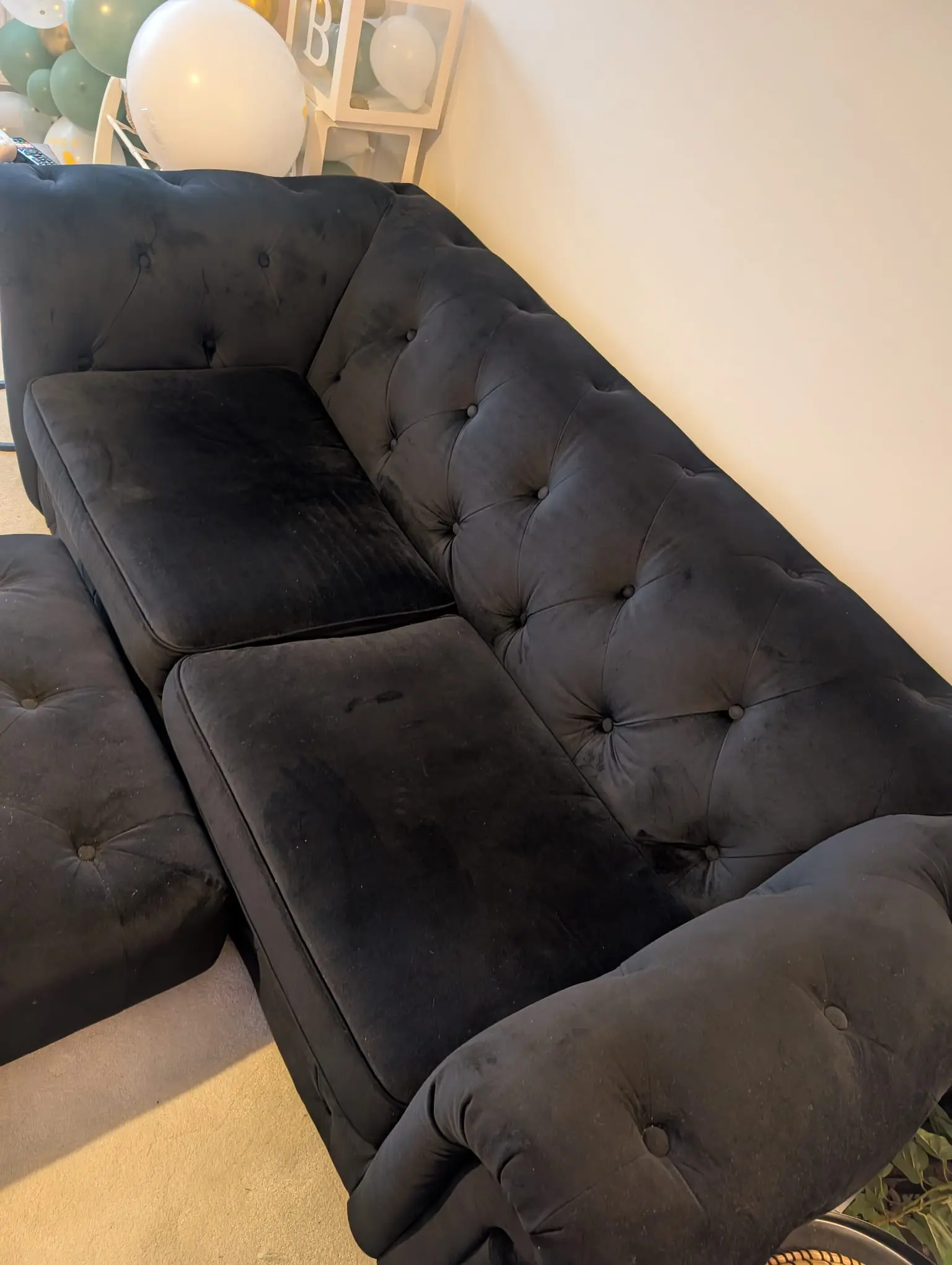 3 seater black velvet sofa, accompanied with black velvet cuddles chair and black velvet footstool, all in very good condition. Main sofa is less than a year old cuddles and footstool is about 2 years old.