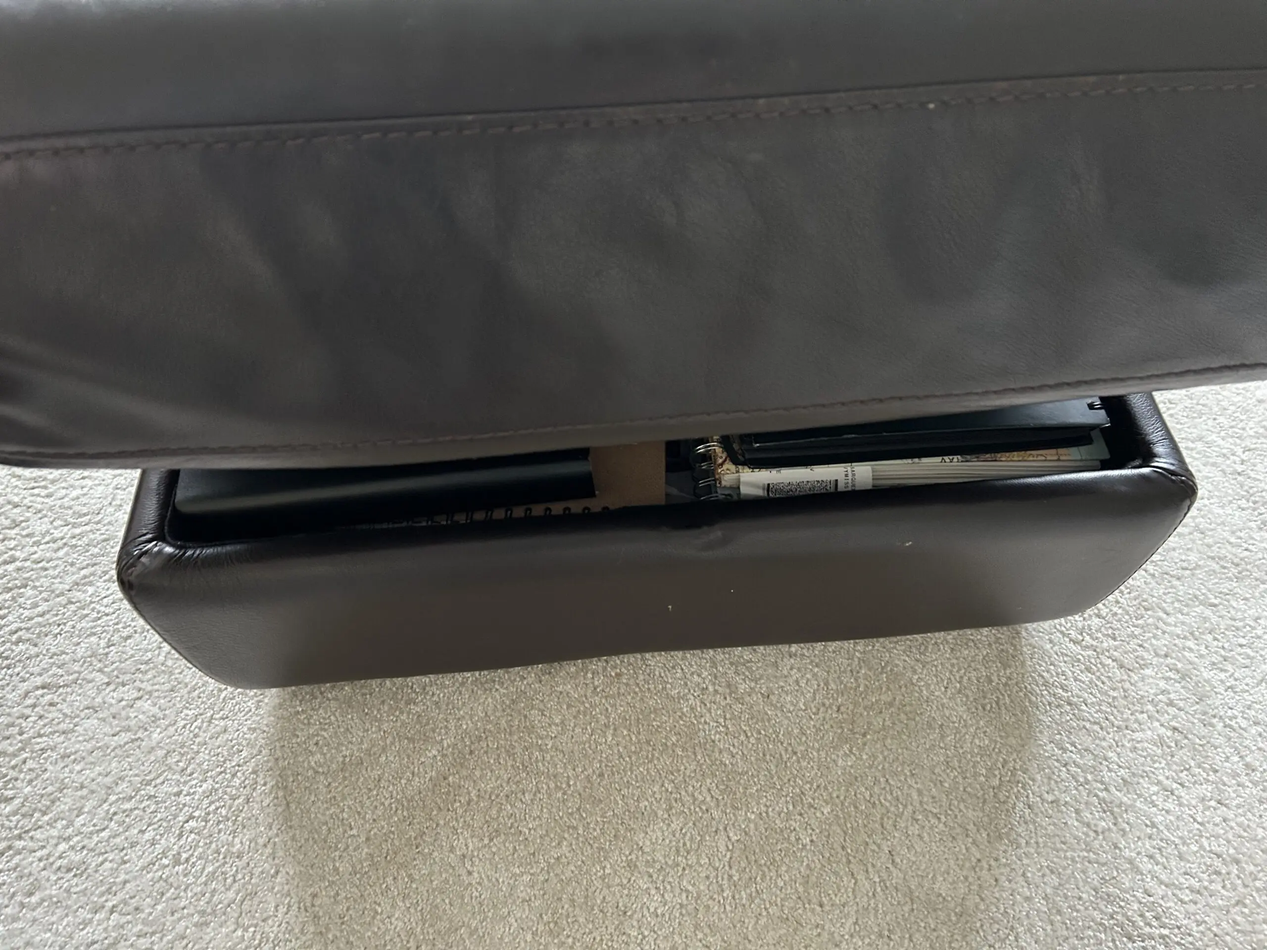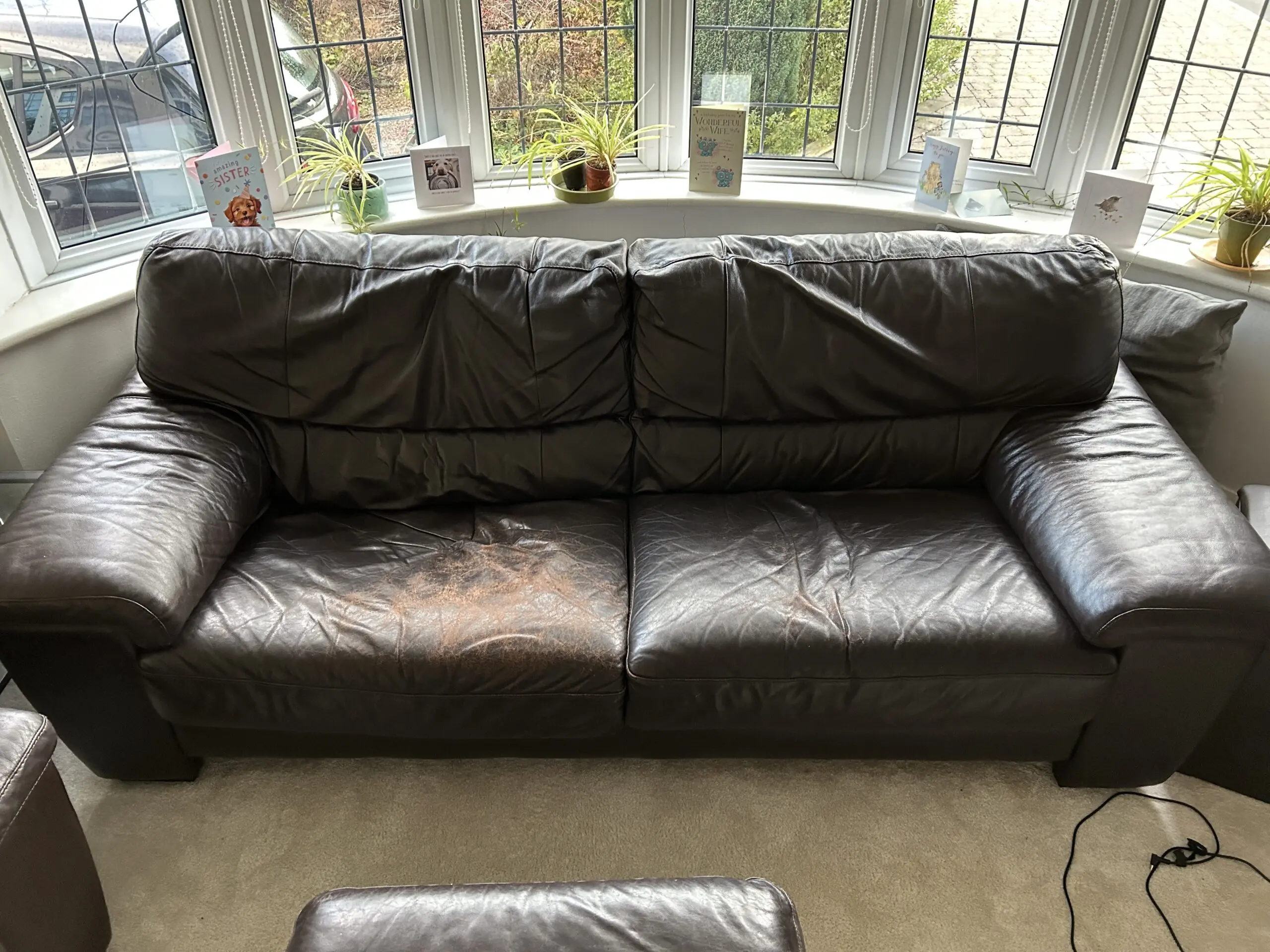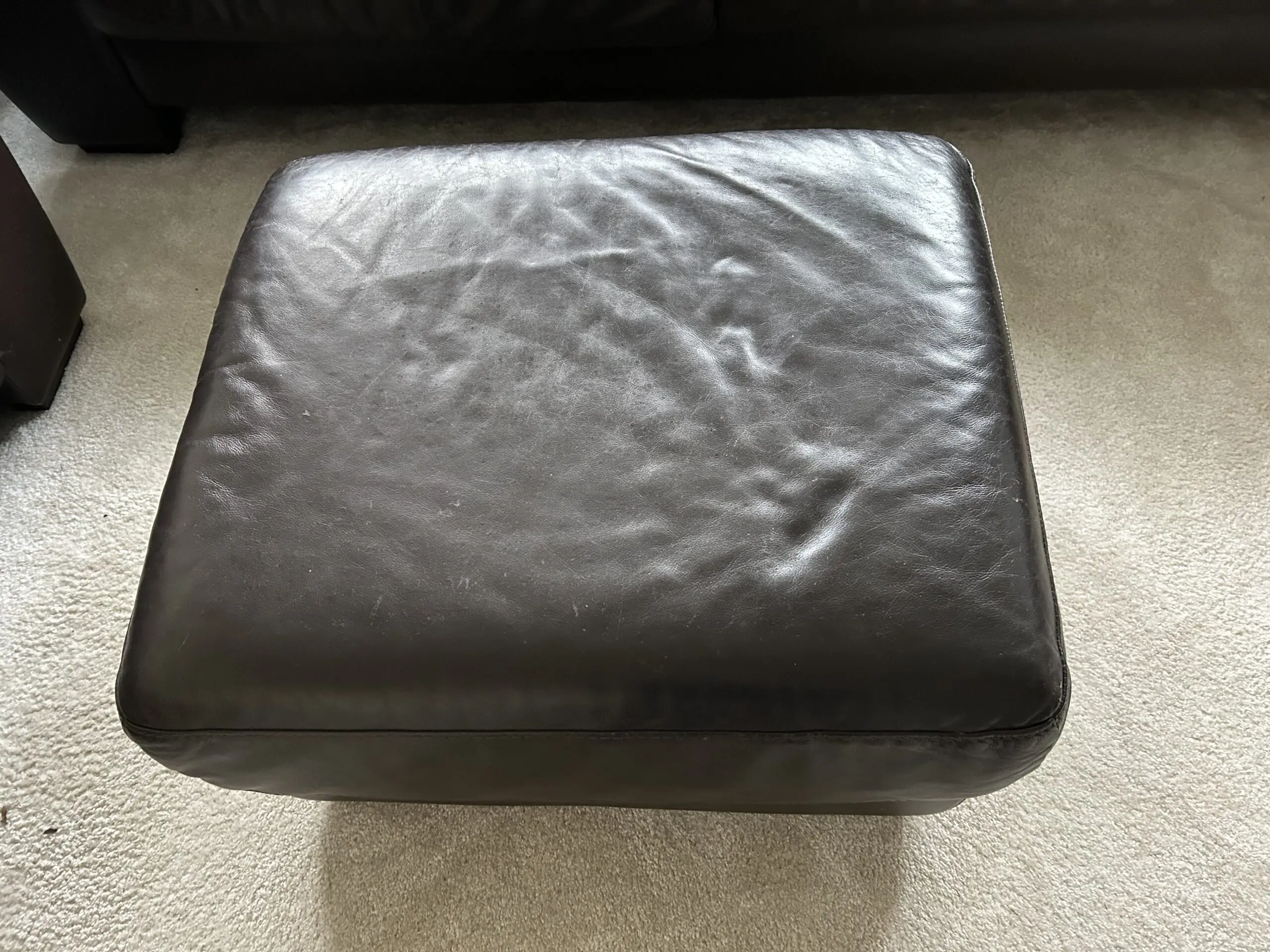 Black leather sofa set includes a 3 seater and a 2 seater sofa with a footstool with storage.