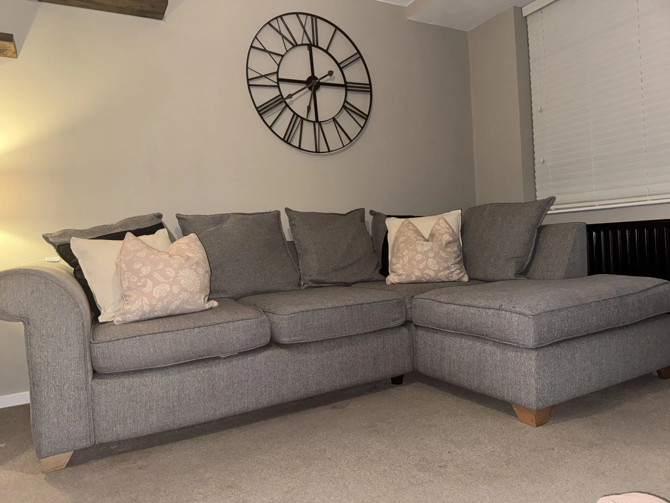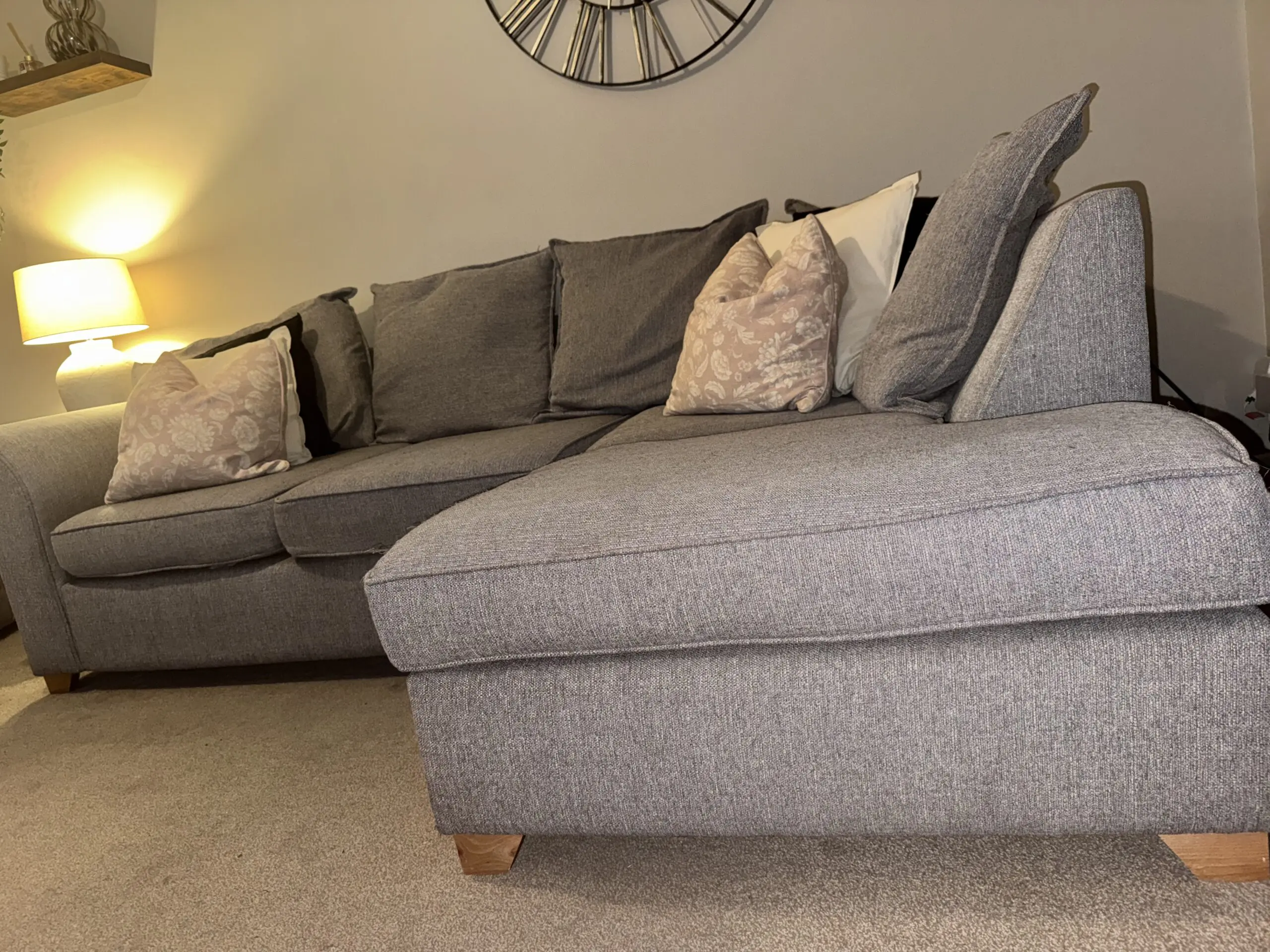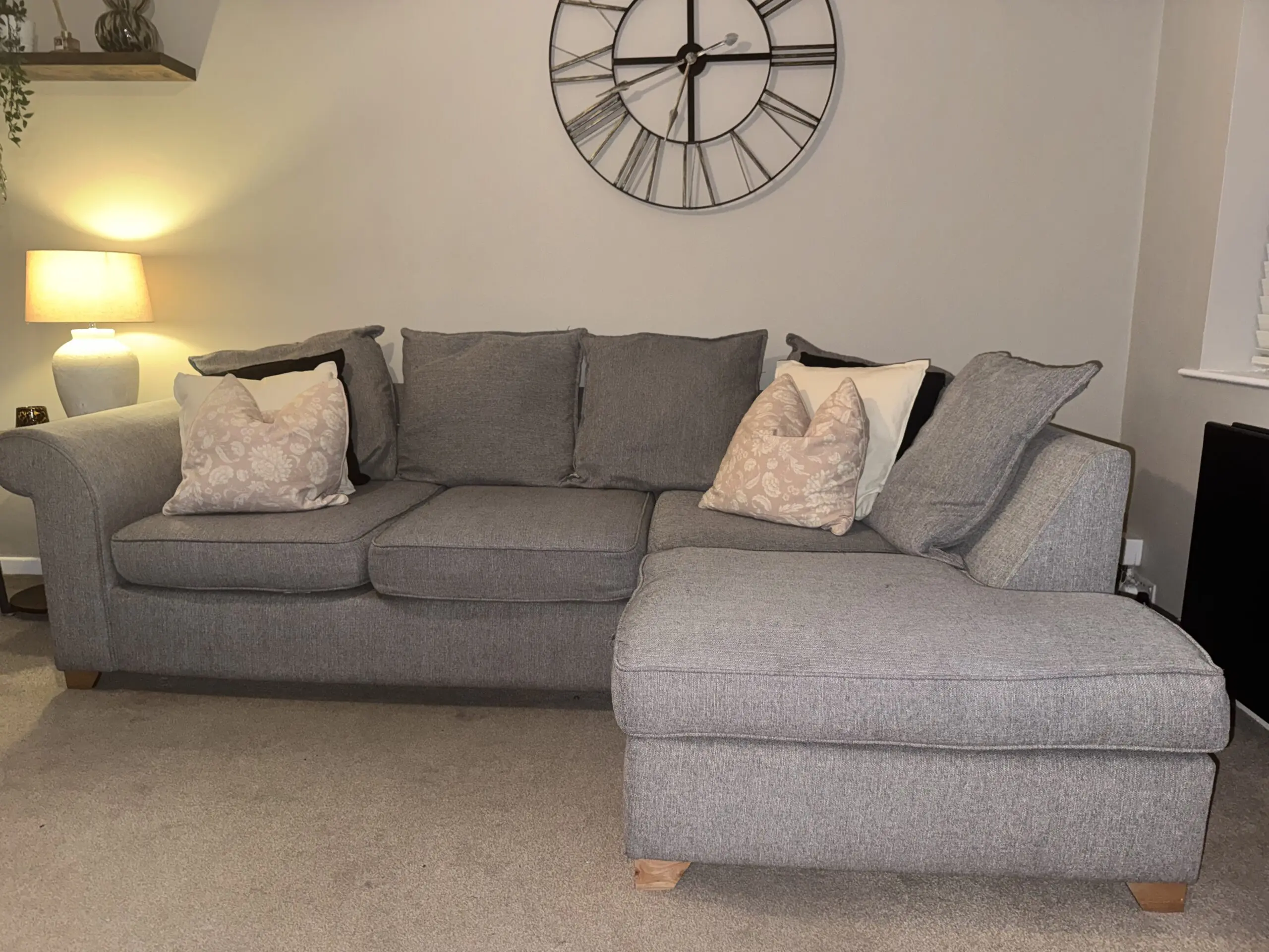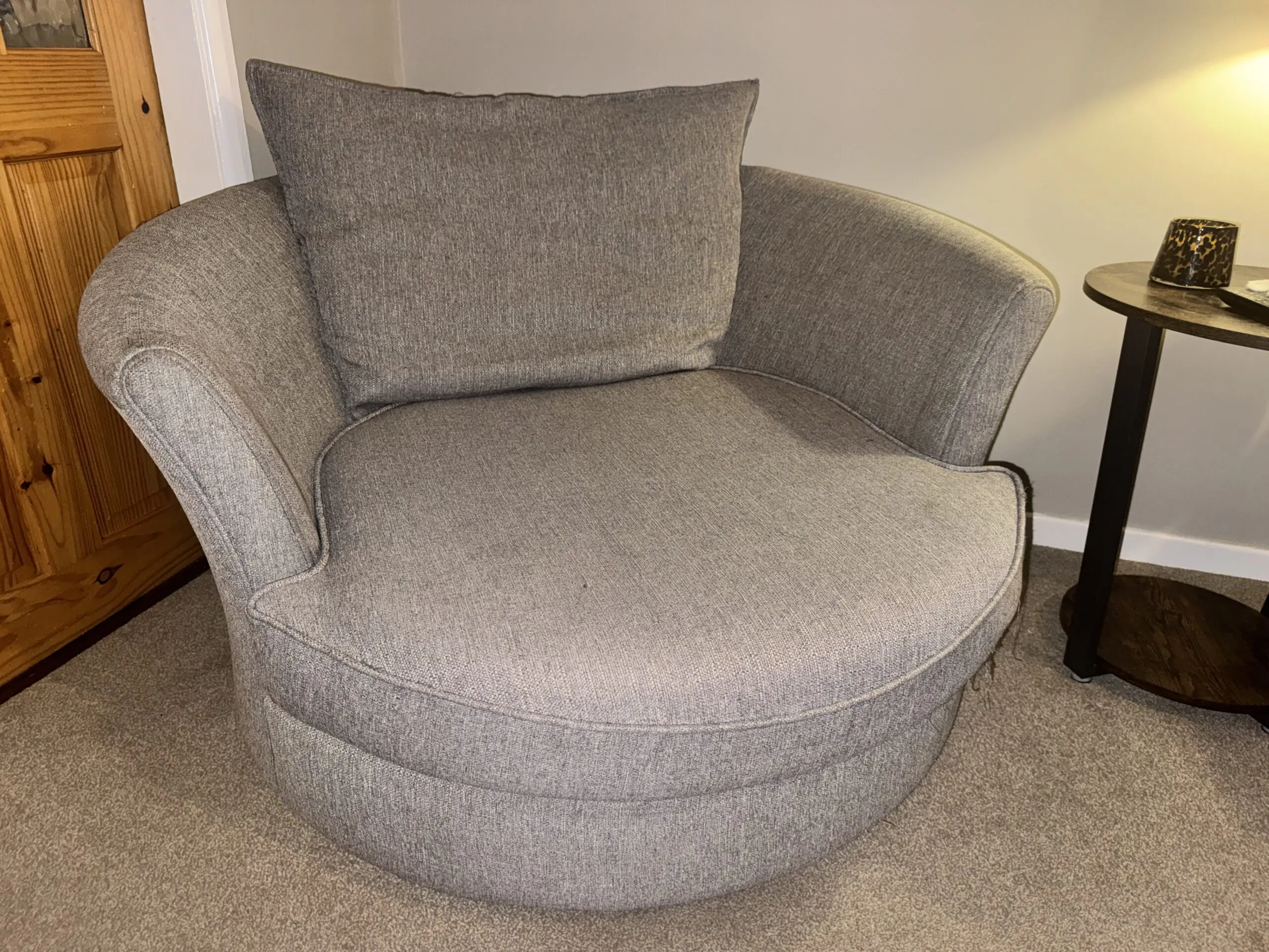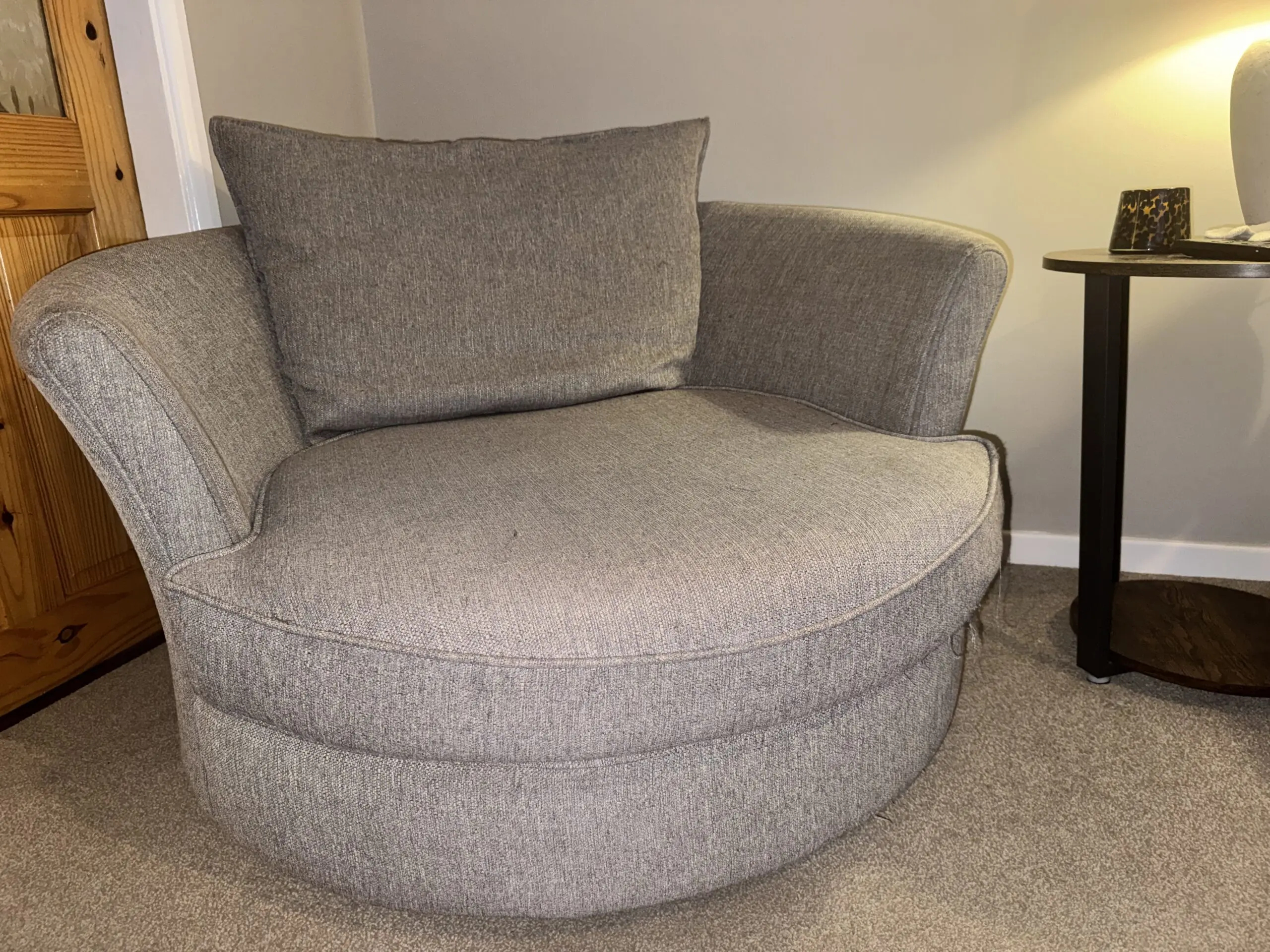 Grey corner sofa with removable covers, good condition. Swivel chair also with removable covers in good condition. Footstool can be included but not photographed. Still very comfortable, selling due to colour scheme change.