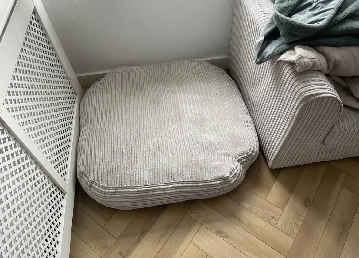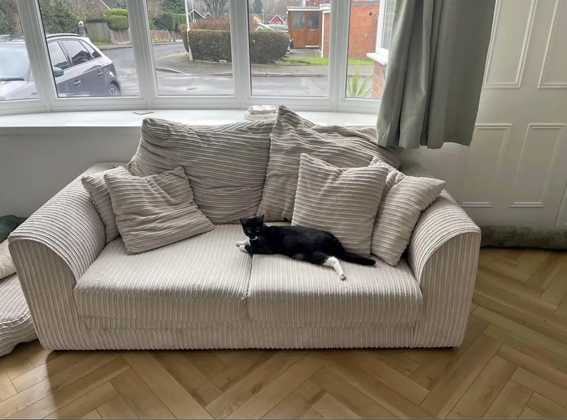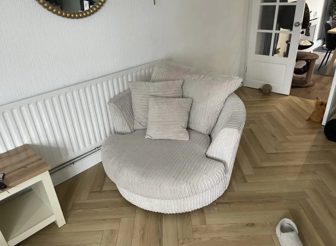 Beige/cream sofa set , 2 seater spinny chair and puff ( see pictures for defects )