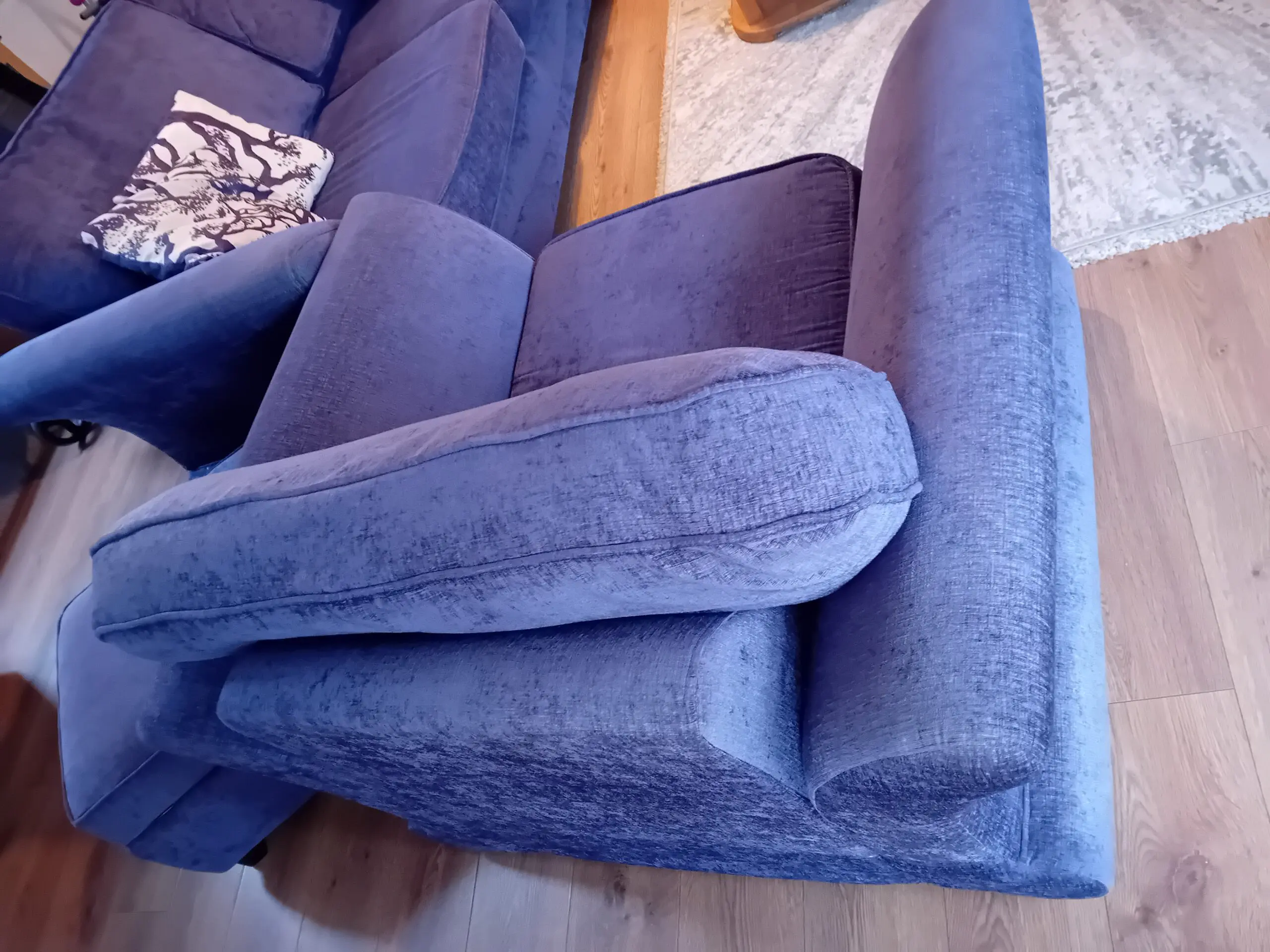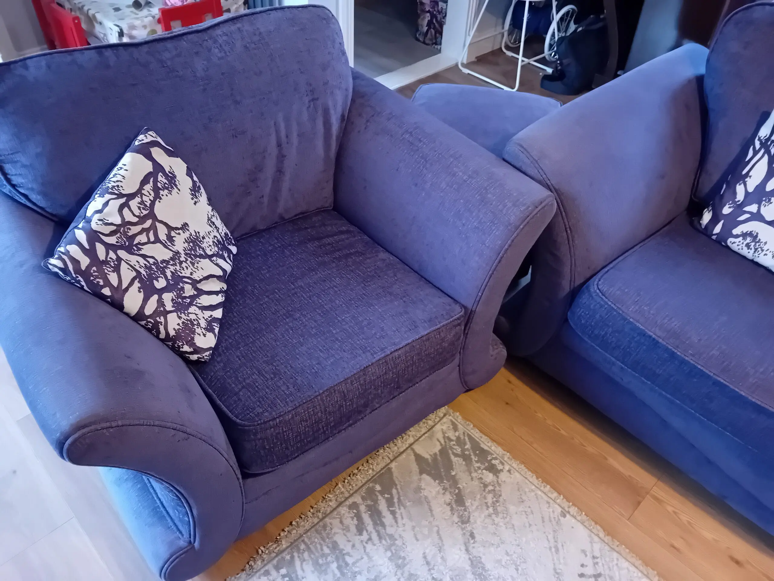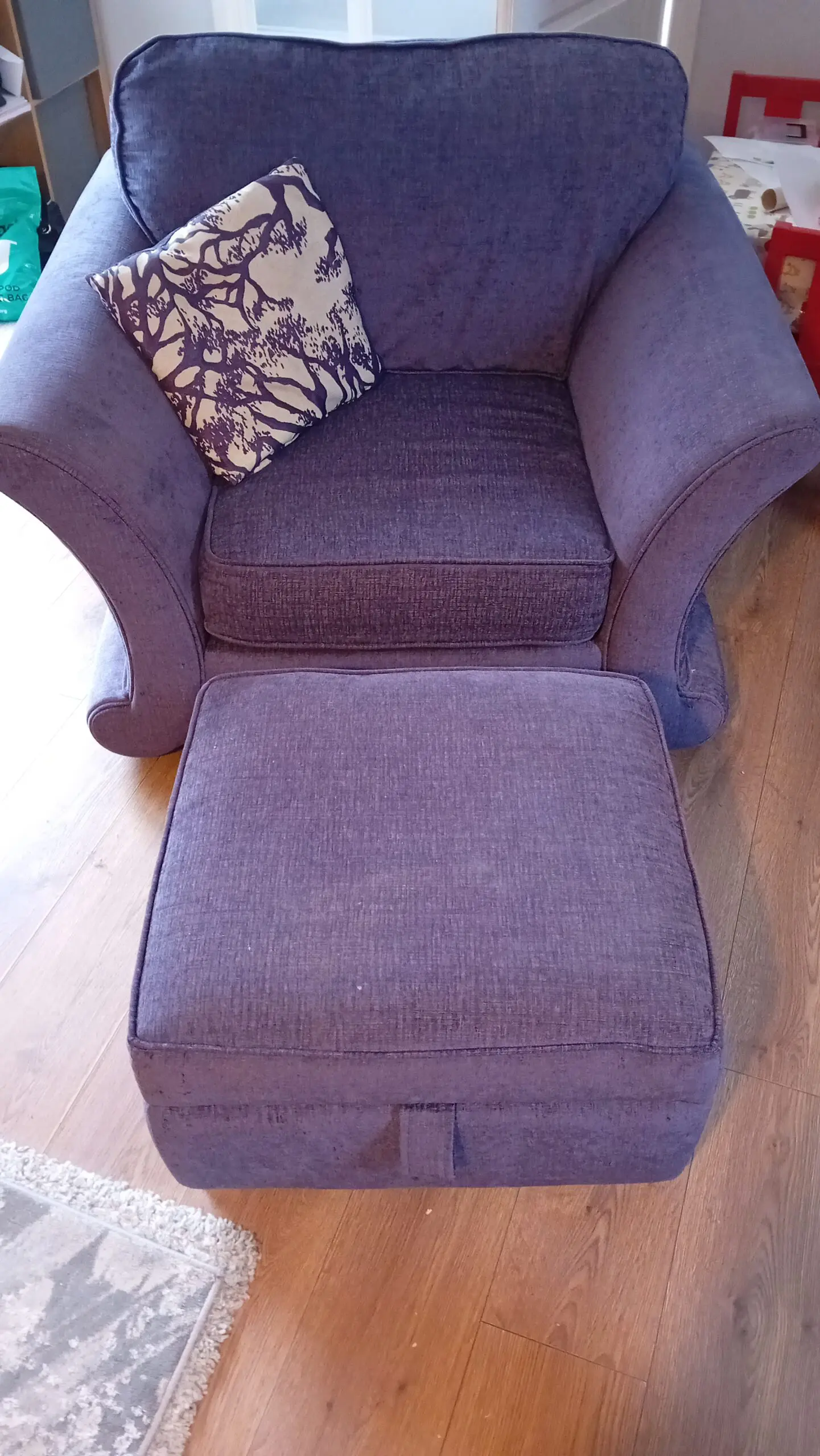 Luxurious DFS 3/4 seater sofa with Foam seats, 4 matching/contrast cushions, a plush sizable chair and matching footstool/storage.