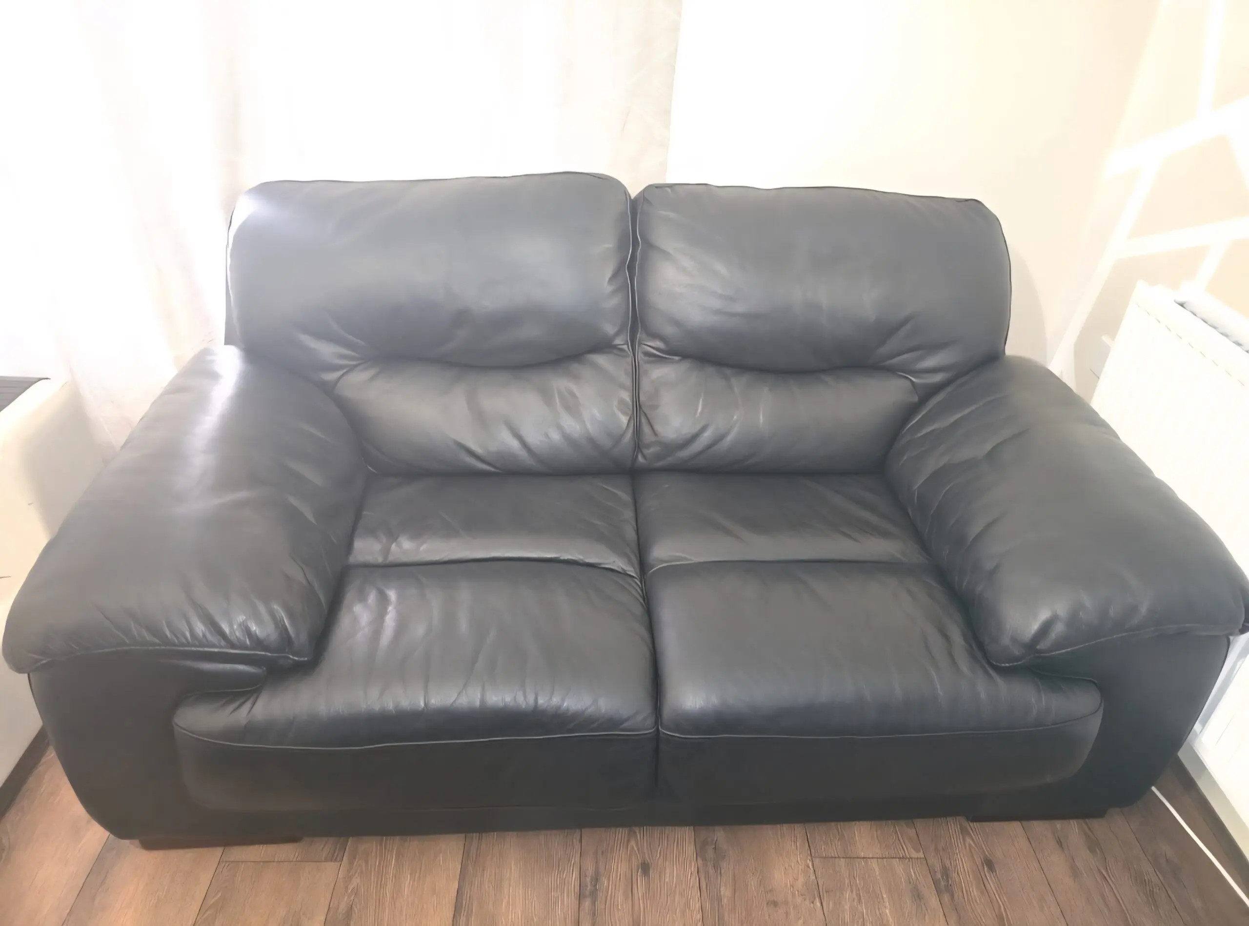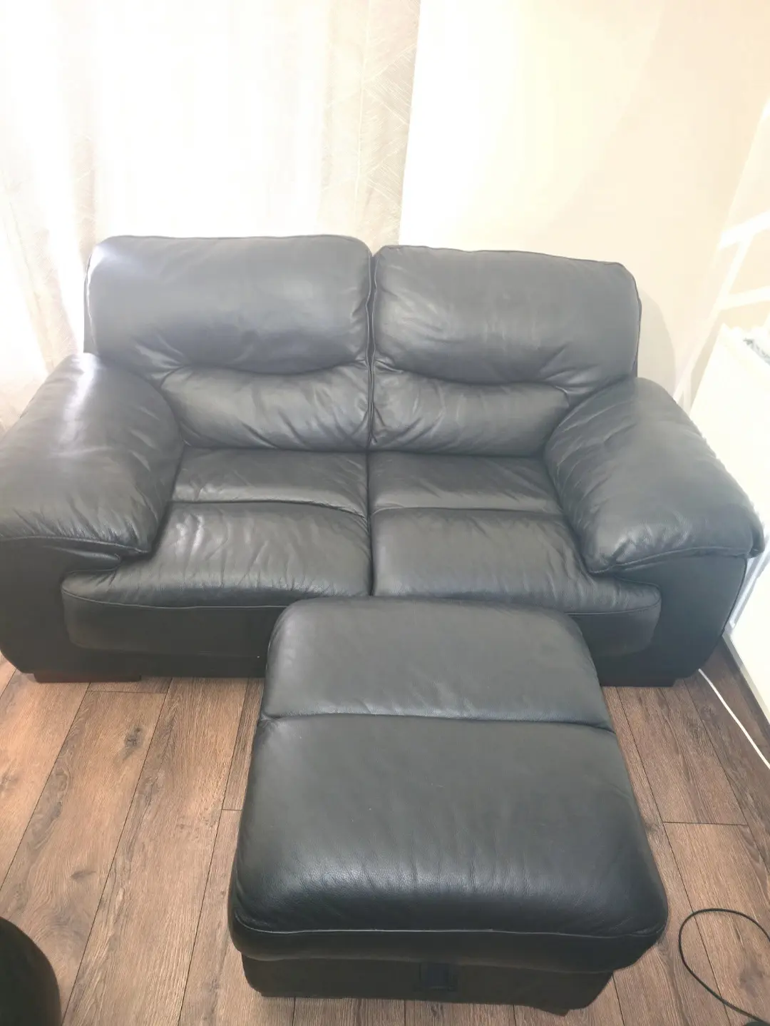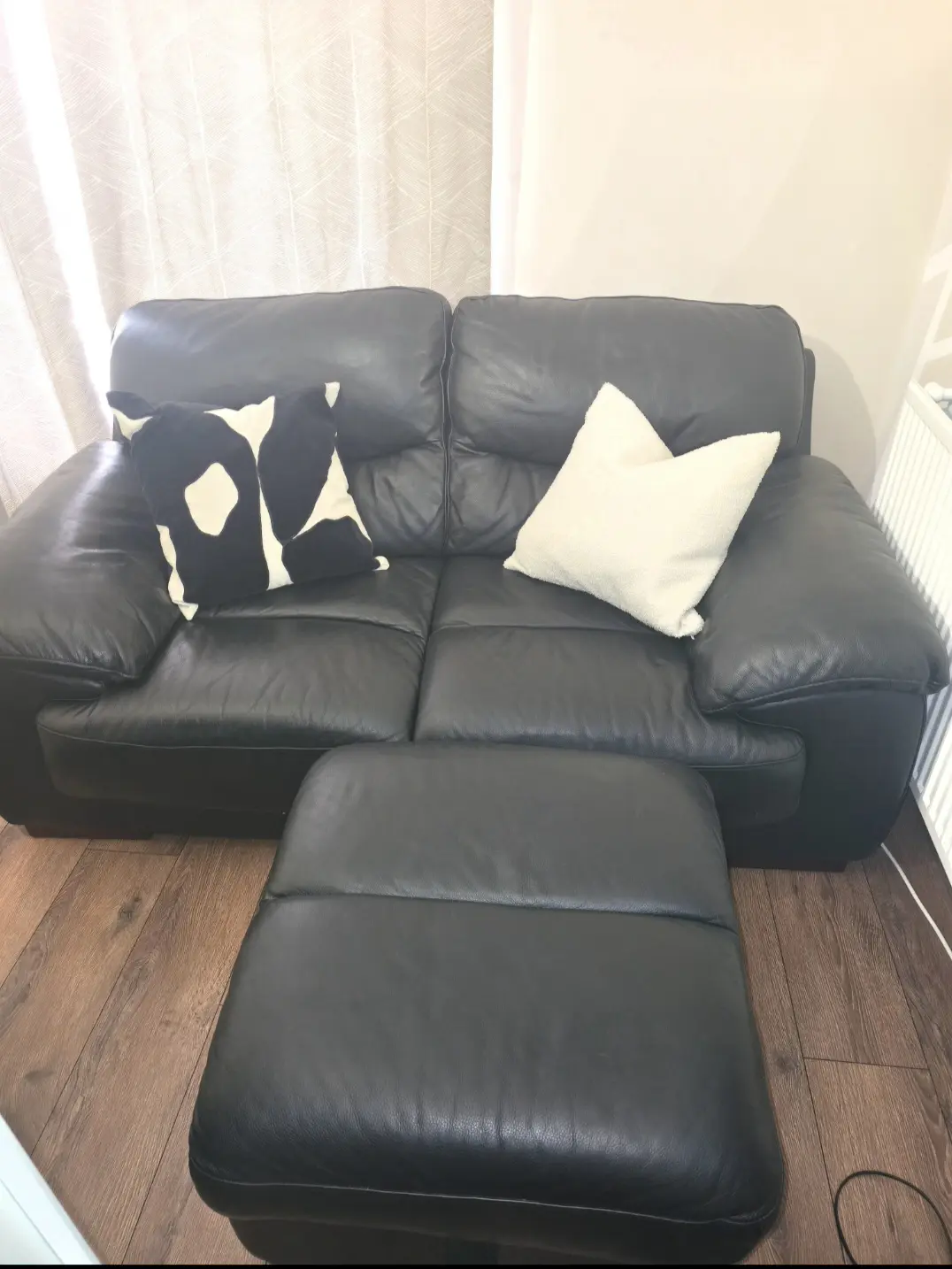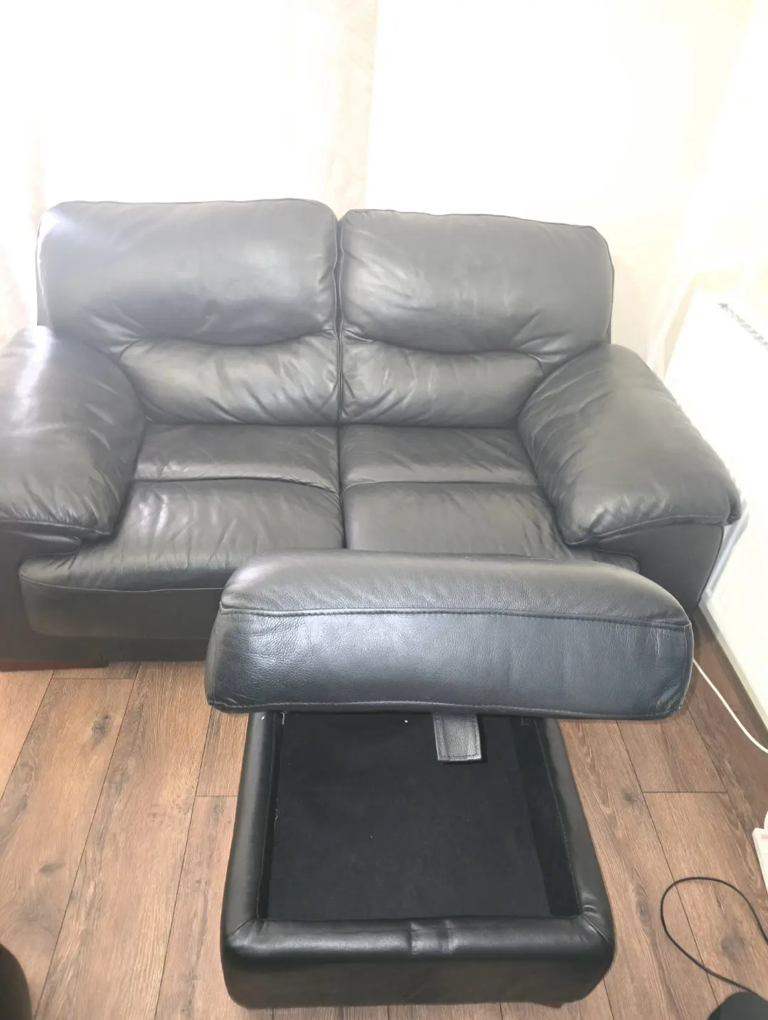 Selling two 2-Seater Sofas and one Storage Pouffe. They are black in the new club leather; a thick leather which upstands daily use. Smoke and pet free environment.