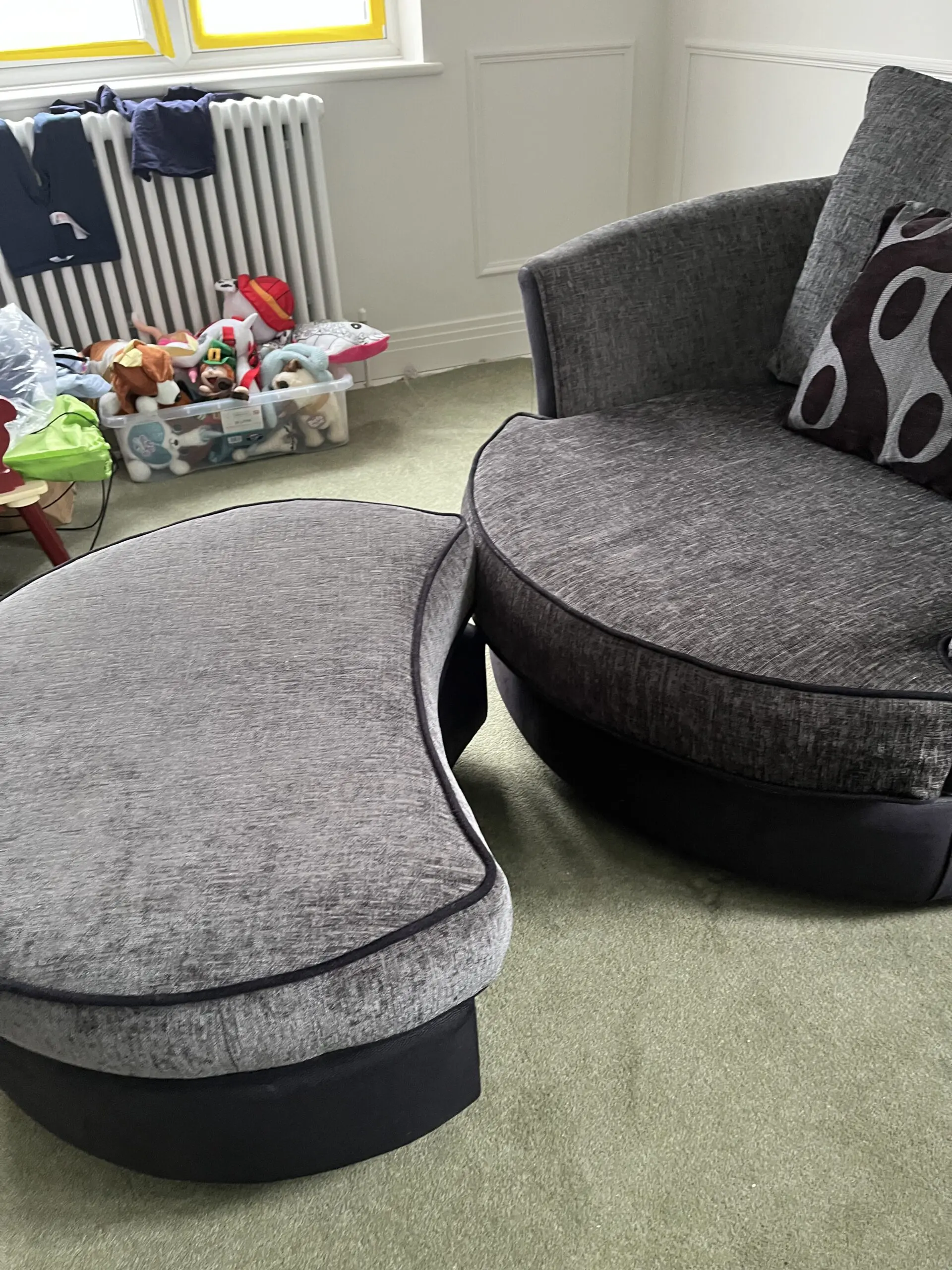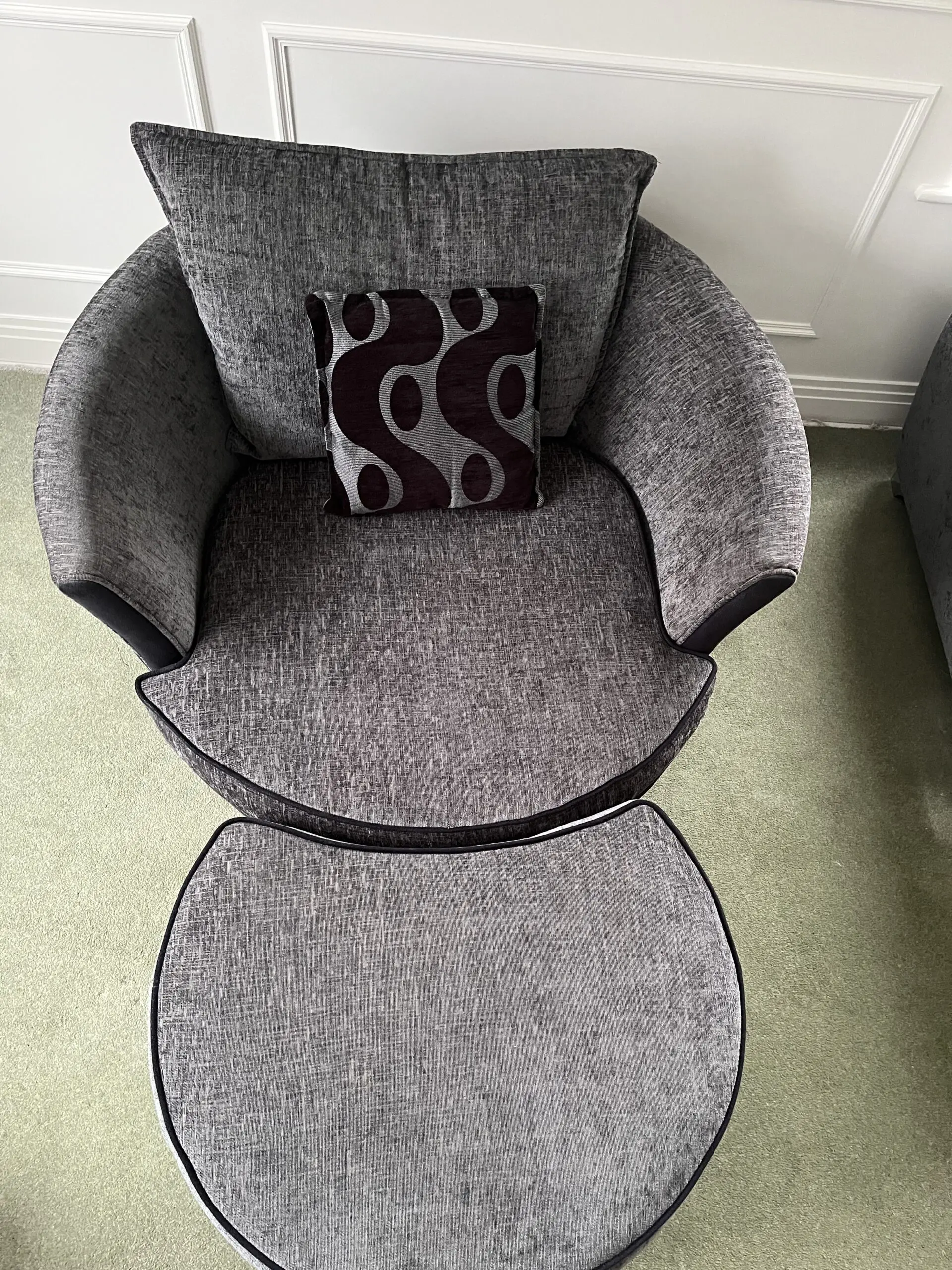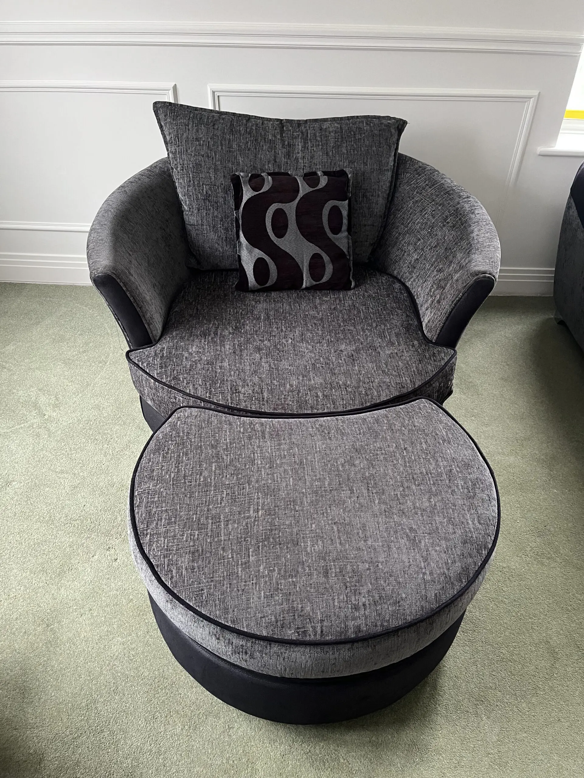 4 seater corner sofa in grey and black with additional decorative cushions. Matching love seat (it spins around!) with additional decorative cushion. Matching foot stool.