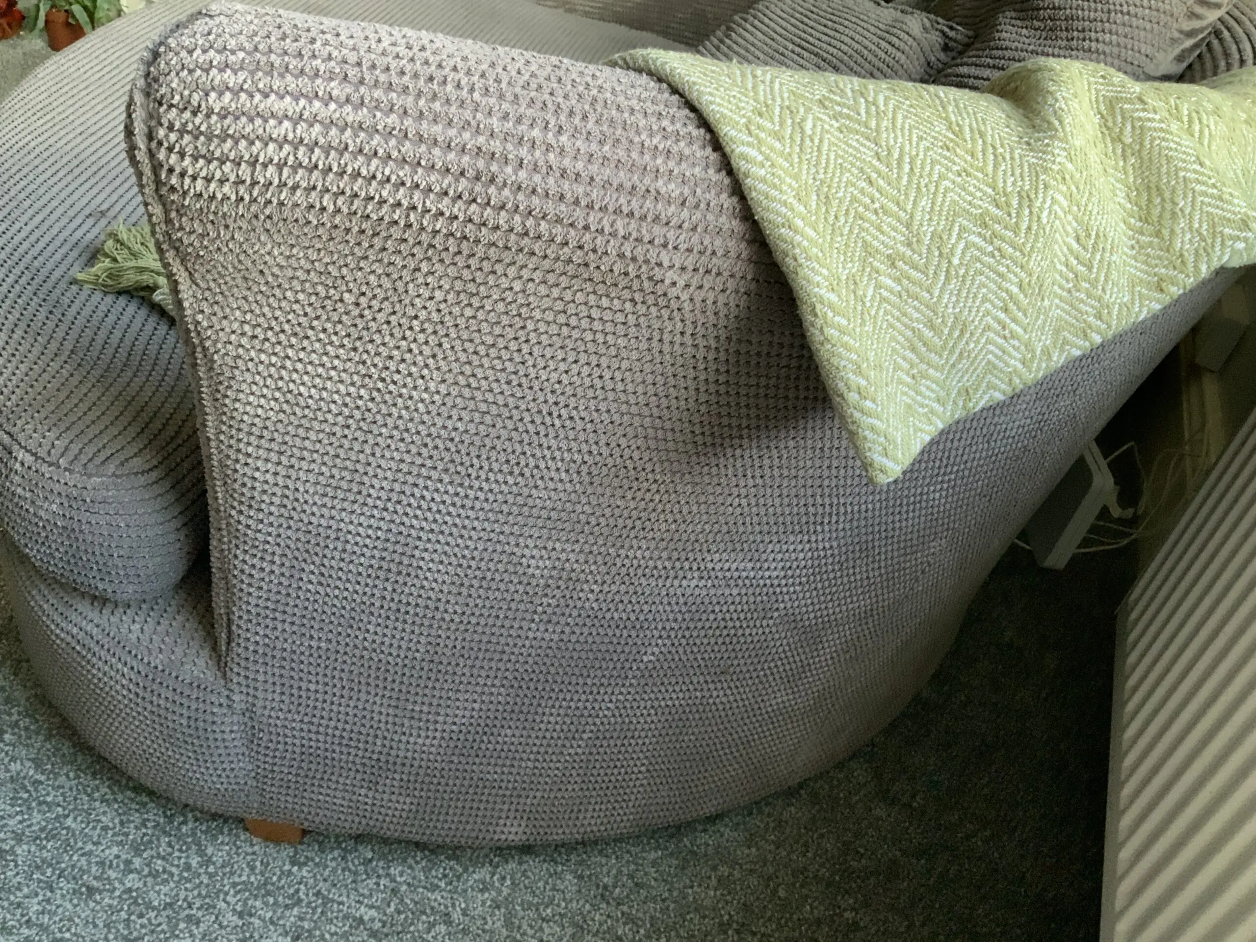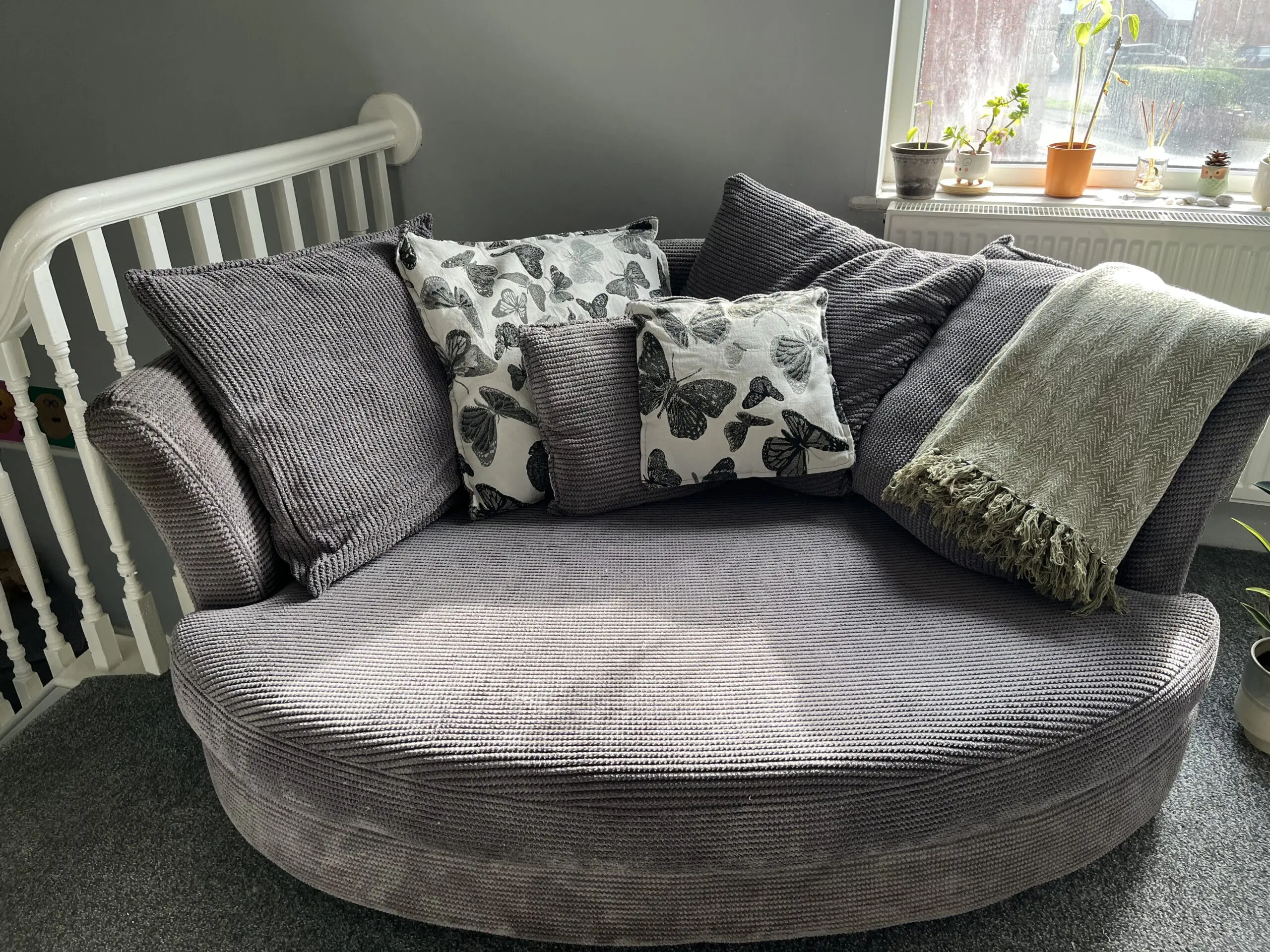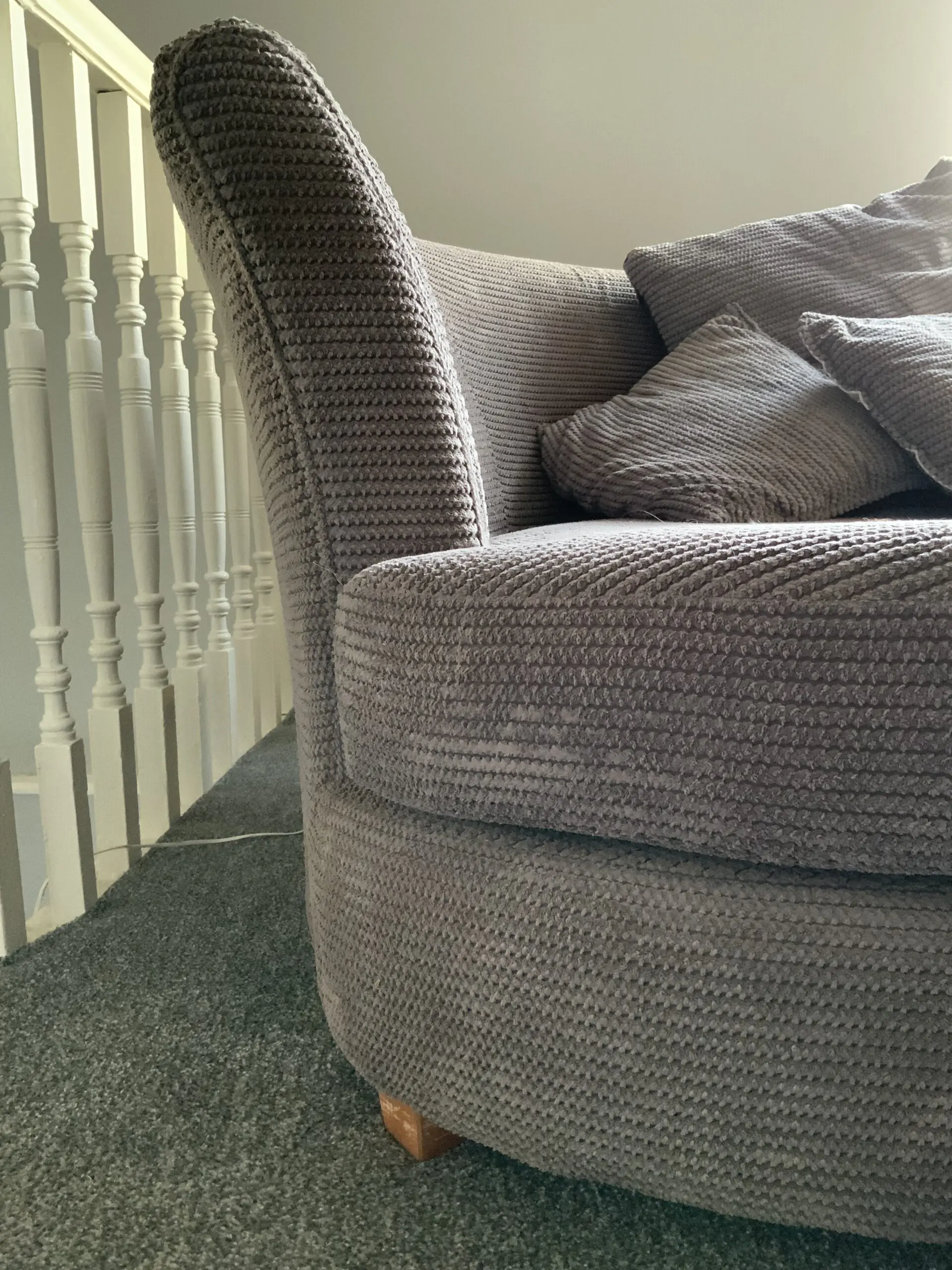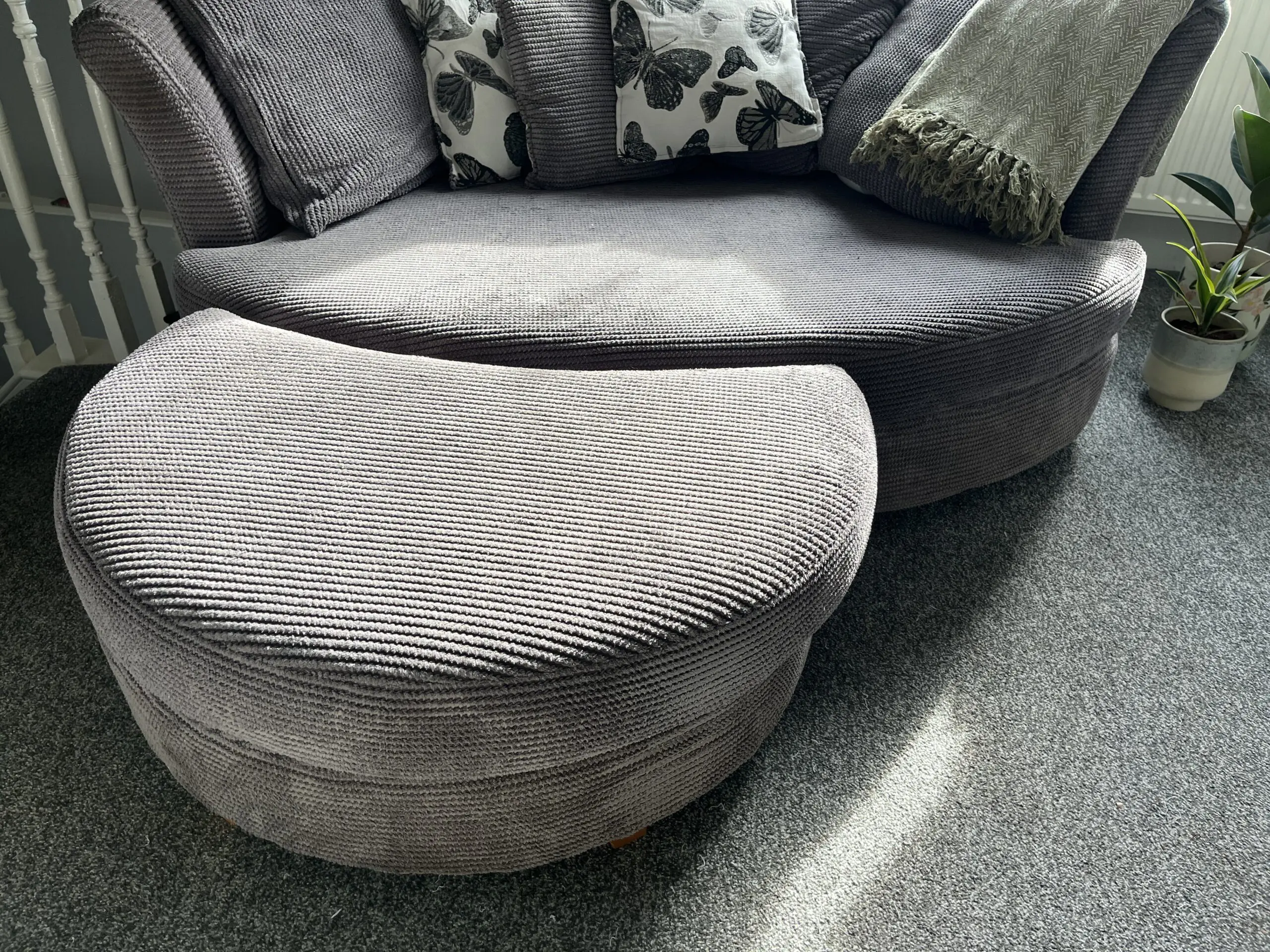 A DFS grey fabric cuddle sofa, which comes with six cushions and a footstool. The sofa and footstool have been in storage for 2 years away from damp and light.