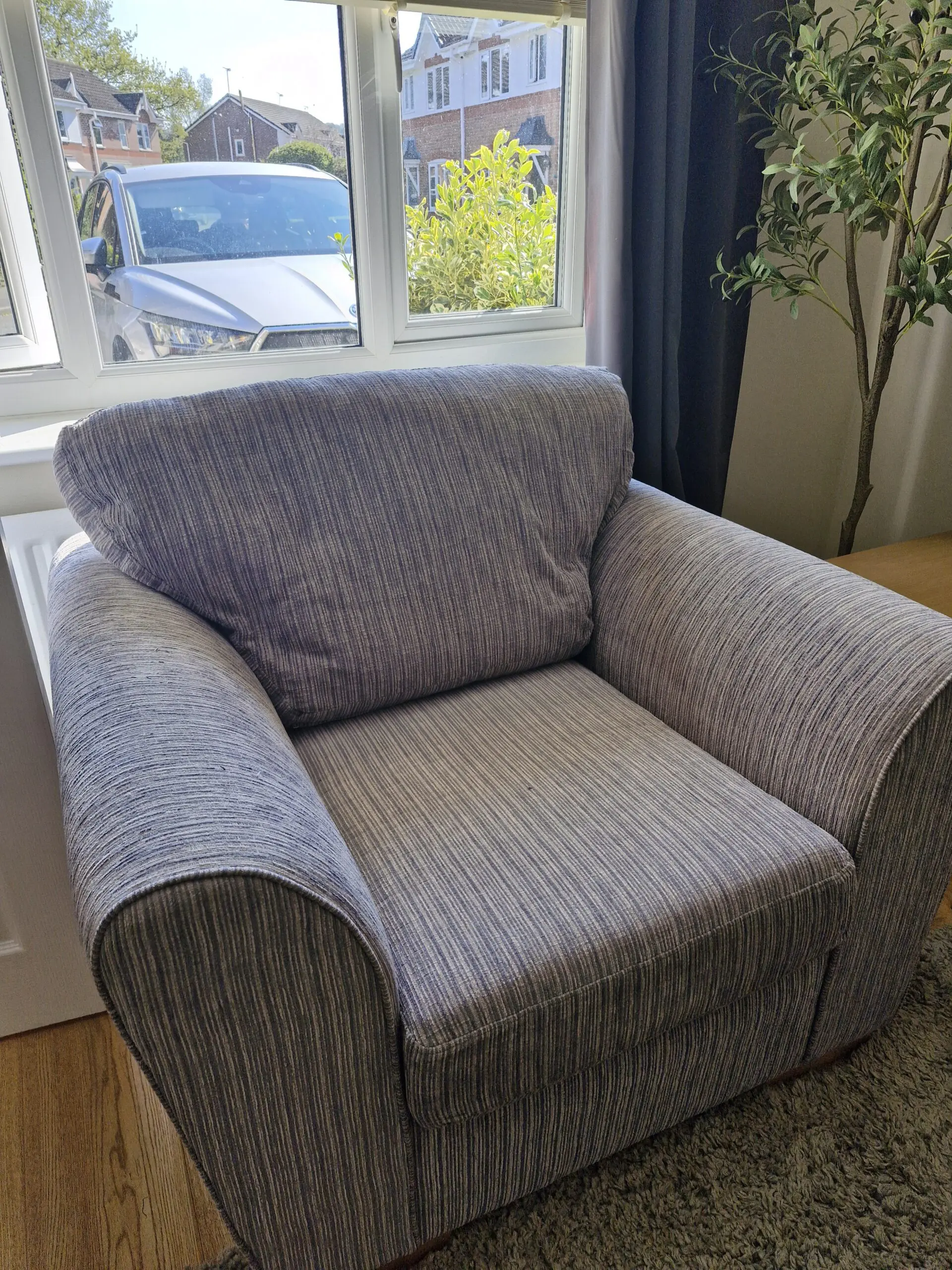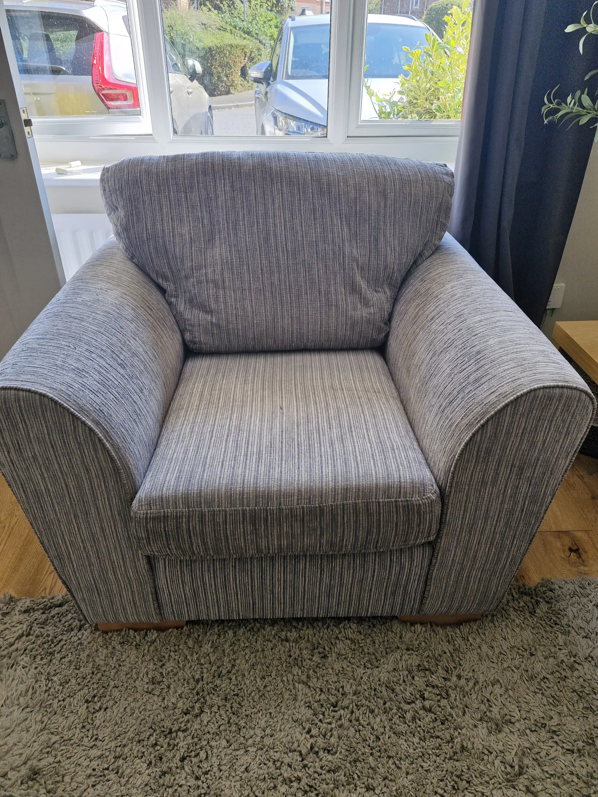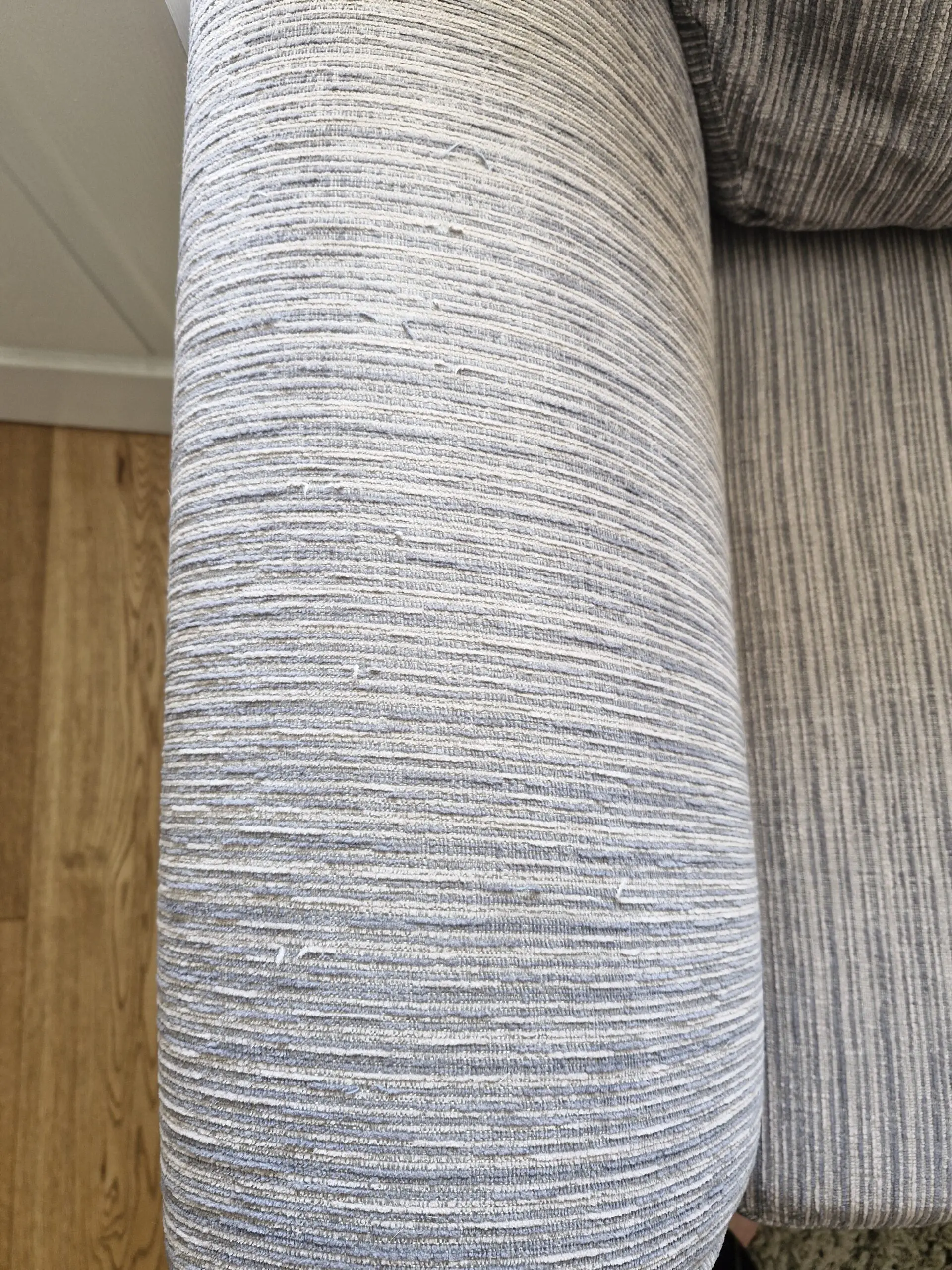 Light feet option and paid extra for foam seat cushions for less plumping! Comes with 15 year guarantee for frame and springs and 5 year Sofacare policy. Slight snagging on one armrest (as seen in pic) but loose threads could probably be trimmed with sharp scissors. Otherwise lovely used condition, still available in DFS if you want to get more info off the website.