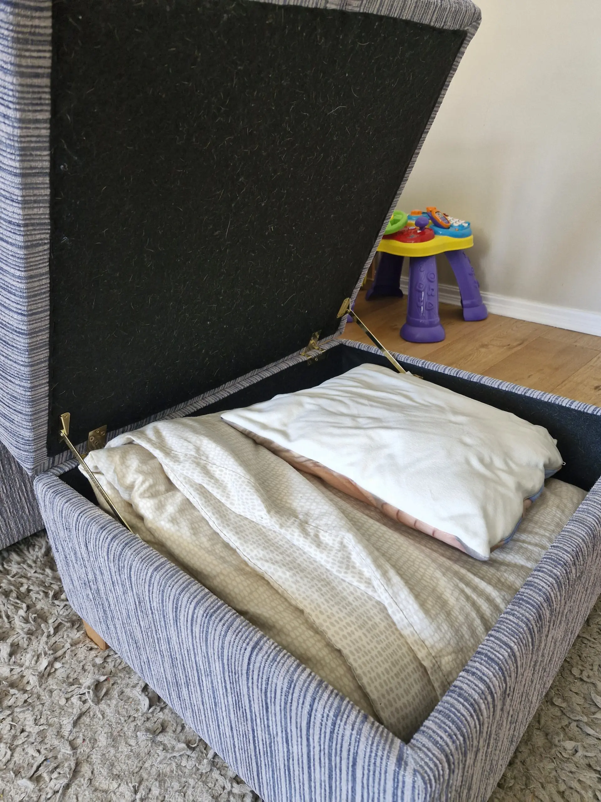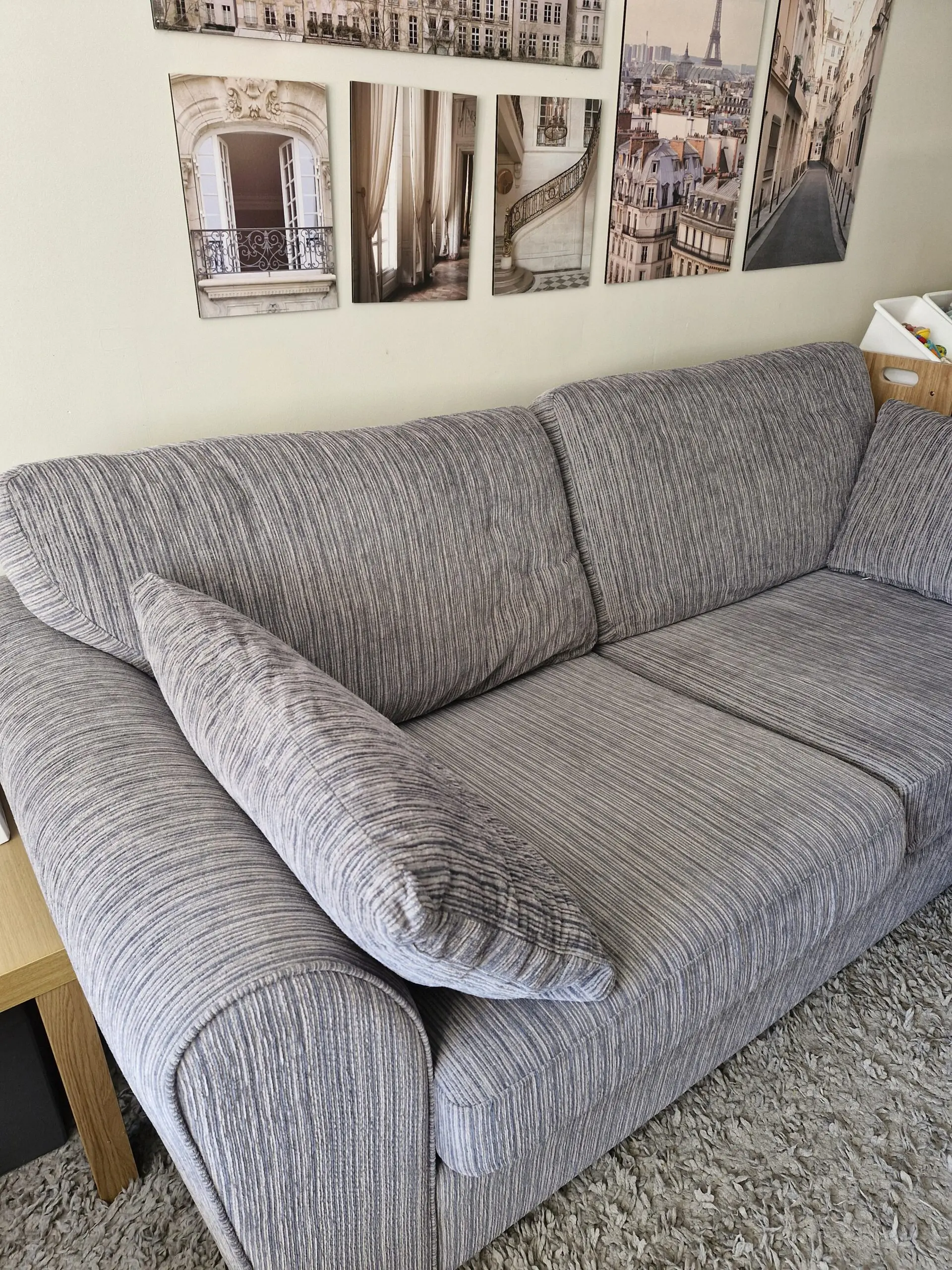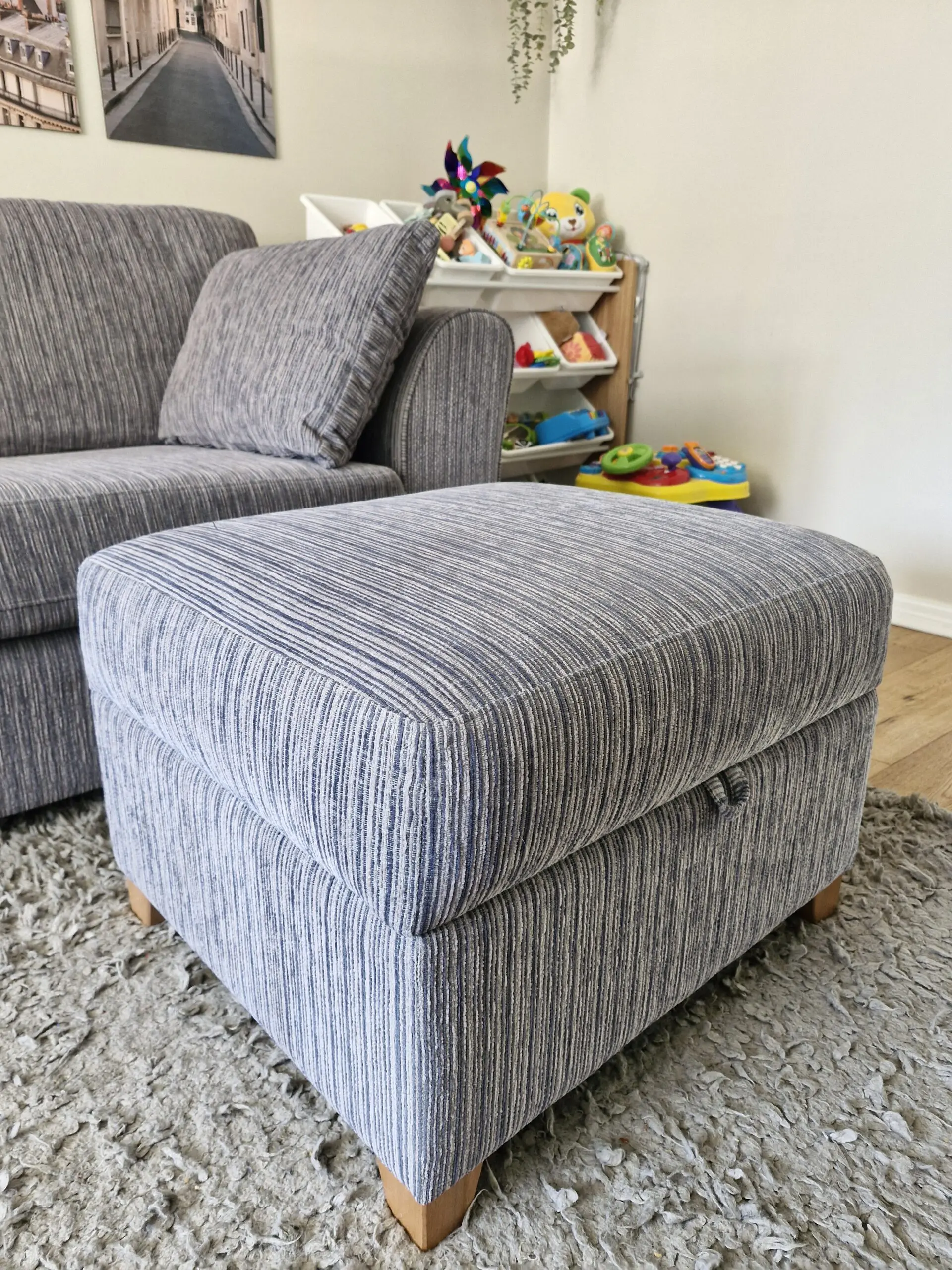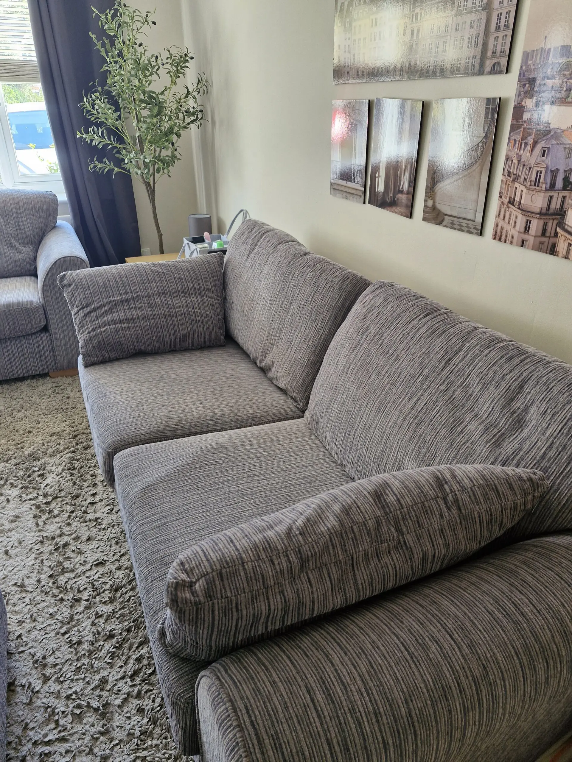 Bought new June 24 so less than 12 months old. Tatum fabric in grey & steel combination