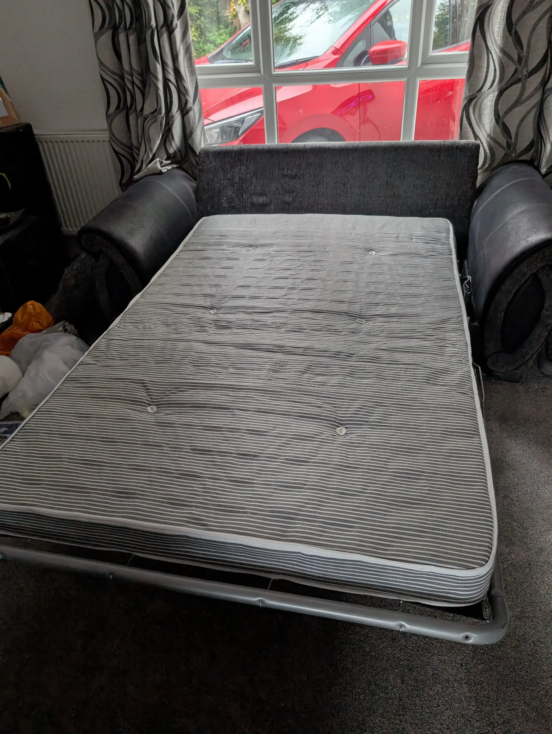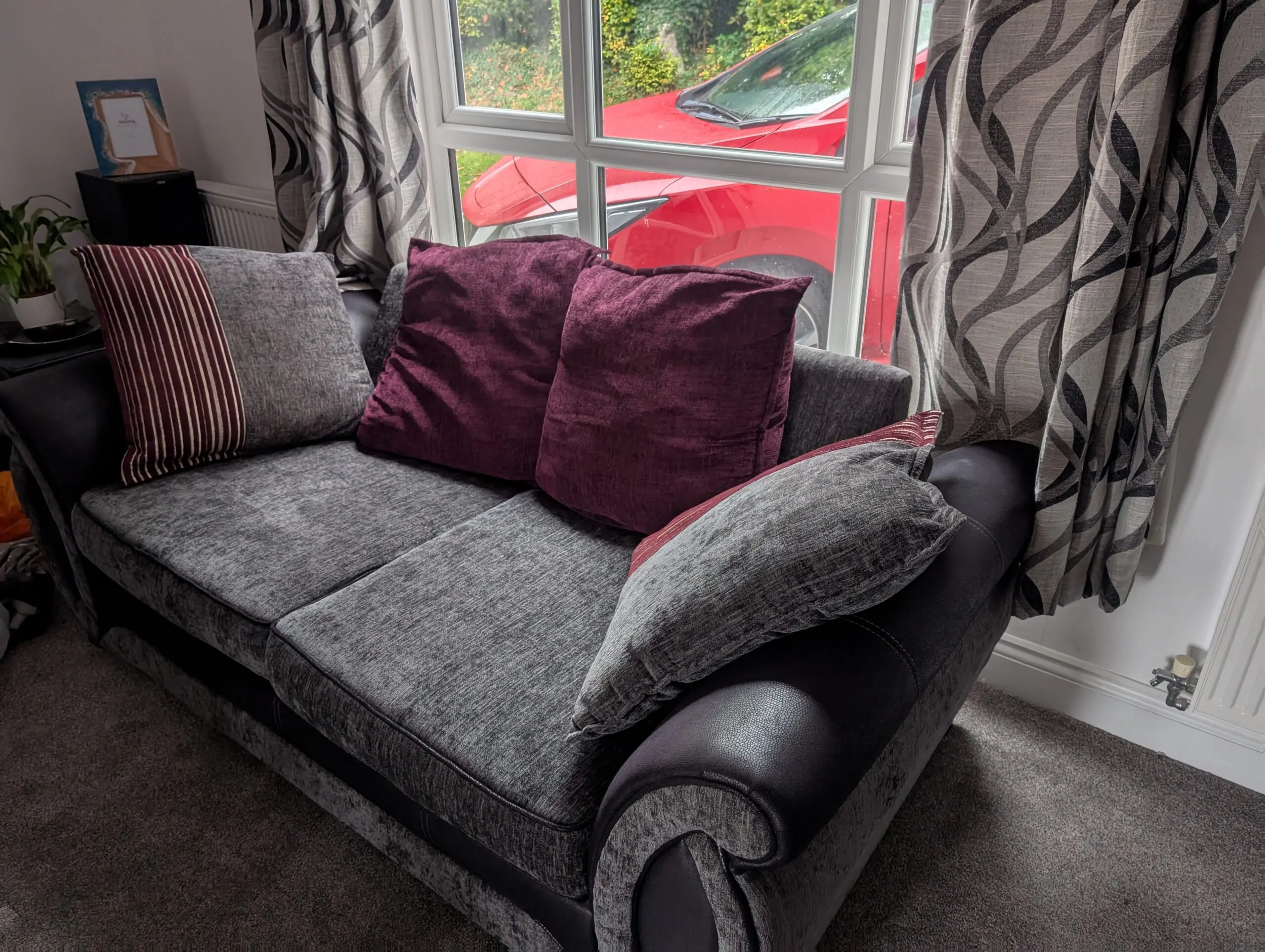4 seater and 3 seater sofa set in grey with purple and grey cushions. 3 seater sofa is also a small double sofa bed. Sofa’s are both in overall good condition for their age. 4 seater has discoloration on one arm from the sun but otherwise there is no damage or marks to either sofa.