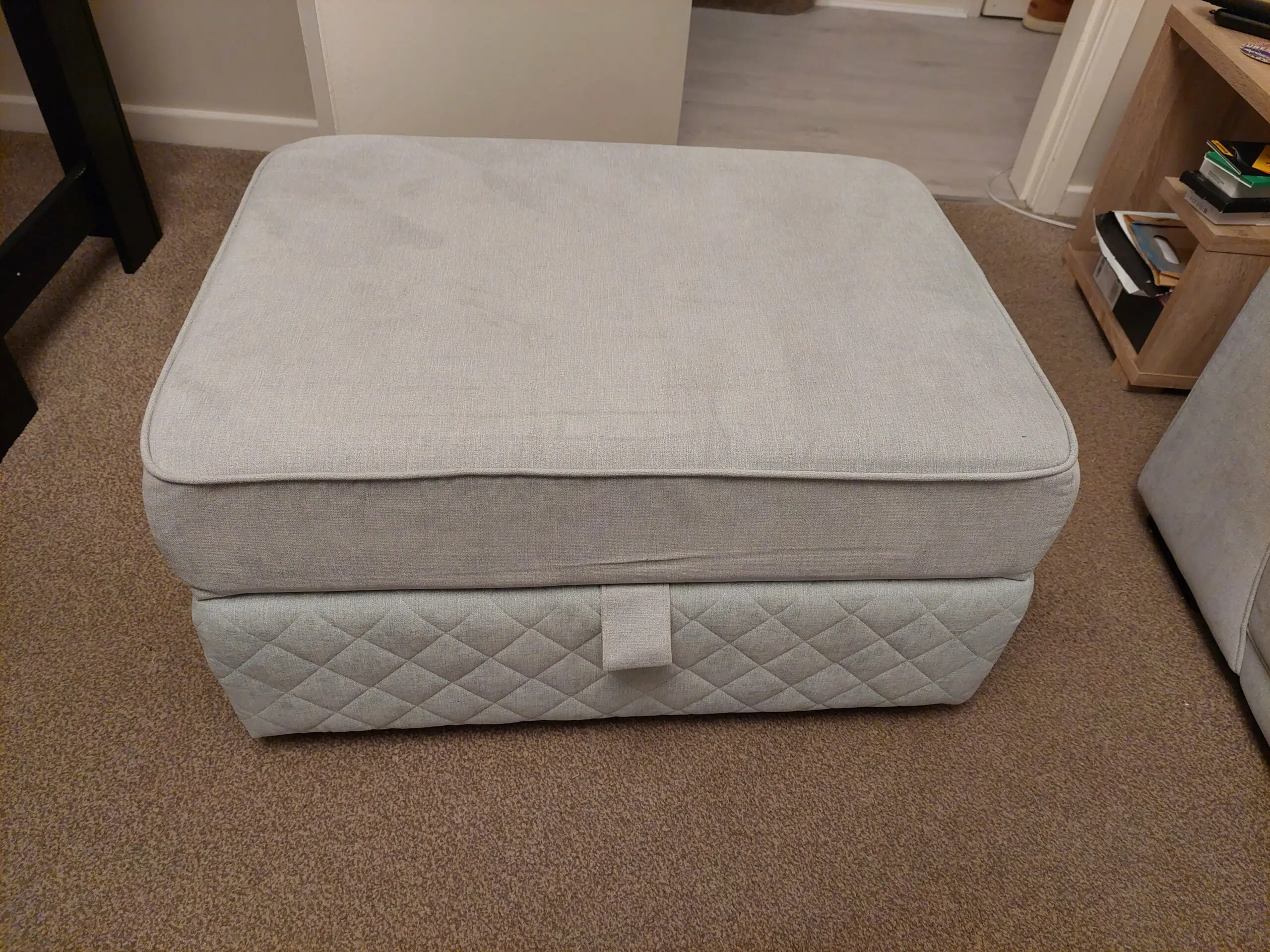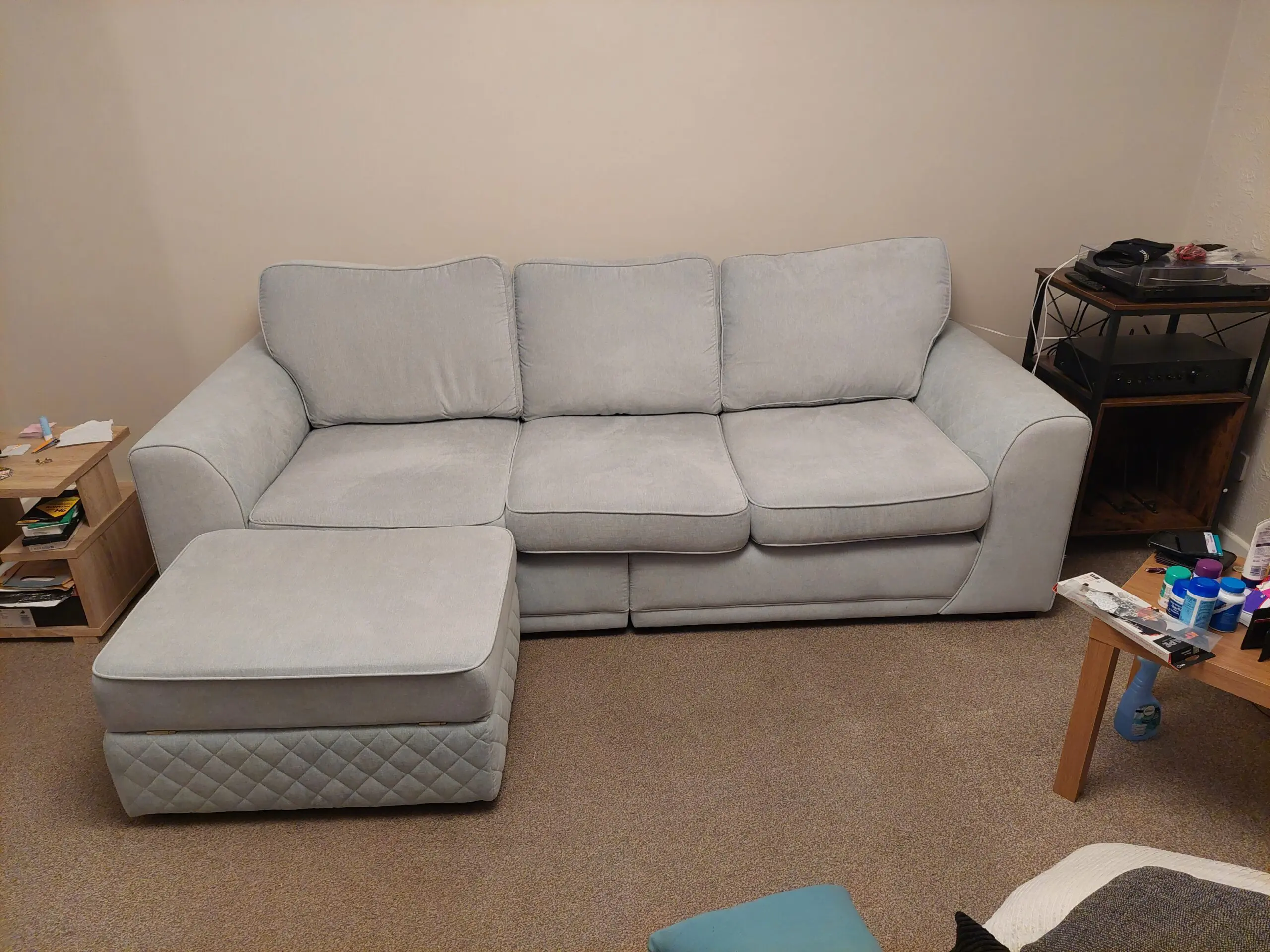 DFS Light Blue Orka 4 seater split seatee with large storage footstool. Bought brand new in July 2025 so only a few months old. From a smoke free, child free, pet free house. Very good condition.