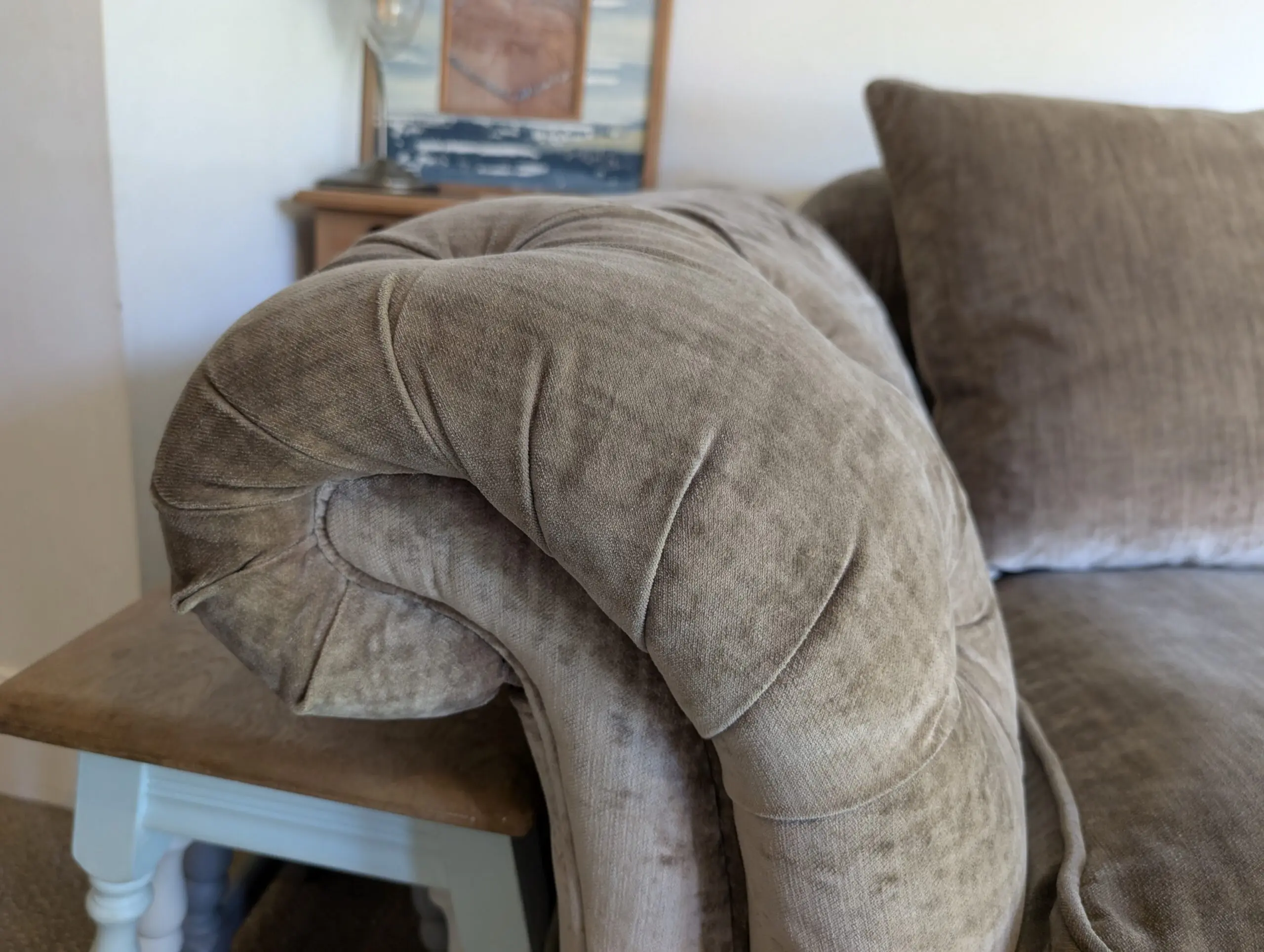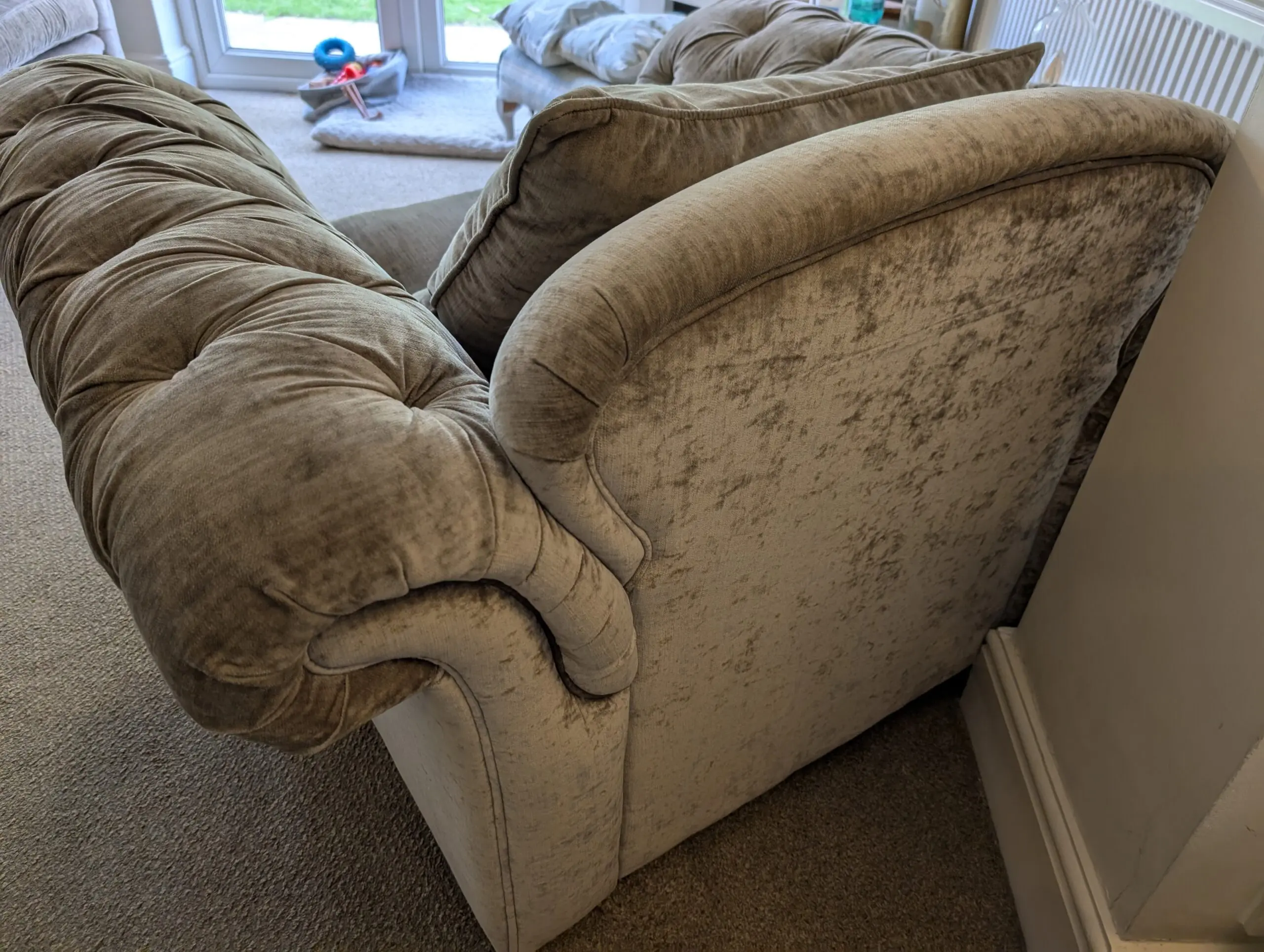 This is a 3/4 seater sofa and a 1 seater armchair from DFS , it’s from the lock leven range and looks great, I believe it’s called mink in colour which is closest to brown. It has been used and loved so may have some small marks but nothing nasty and would look great in any lounge !! The sofa is around 225cm wide, 110cm deep and 100cm high. The arm chair is around 128cm wide, 110cm deep and 88cm high. Comes with 3 pillow cushions. Any questions please ask. Collection only