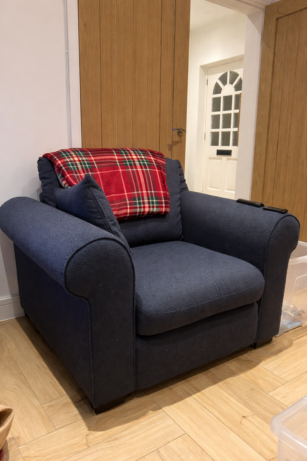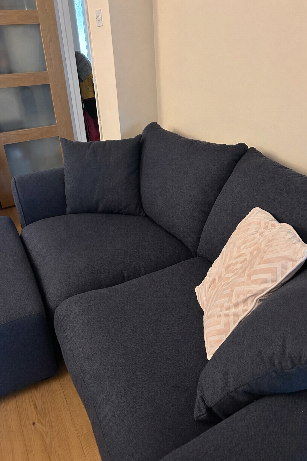 Large 3 seater, large 2 seater, single arm chair and large footstool all with high backs. Lovely and deep and comfortable! Brilliant condition