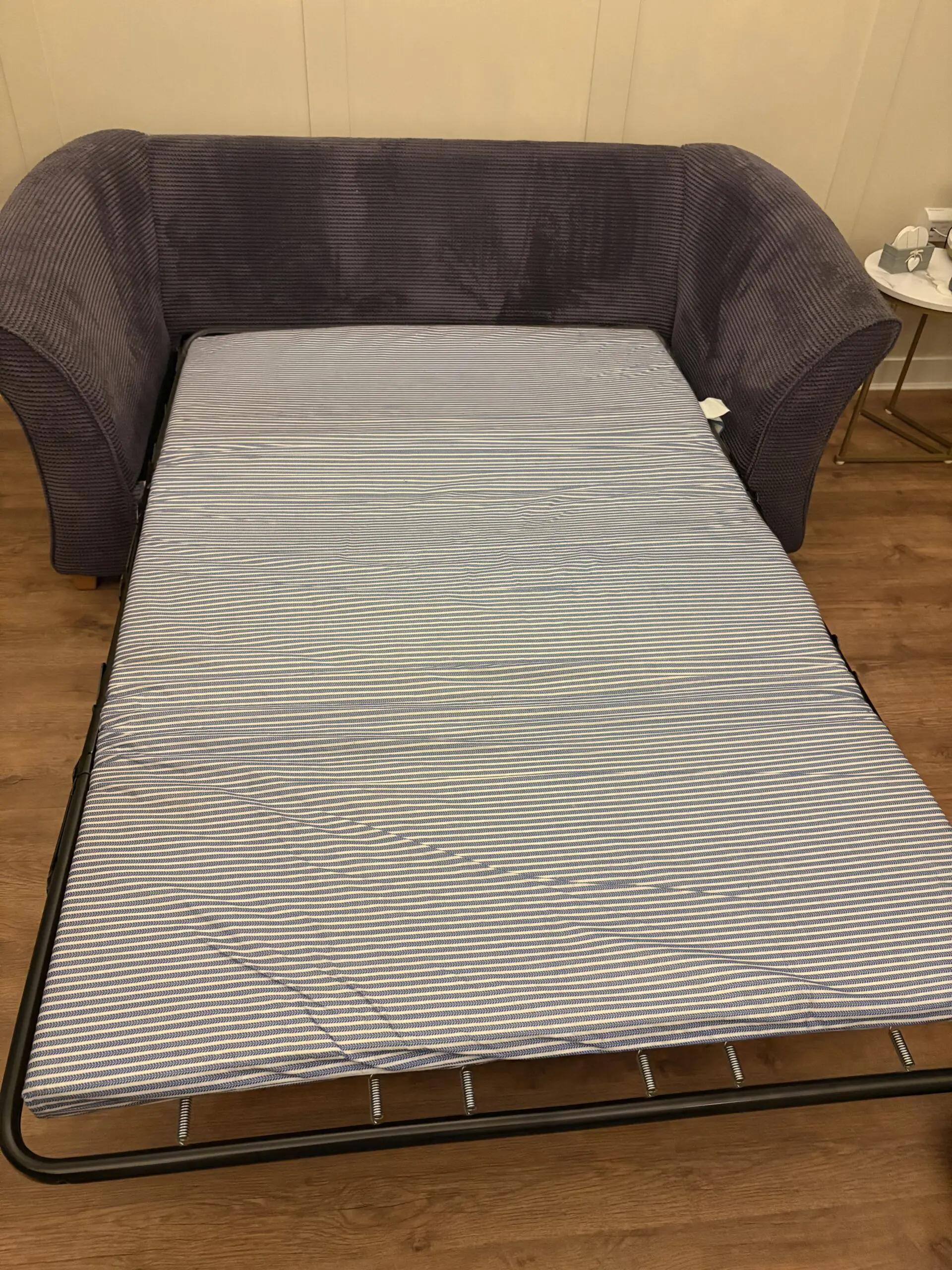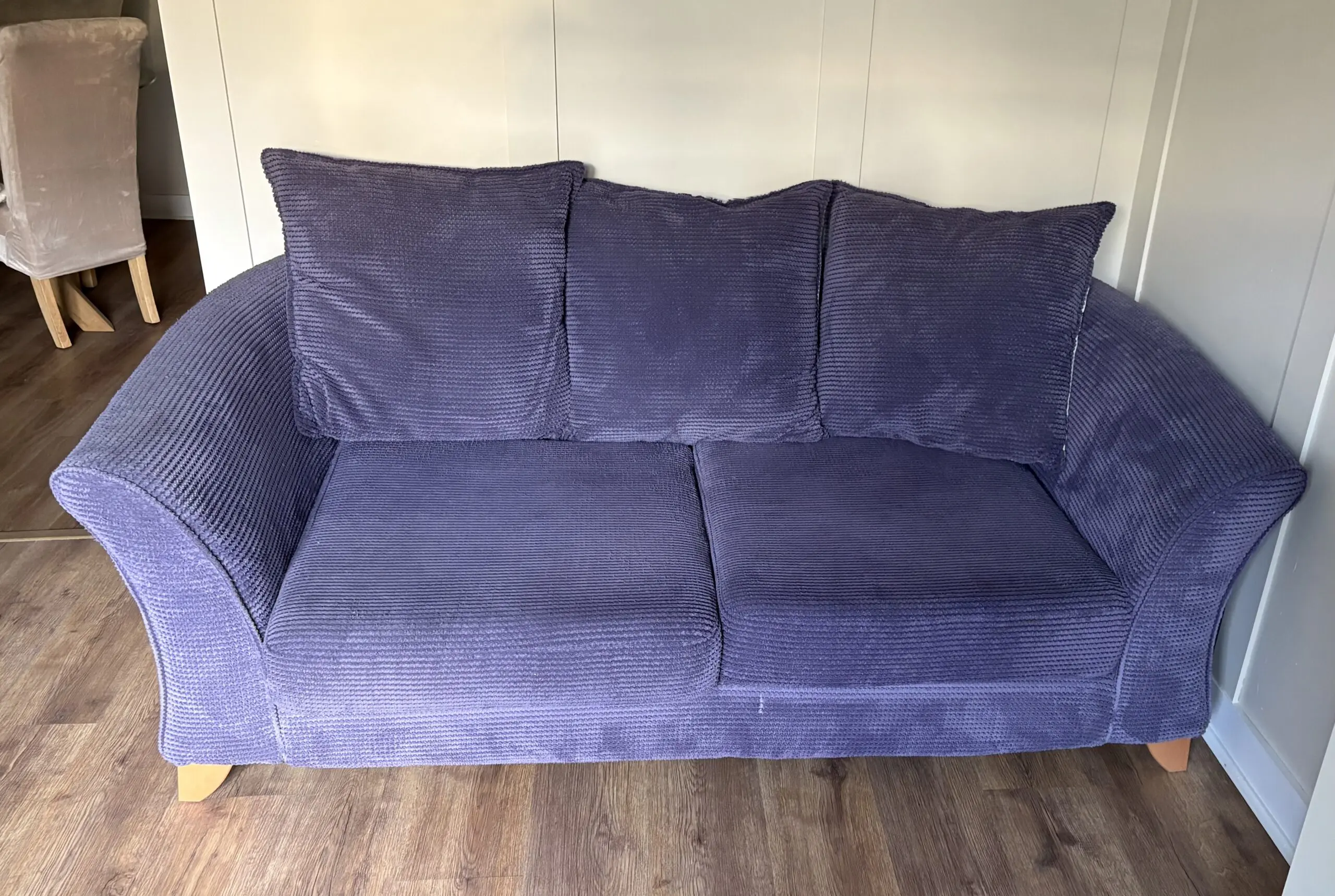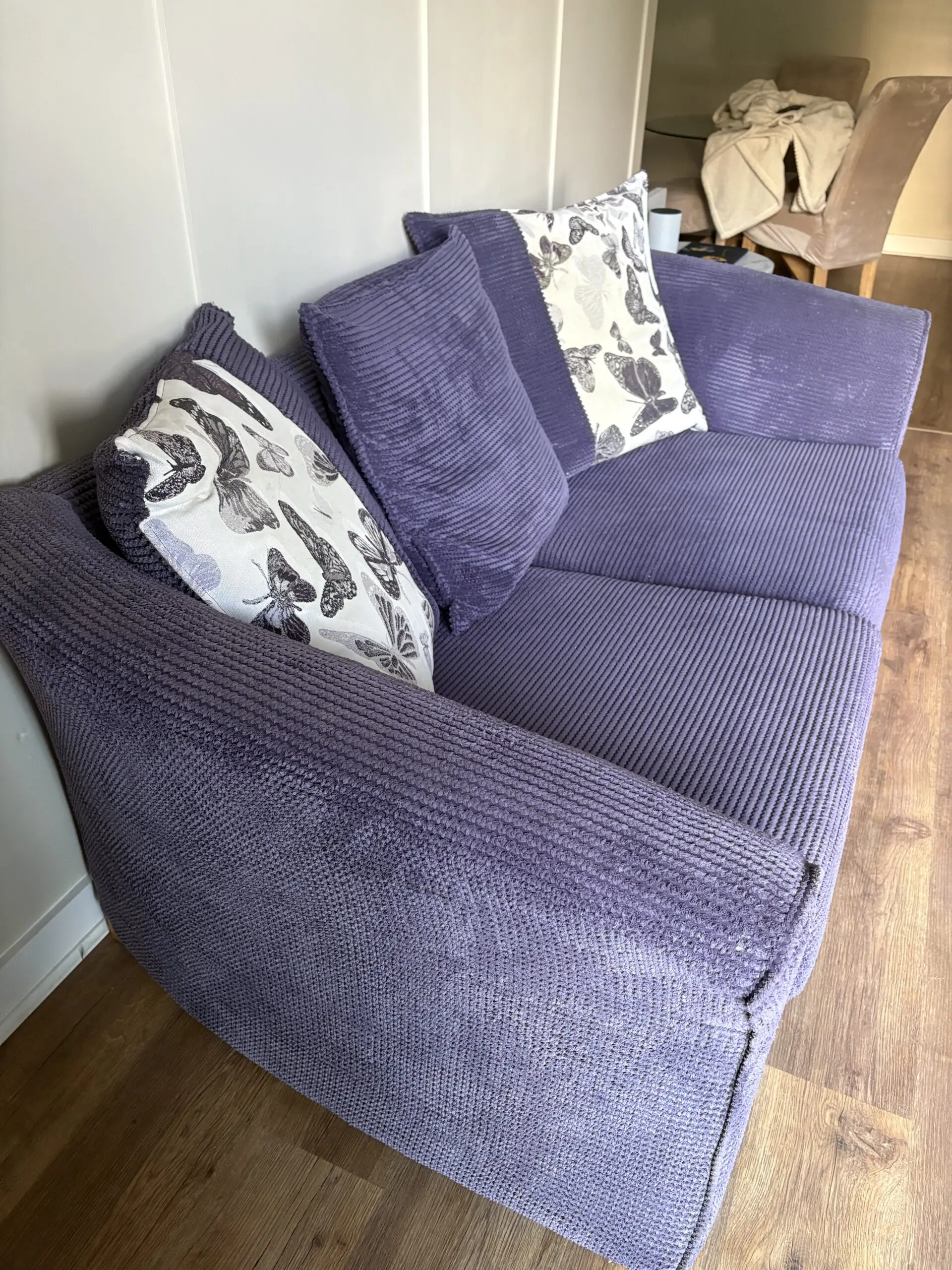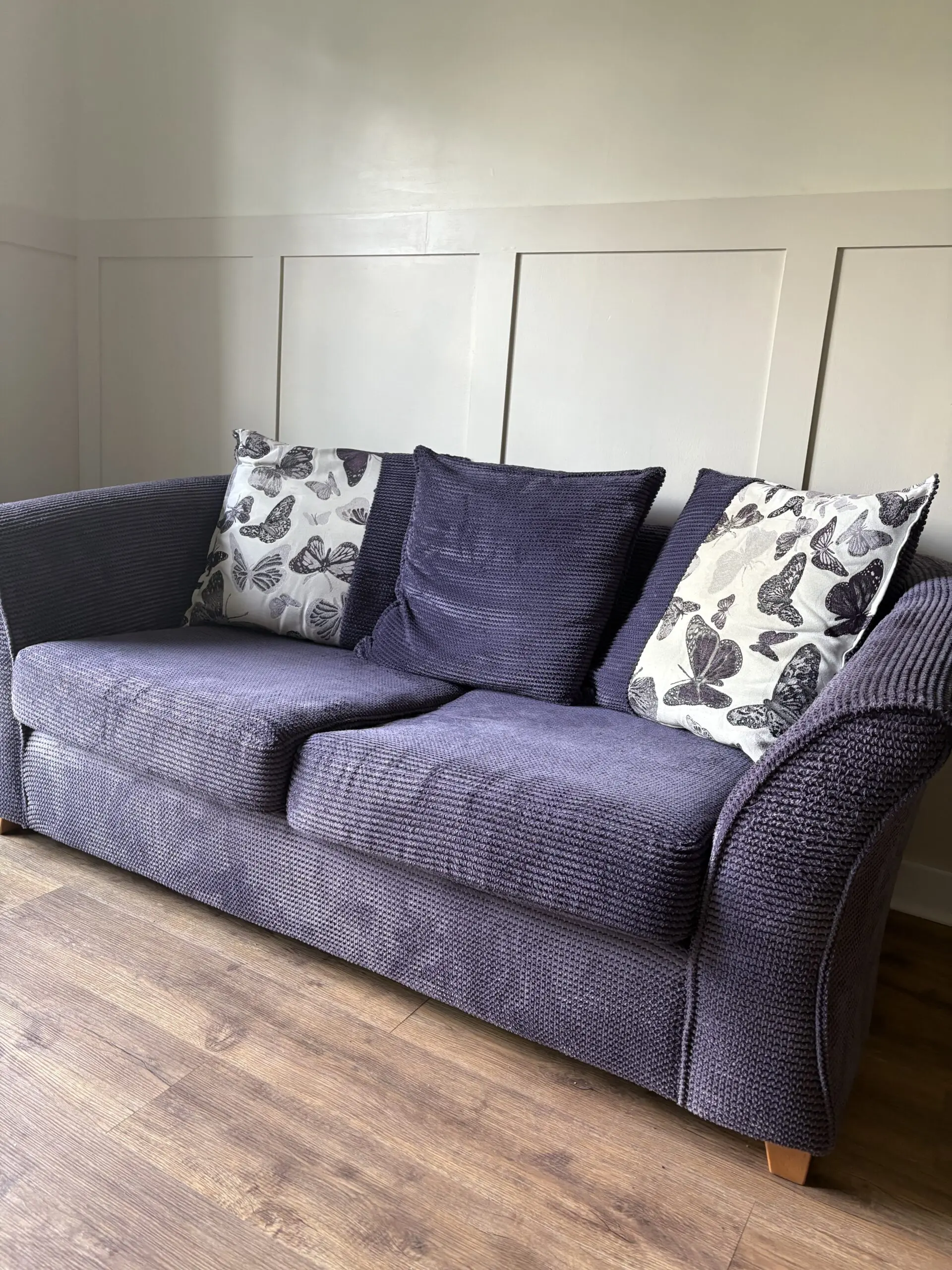 DFS quality 3 seater sofa bed. Metal frame pull out for a great size double. Purple ribbed fabric. 2 back cushions are double sided with either matching purple or butterfly design. Light oak feet.