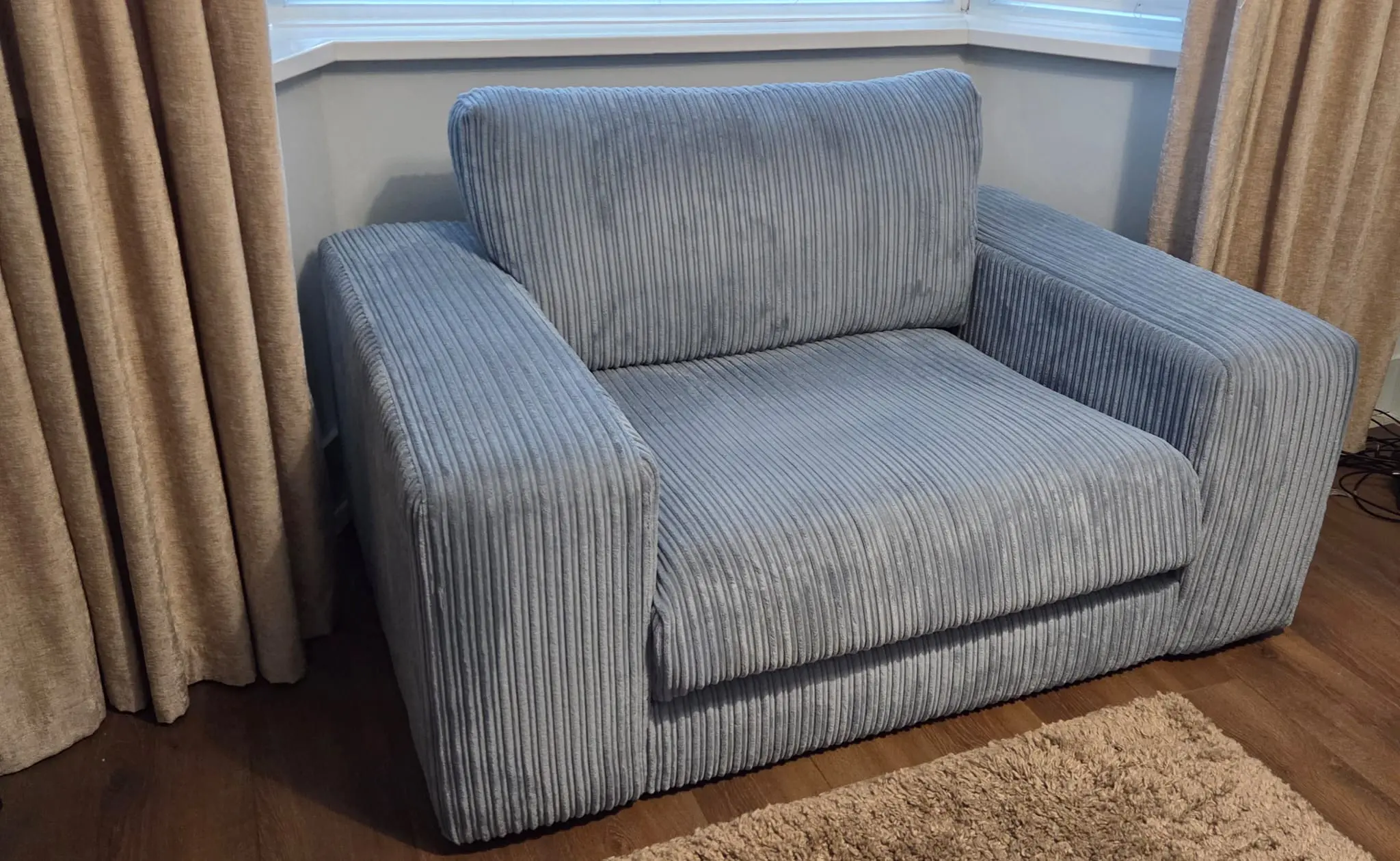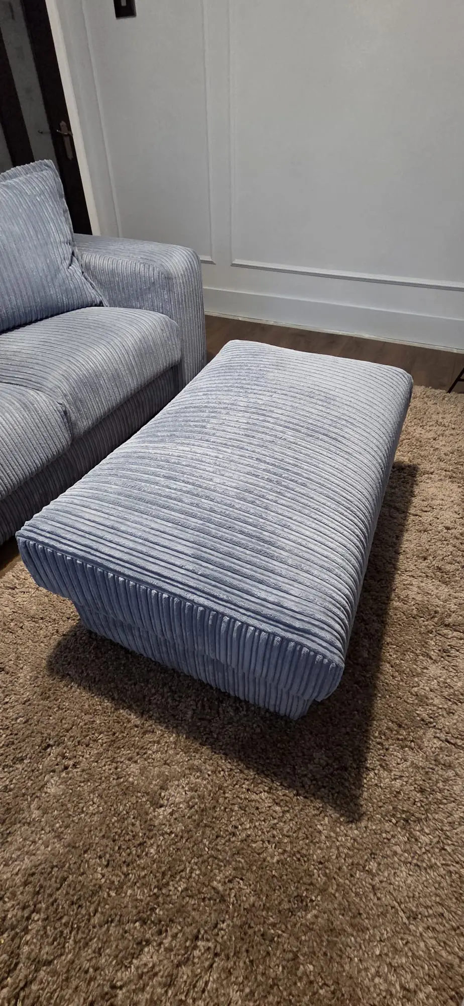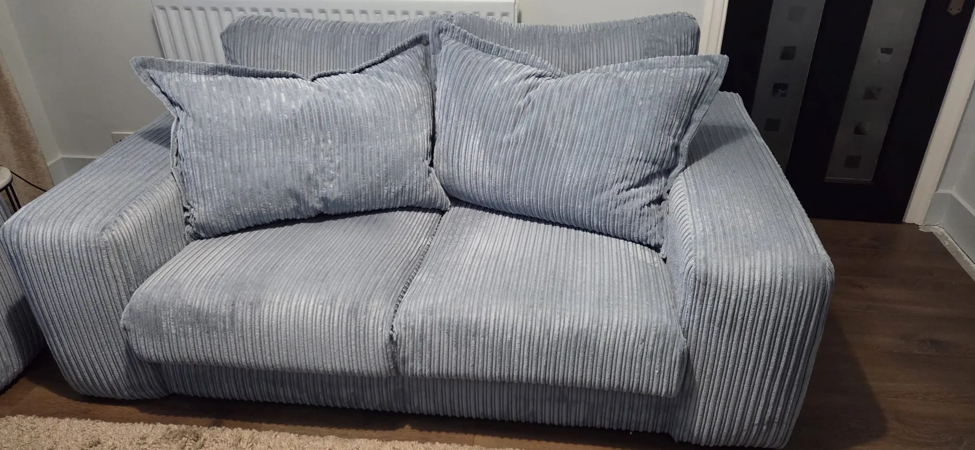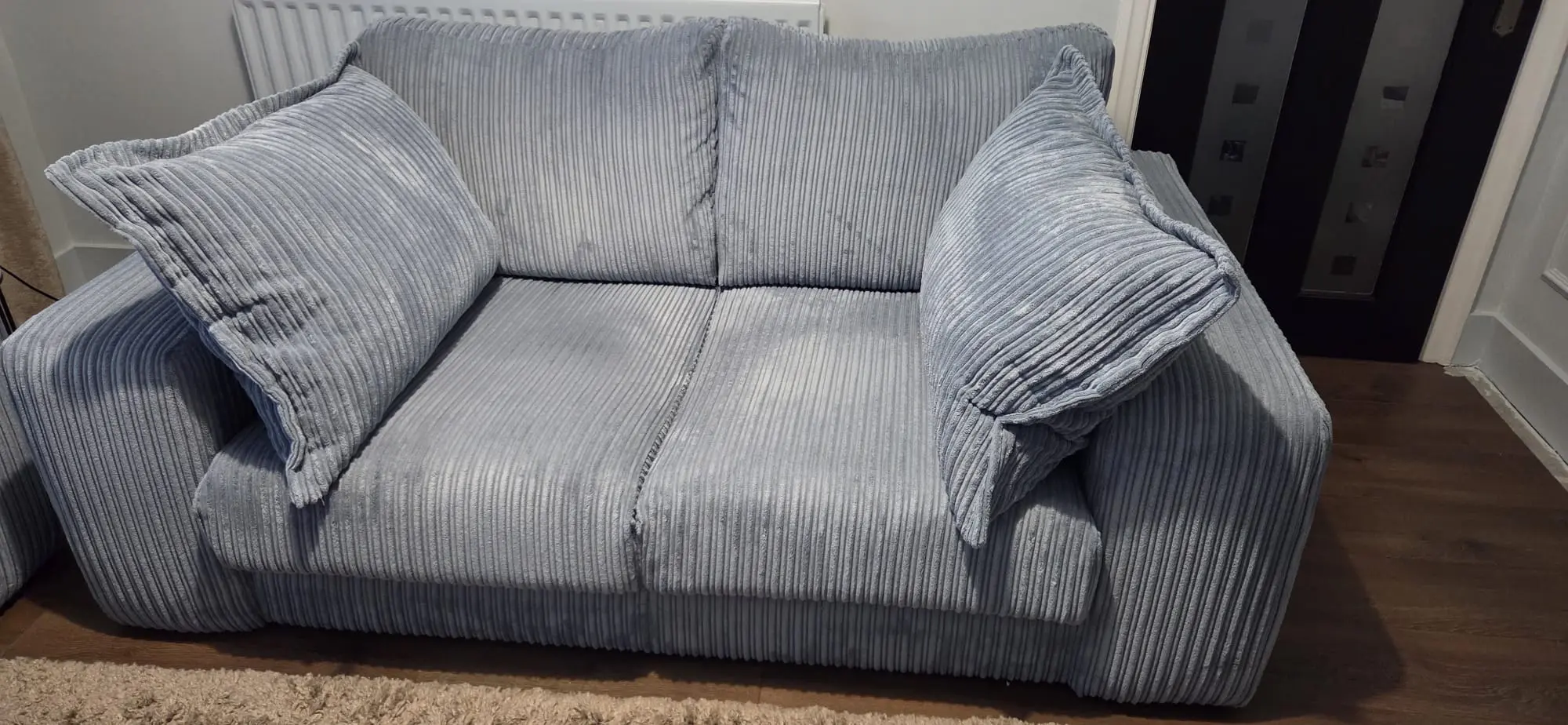 Pale blue “jumbo cord” material as it is decribed by DFS. Just under 1 year old, bought new. In immaculate condition – smoke and pet free home, no rips, stains, marks etc.