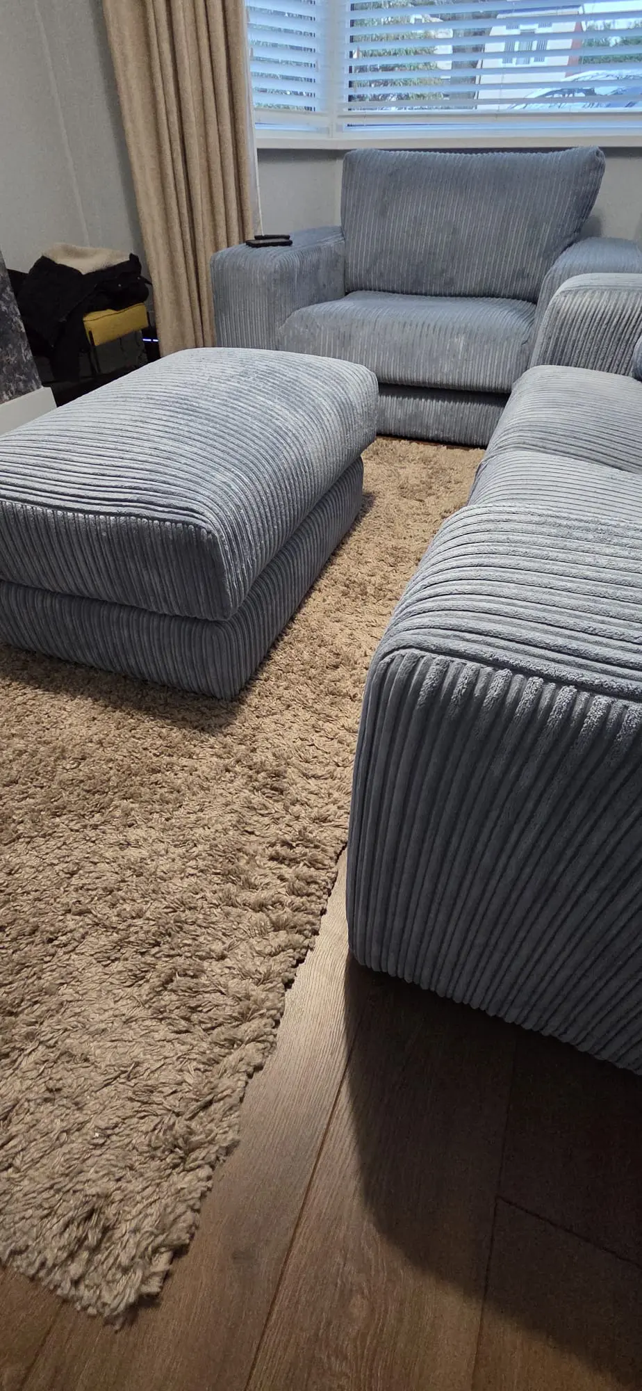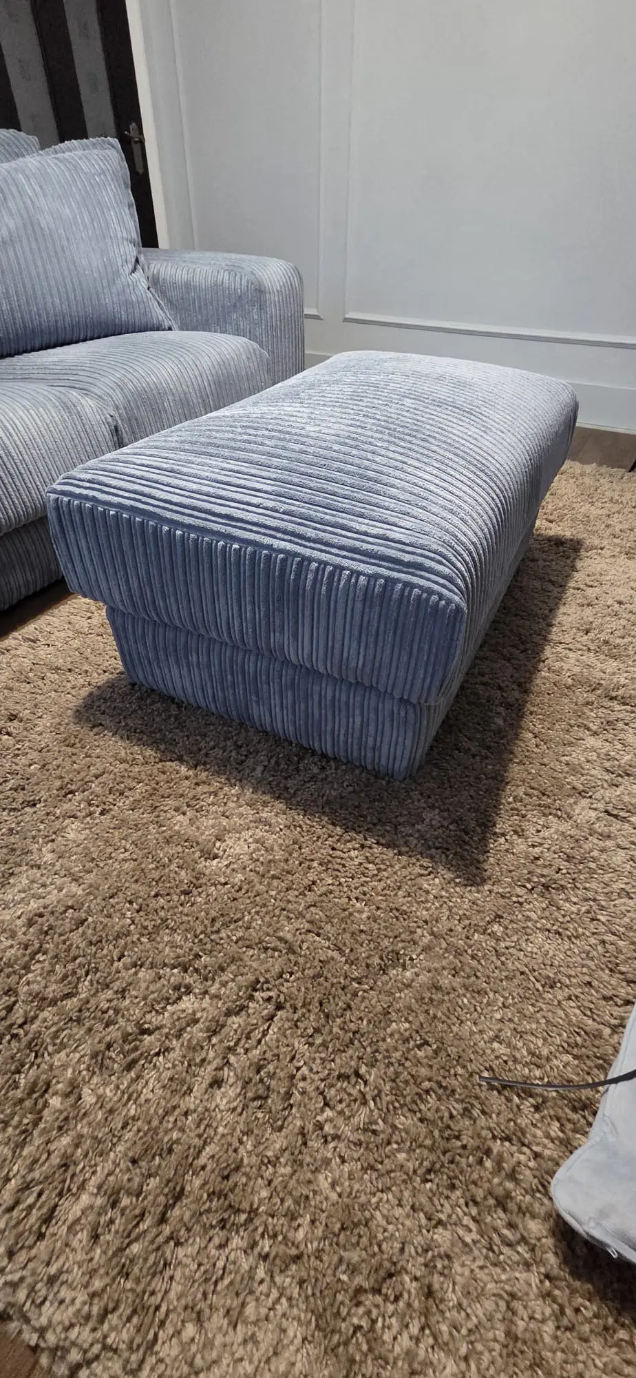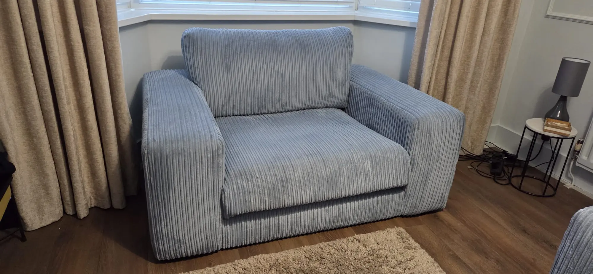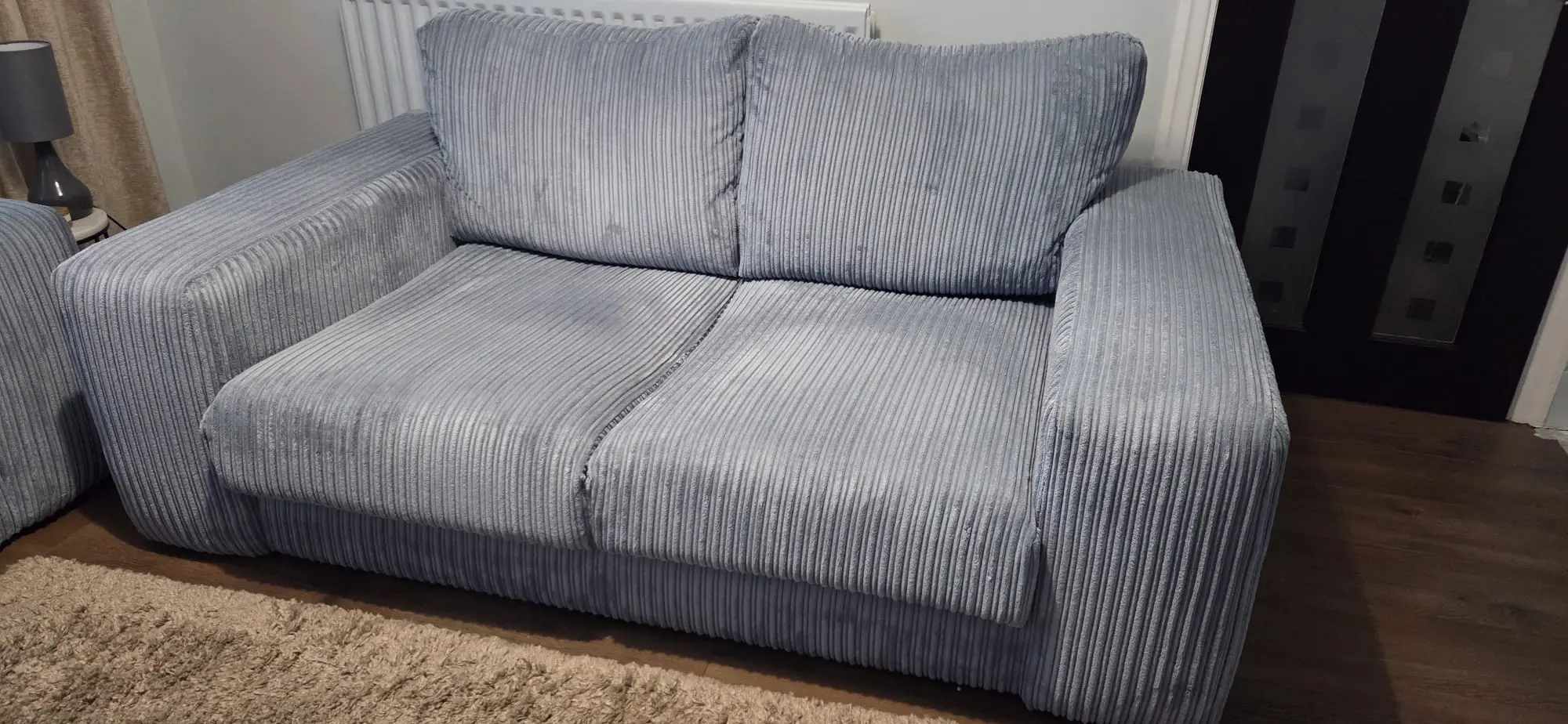 Pale blue “jumbo cord” material as it is decribed by DFS. Just under 1 year old, bought new. In immaculate condition – smoke and pet free home, no rips, stains, marks etc.