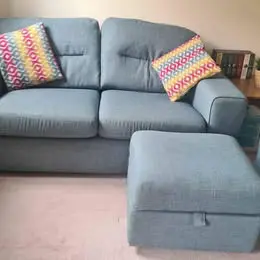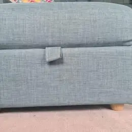 2x Large DFS Sky Blue Sofas with upgraded memory foam cushions and oak colour feet (removable feet). & 1 DFS Sky Blue Storage Foot Stool.