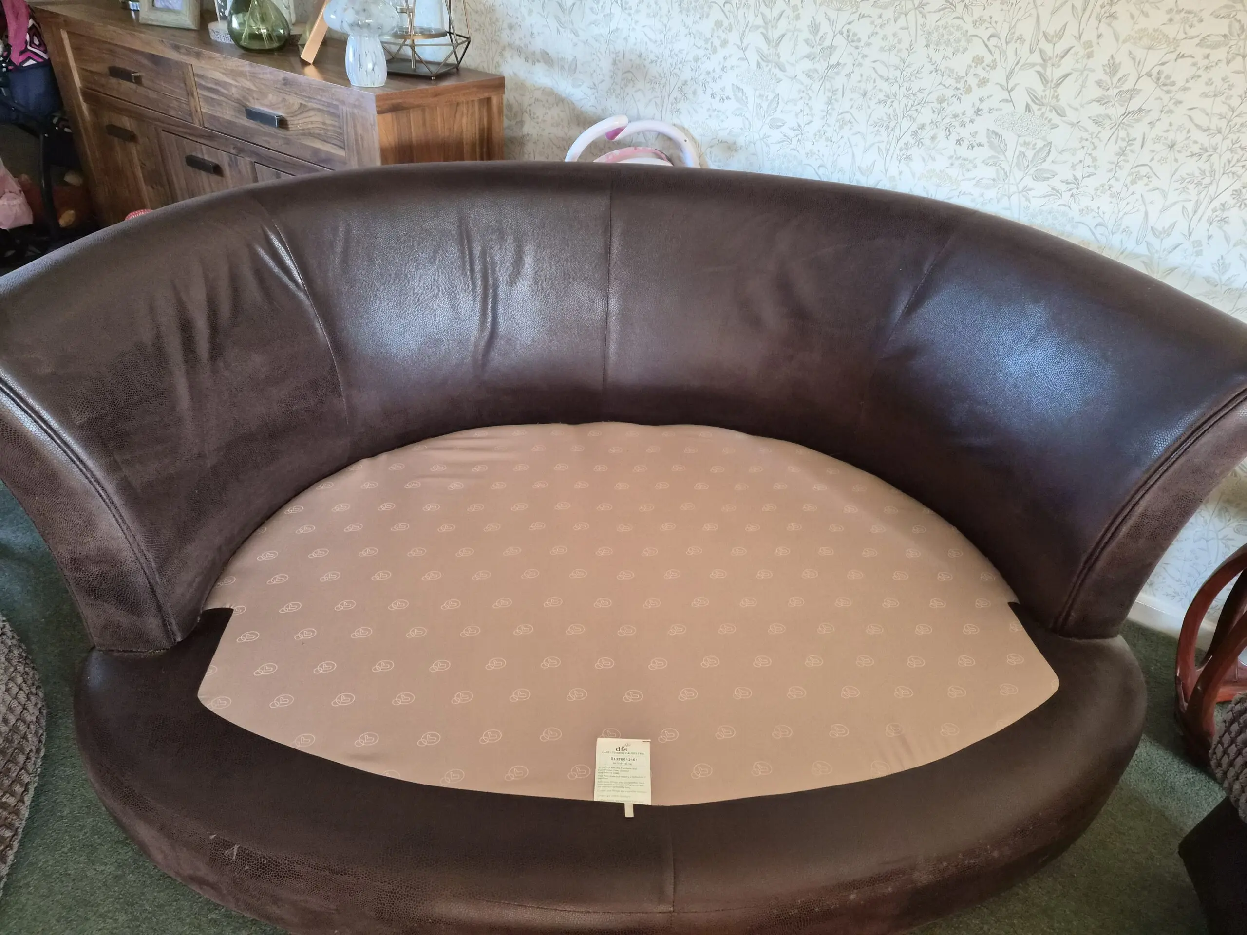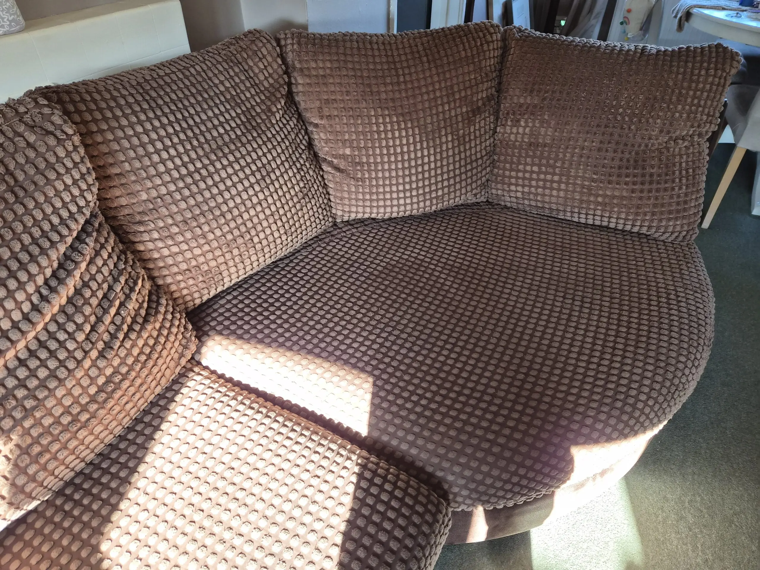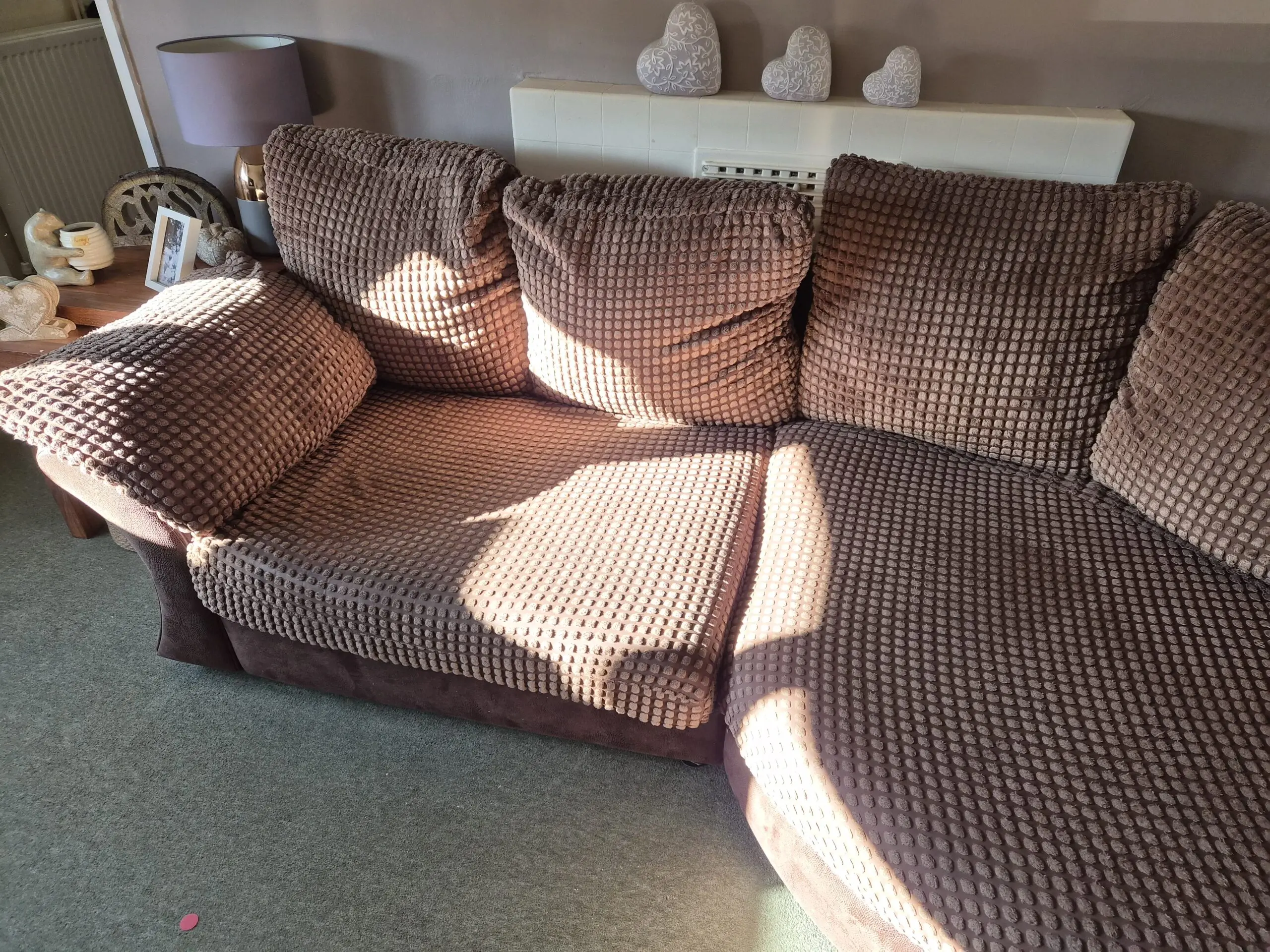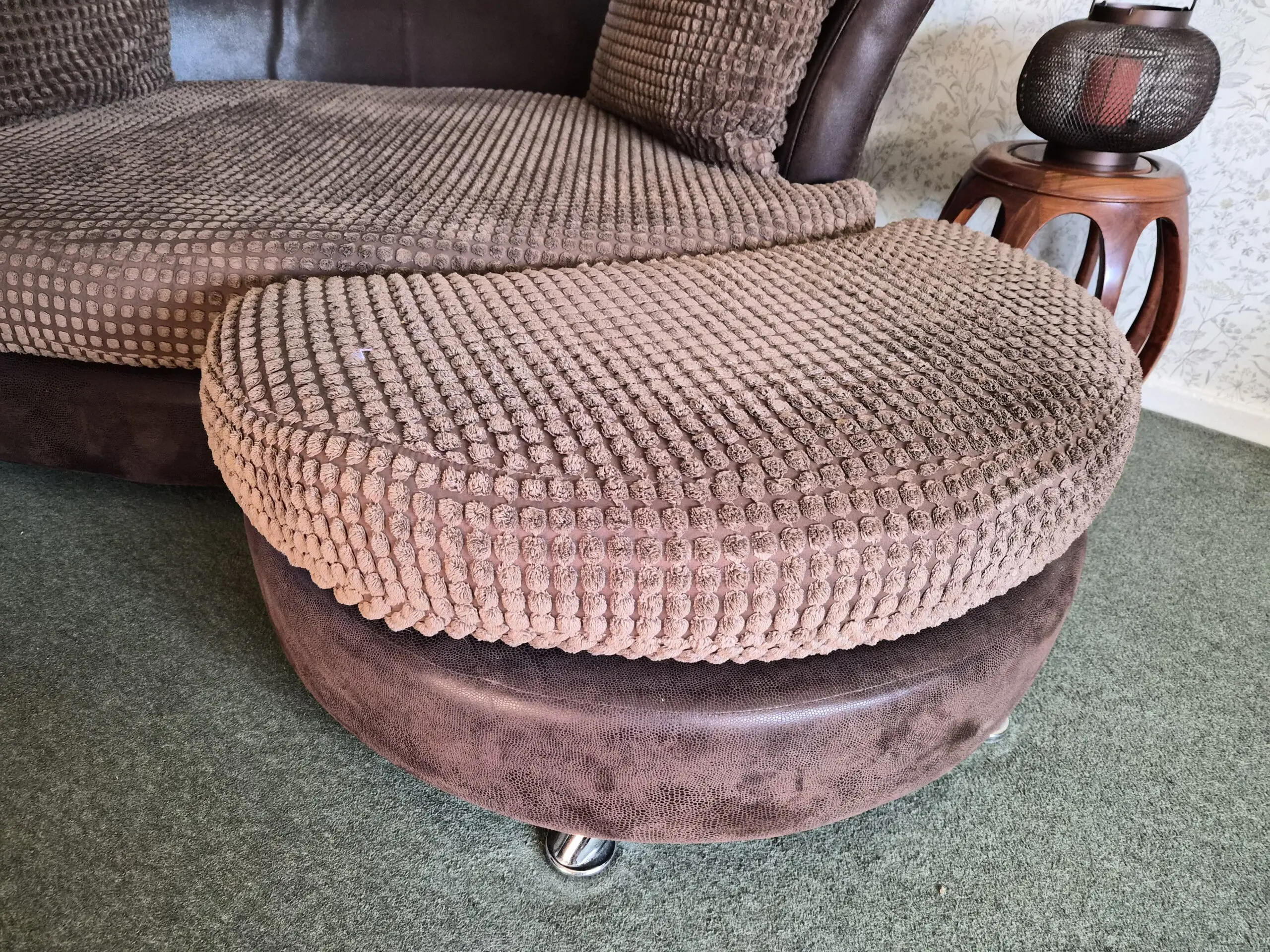 Main sofa splits in two. Sep chair and footstool. Sofas includes coshoins.