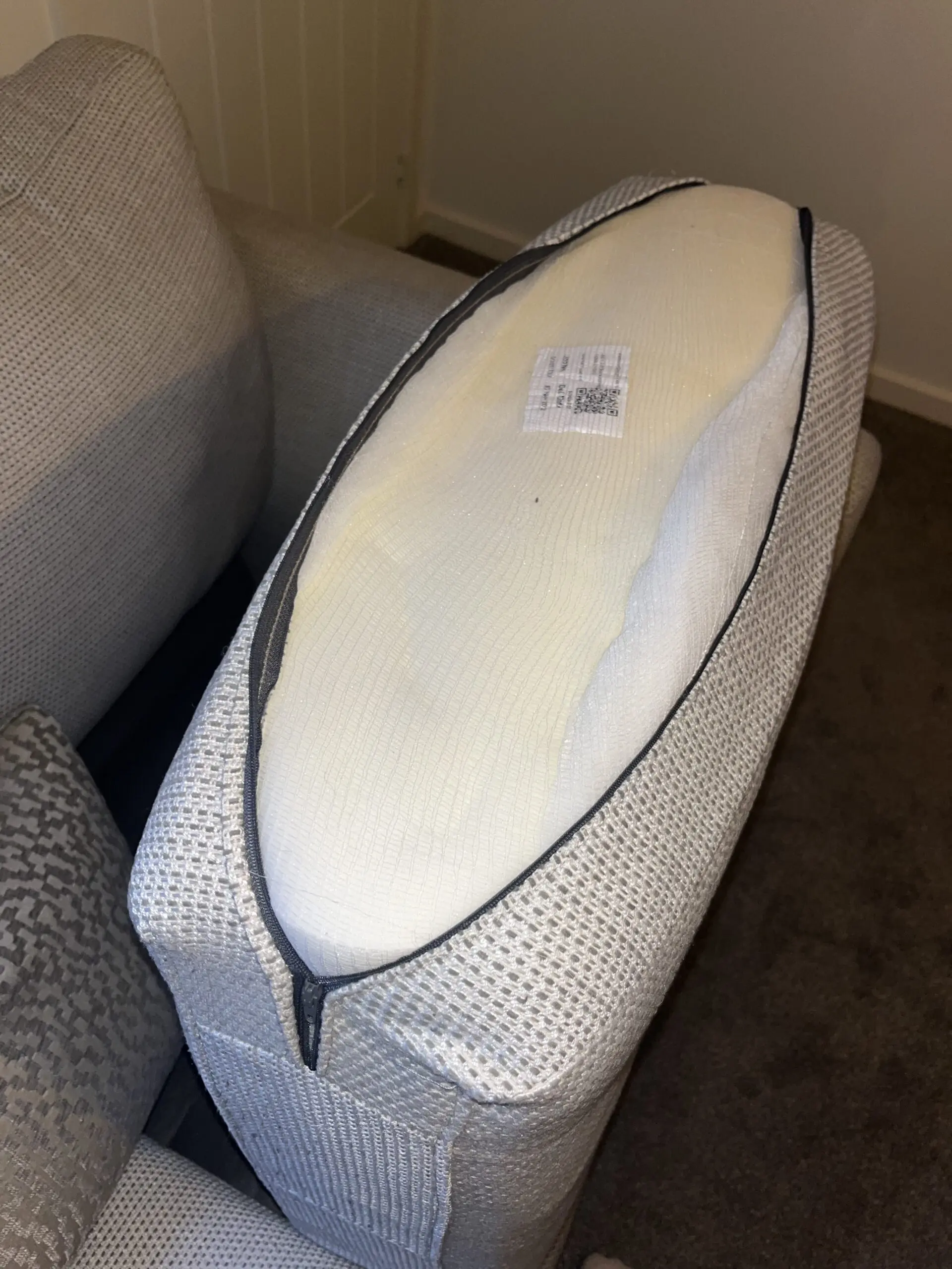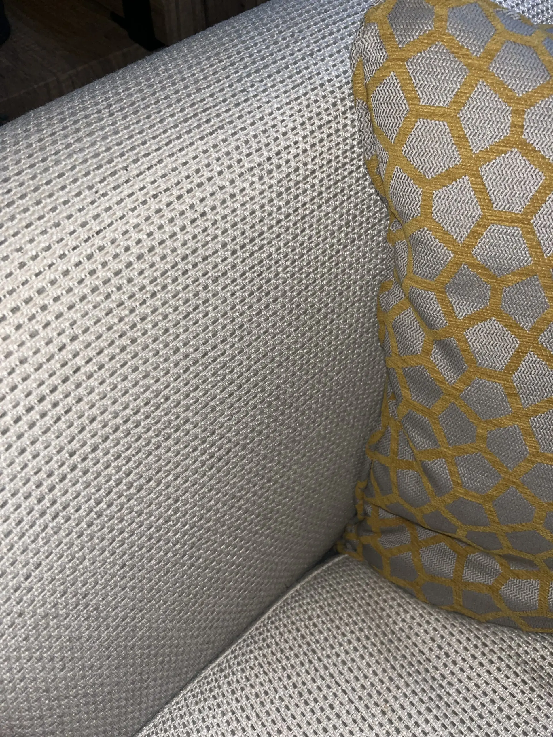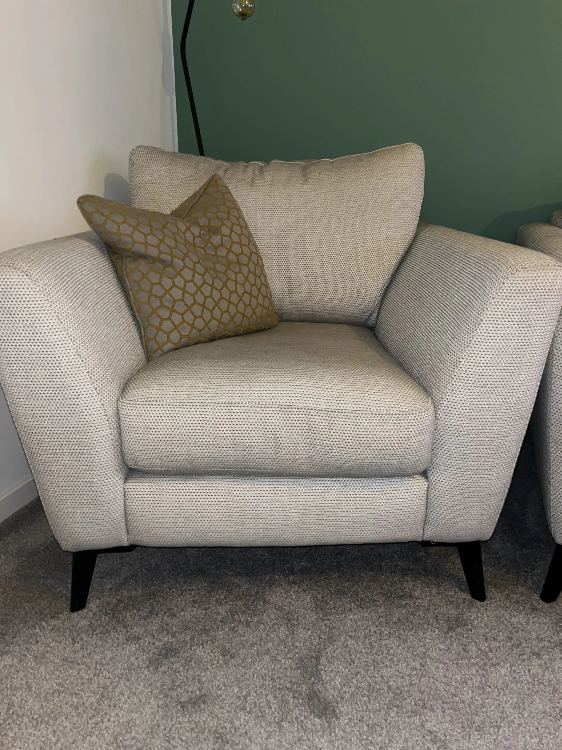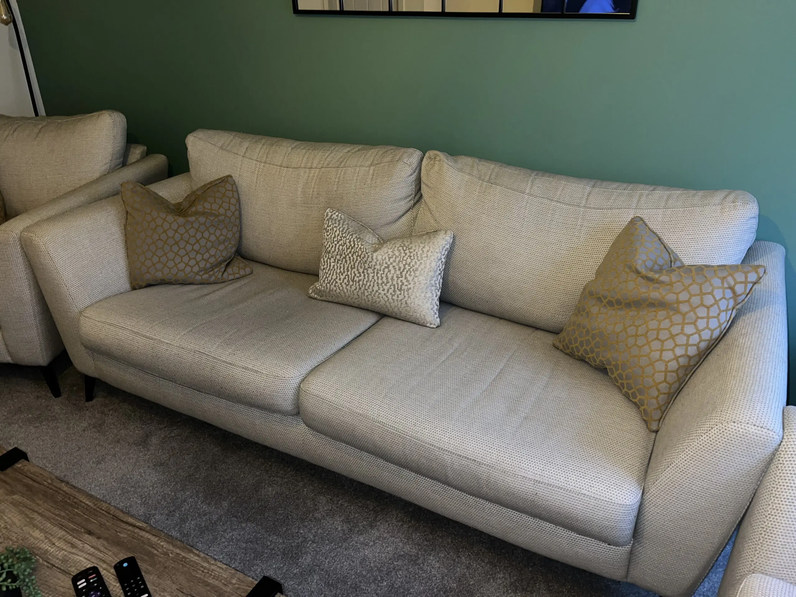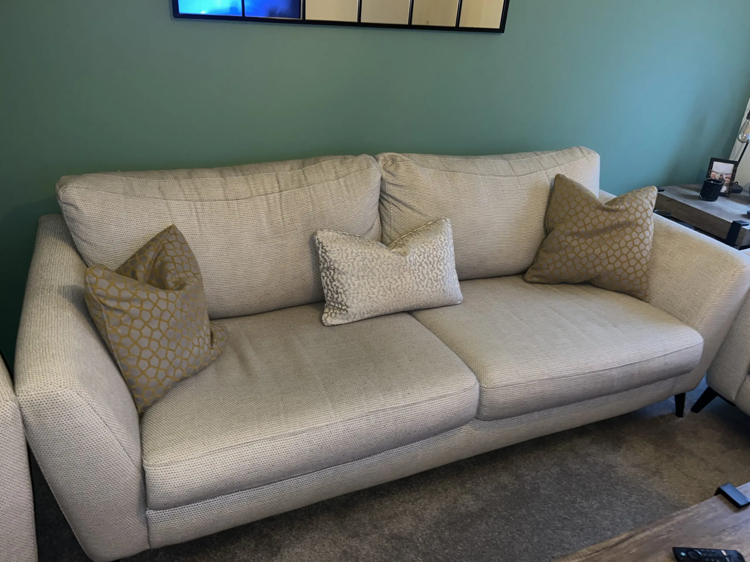 3 seater, 2 seater, armchair and footstool from the DFS Sophia range. Colour combination no longer available on their website. Cream with grey stitching and the orange and grey cushions and footstool. Black metal feet. Very good condition- 2 seater, arm chair and footstool barely ever used. One base cushion has a damaged zip from washing the covers but easily fixable