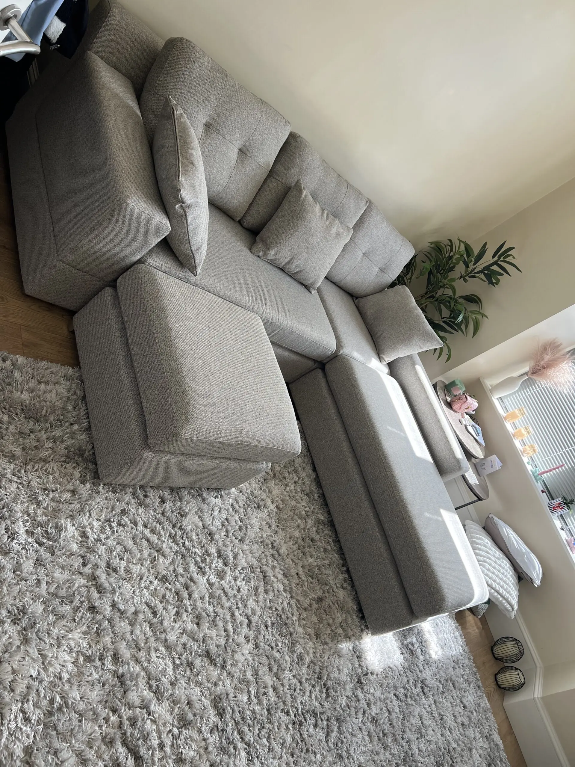 Lounger piece spins to sit horizontally across the bottom of the sofa – teamed with the footstool, this creates a double sized bed