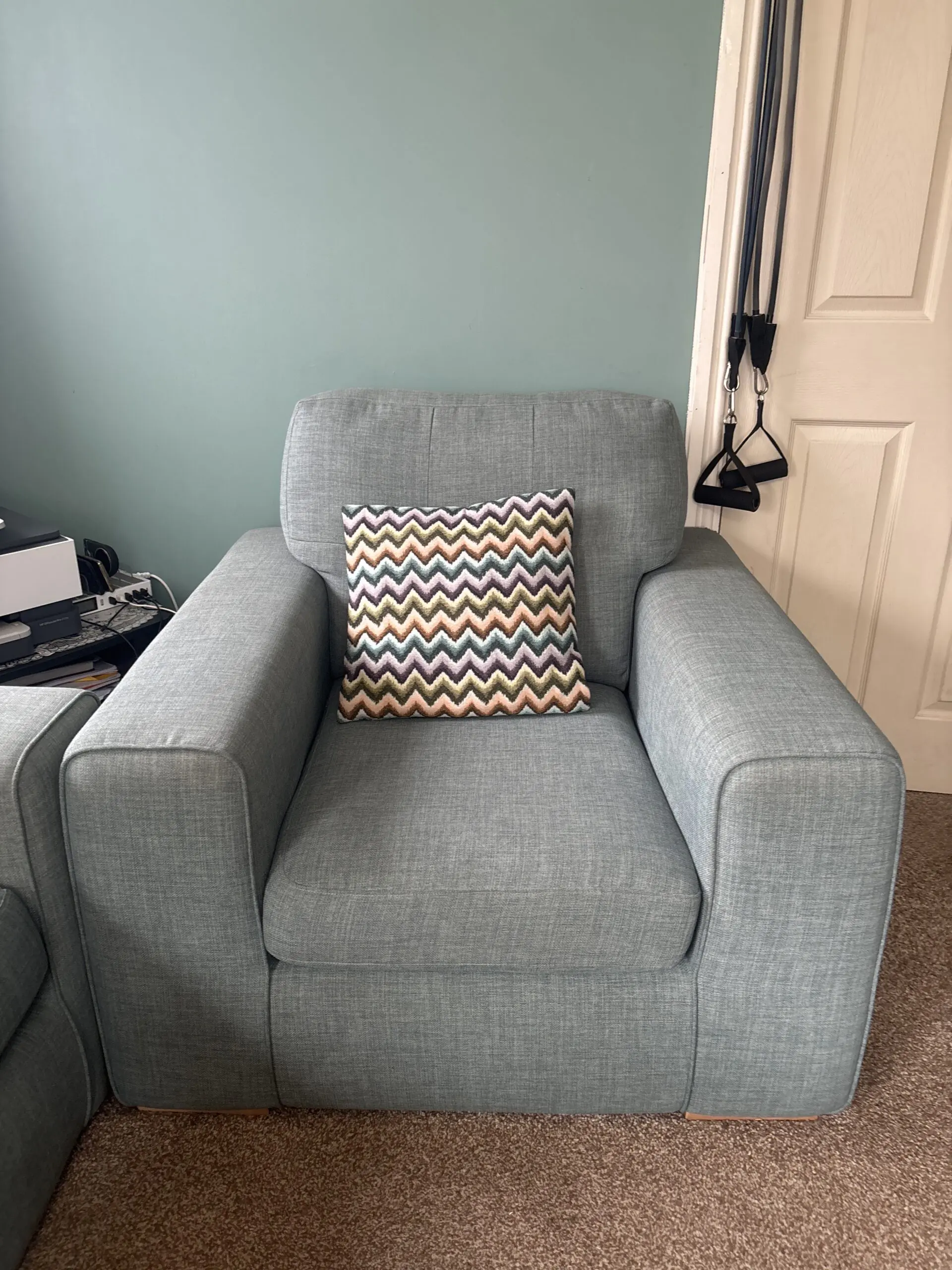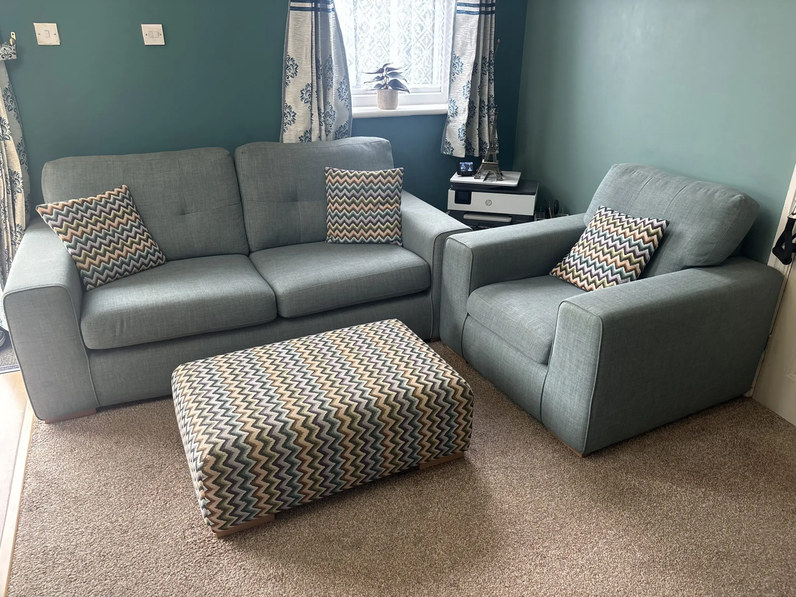 Beautiful teal green sofa set in great condition, perfect for adding a pop of color and comfort to any living space. The set includes a cozy 2-seater sofa, a matching armchair, and a comfortable footstool.
